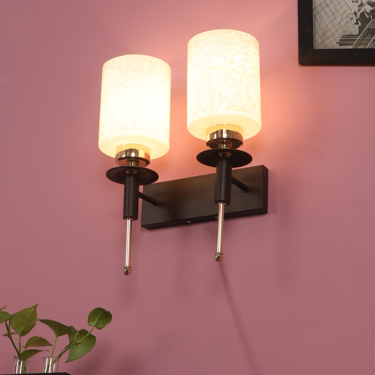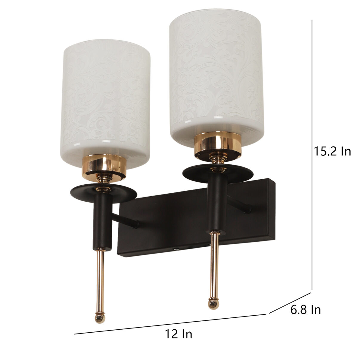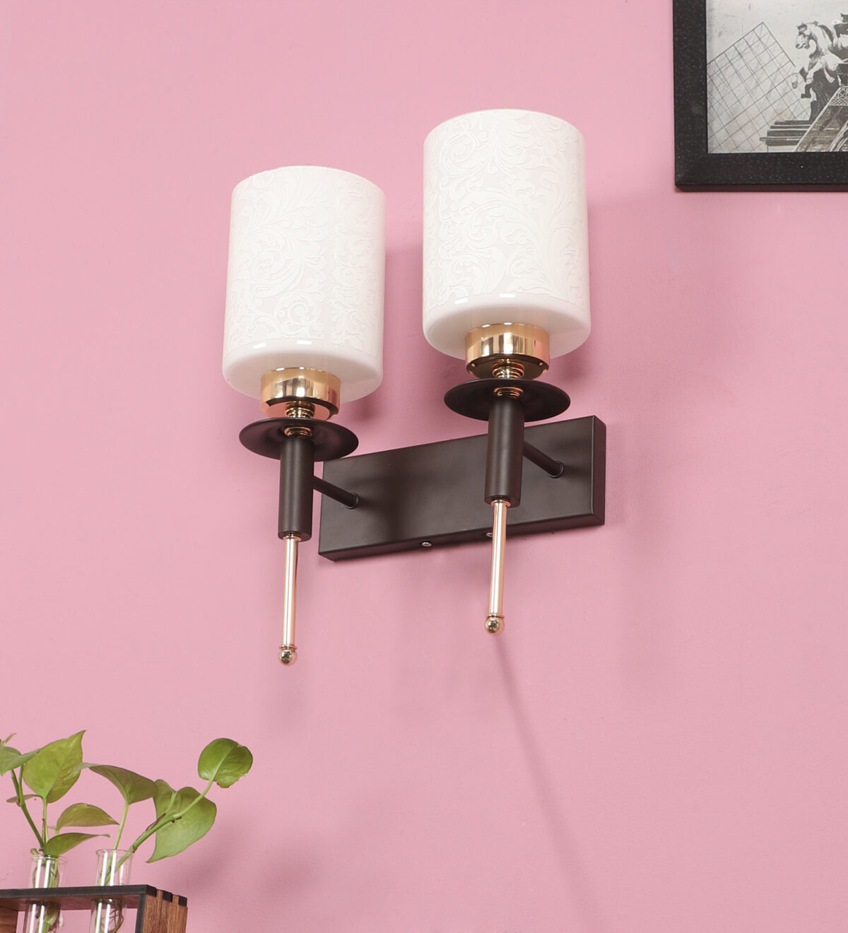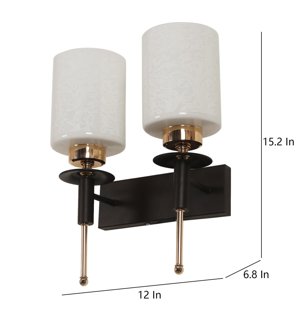 Brown wood finish, double wall light with a white cylinderical printed glass shades. It is maintenance free, comes with an E27 holder, only the change of lamp is required, which is available locally everywhere. Application includes both residential and commercial premises wherever it matches with your interiors. Can be customized as per requirement. LAMPS NOT INCLUDED.