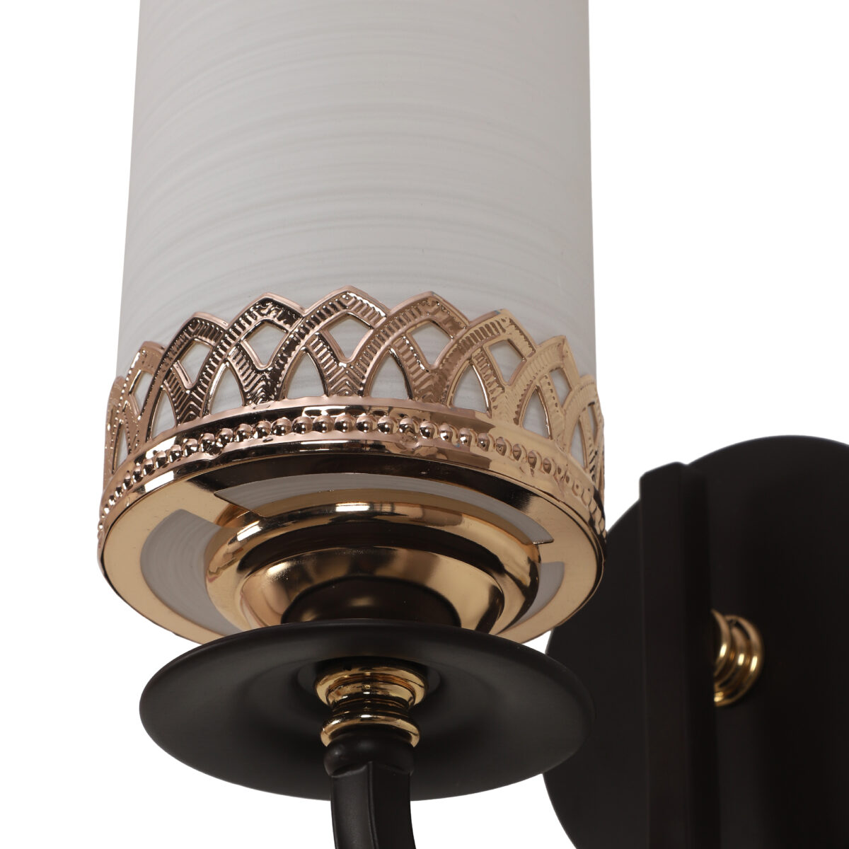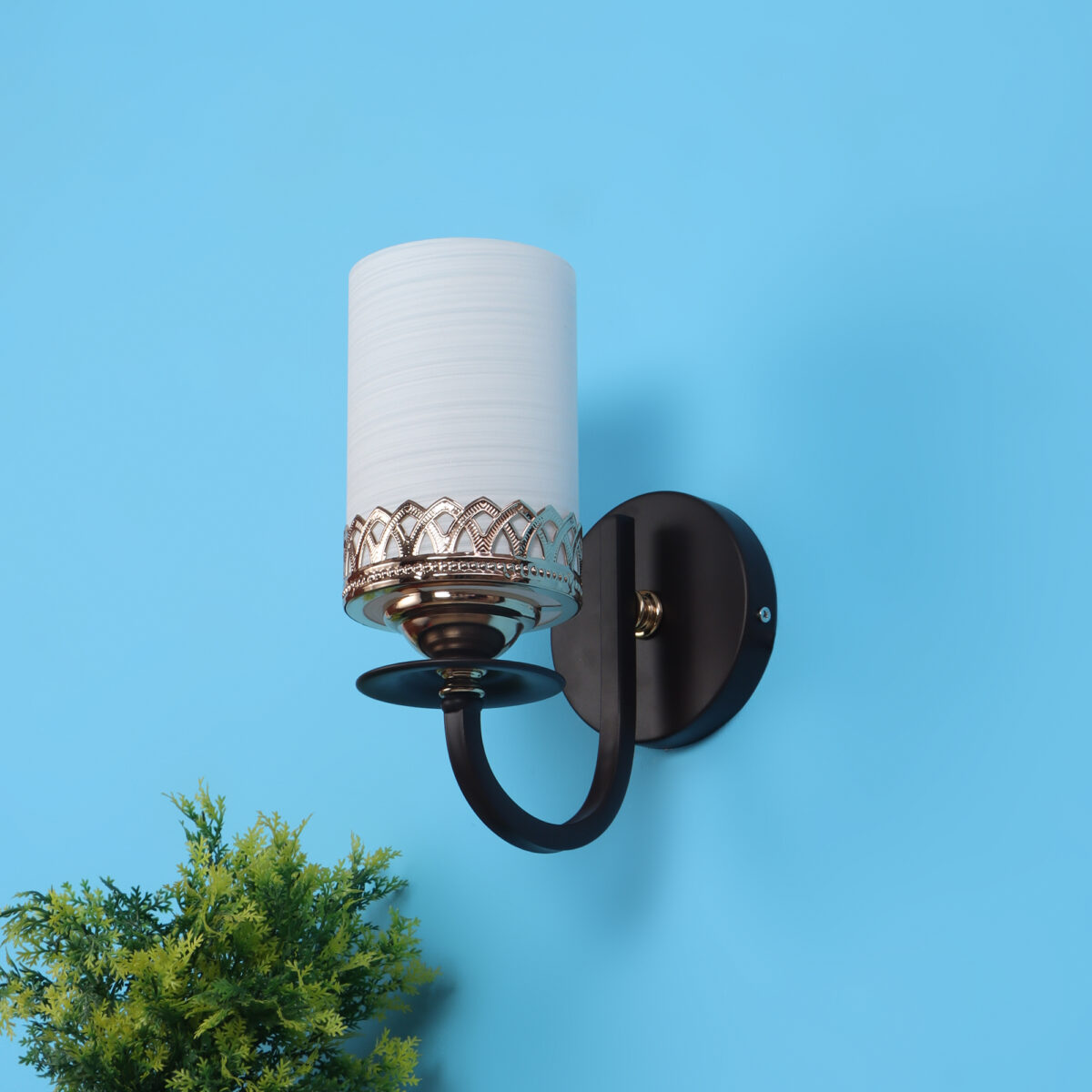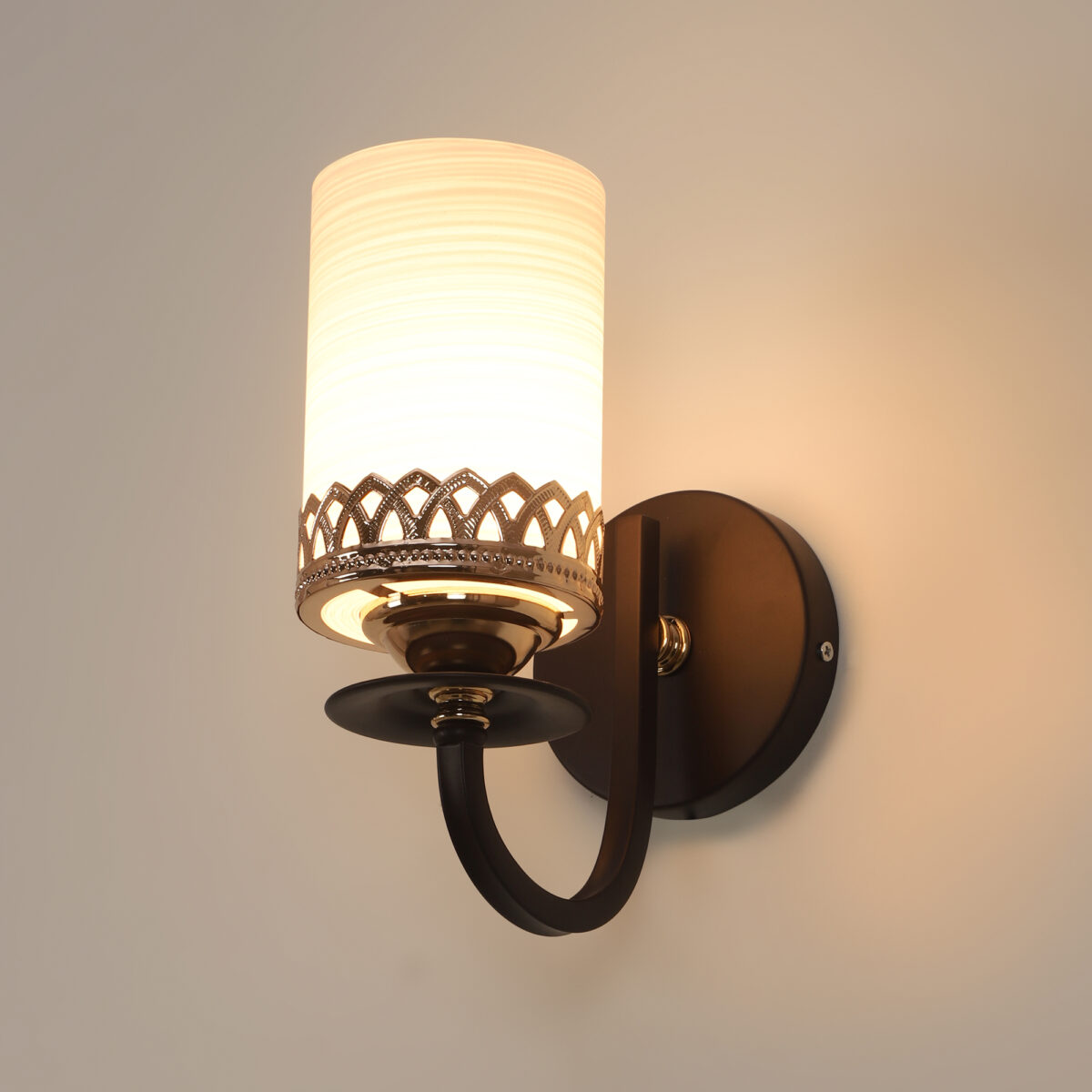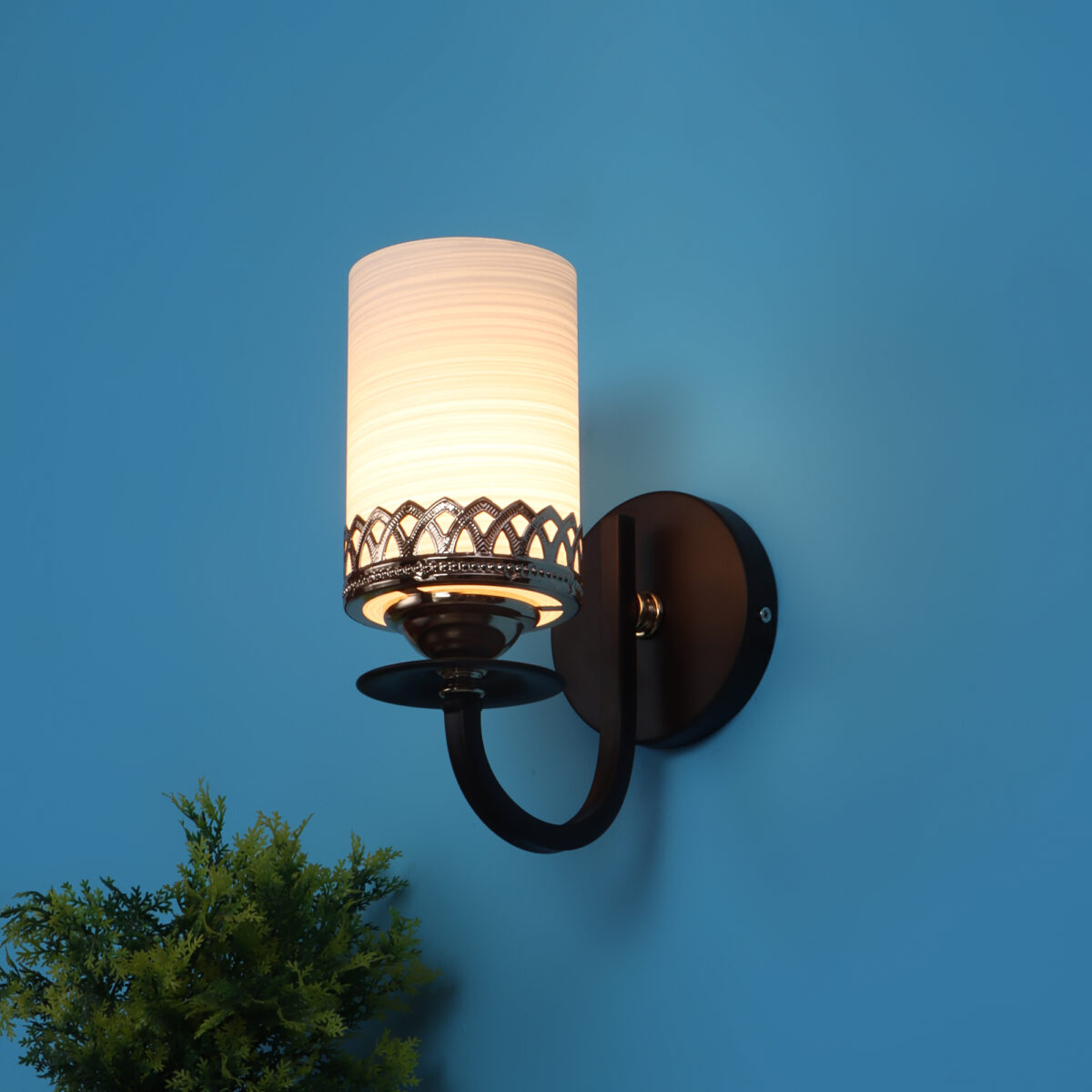 Dark brown finish single wall light having cylinderical white glass having self textured design mounted on a designer frame made of mild steel. It is maintenance free. It is easy to remove glass and wash it. Comes with an E27 holder, only the change of lamp is required, which is available locally everywhere. Application includes both residential and commercial premises wherever it matches with your interiors. Can be customized as per requirement, LAMP NOT INCLUDED.