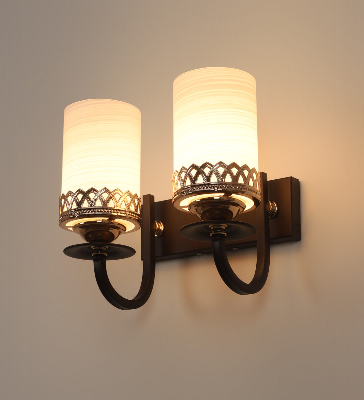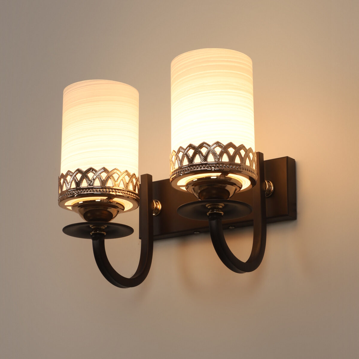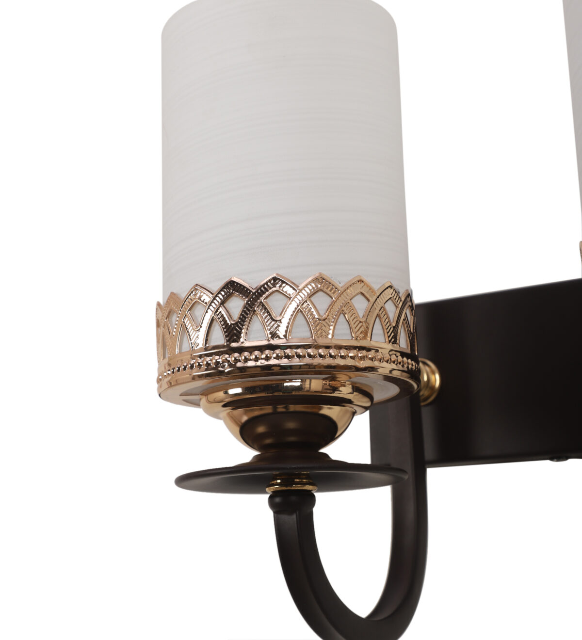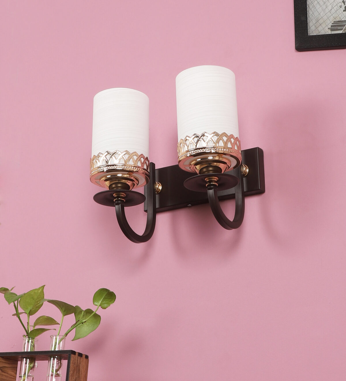 Dark brown finish single wall light having cylinderical white glass having self textured design mounted on a designer frame made of mild steel. It is maintenance free. It is easy to remove glass and wash it. Comes with an E27 holder, only the change of lamp is required, which is available locally everywhere. Application includes both residential and commercial premises wherever it matches with your interiors. Can be customized as per requirement, LAMP NOT INCLUDED.