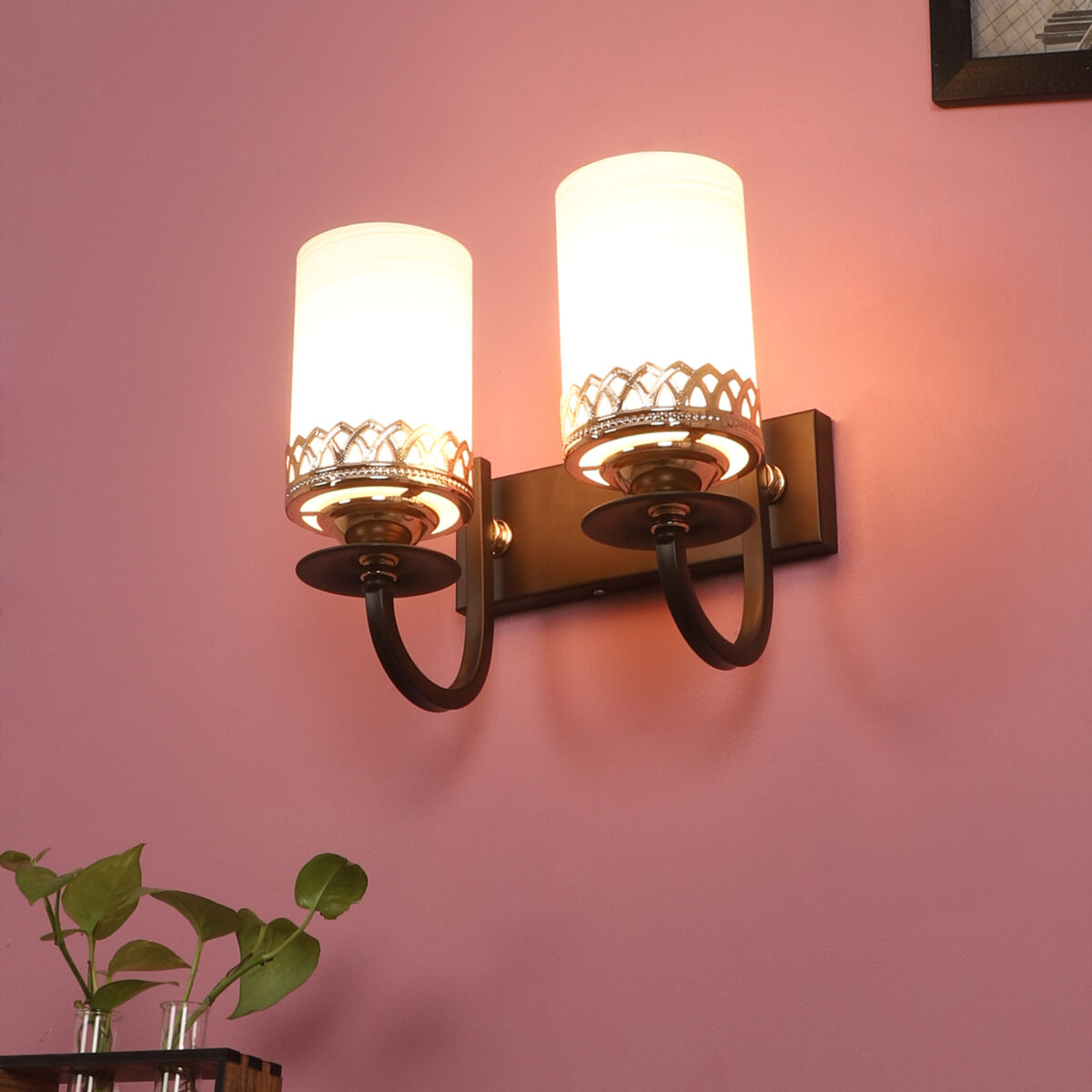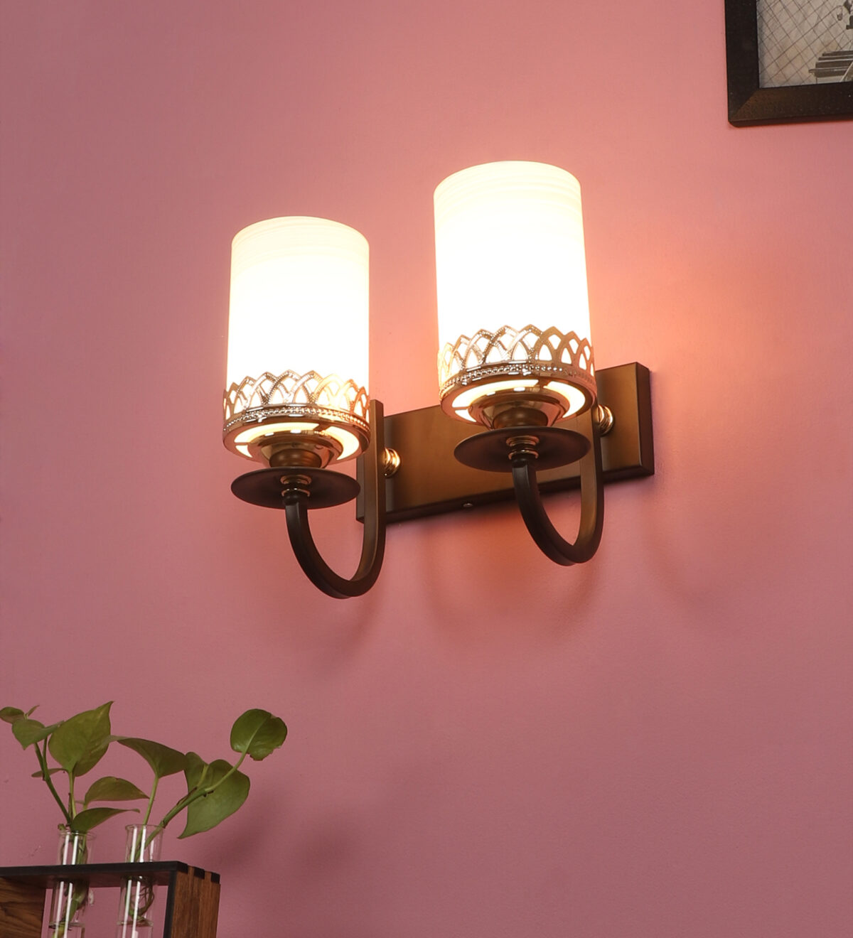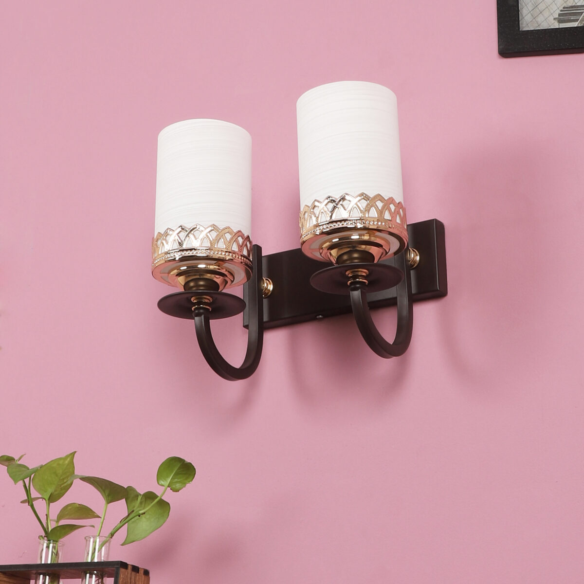 Dark brown finish single wall light having cylinderical white glass having self textured design mounted on a designer frame made of mild steel. It is maintenance free. It is easy to remove glass and wash it. Comes with an E27 holder, only the change of lamp is required, which is available locally everywhere. Application includes both residential and commercial premises wherever it matches with your interiors. Can be customized as per requirement, LAMP NOT INCLUDED.