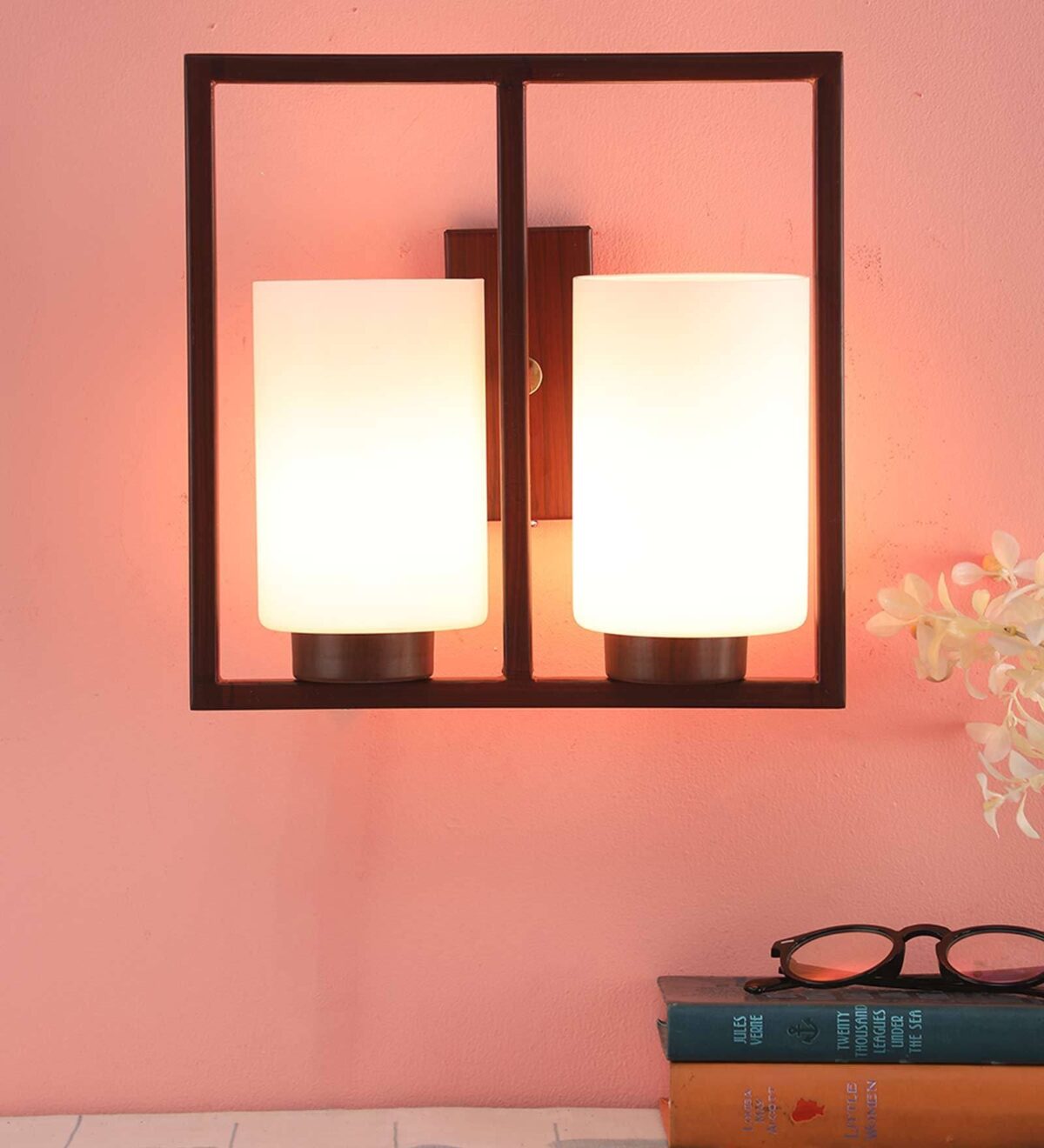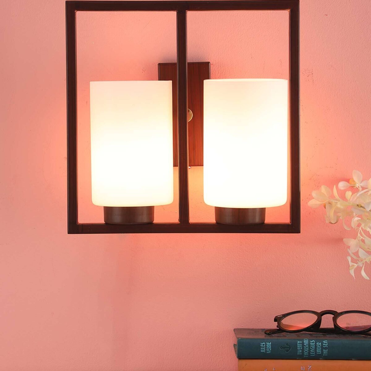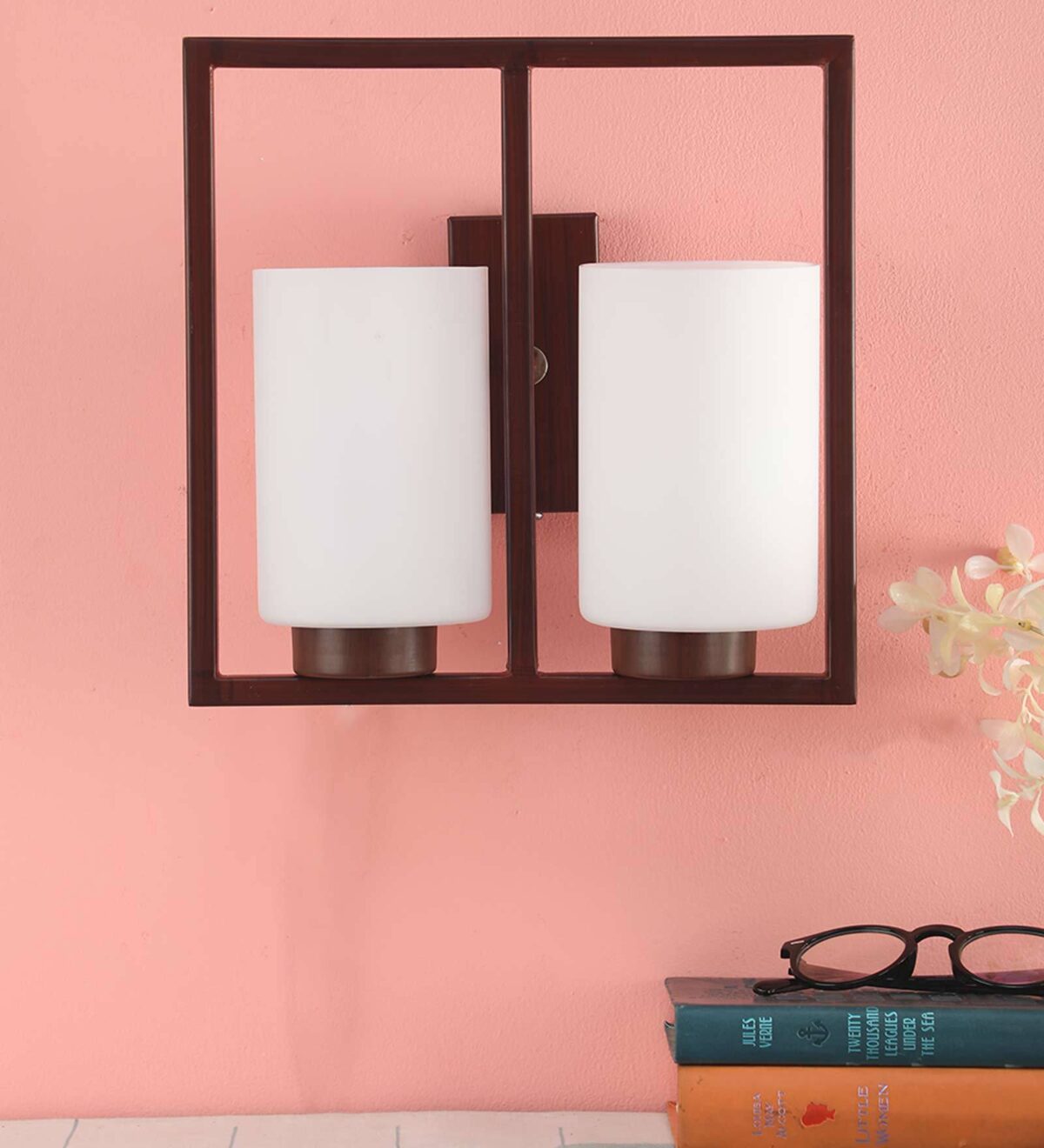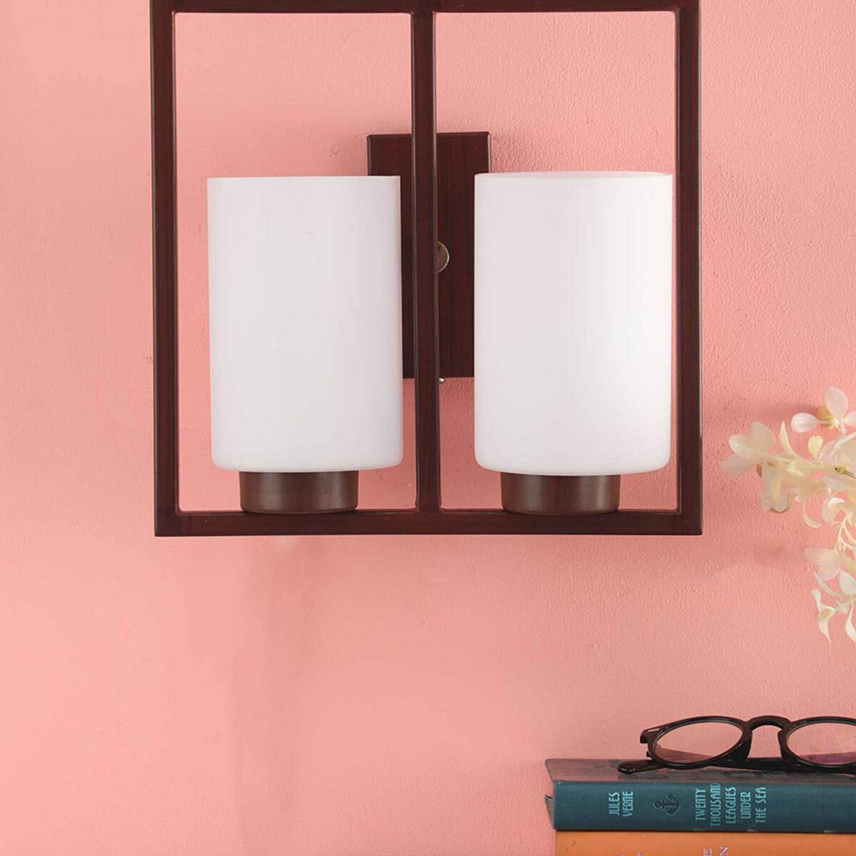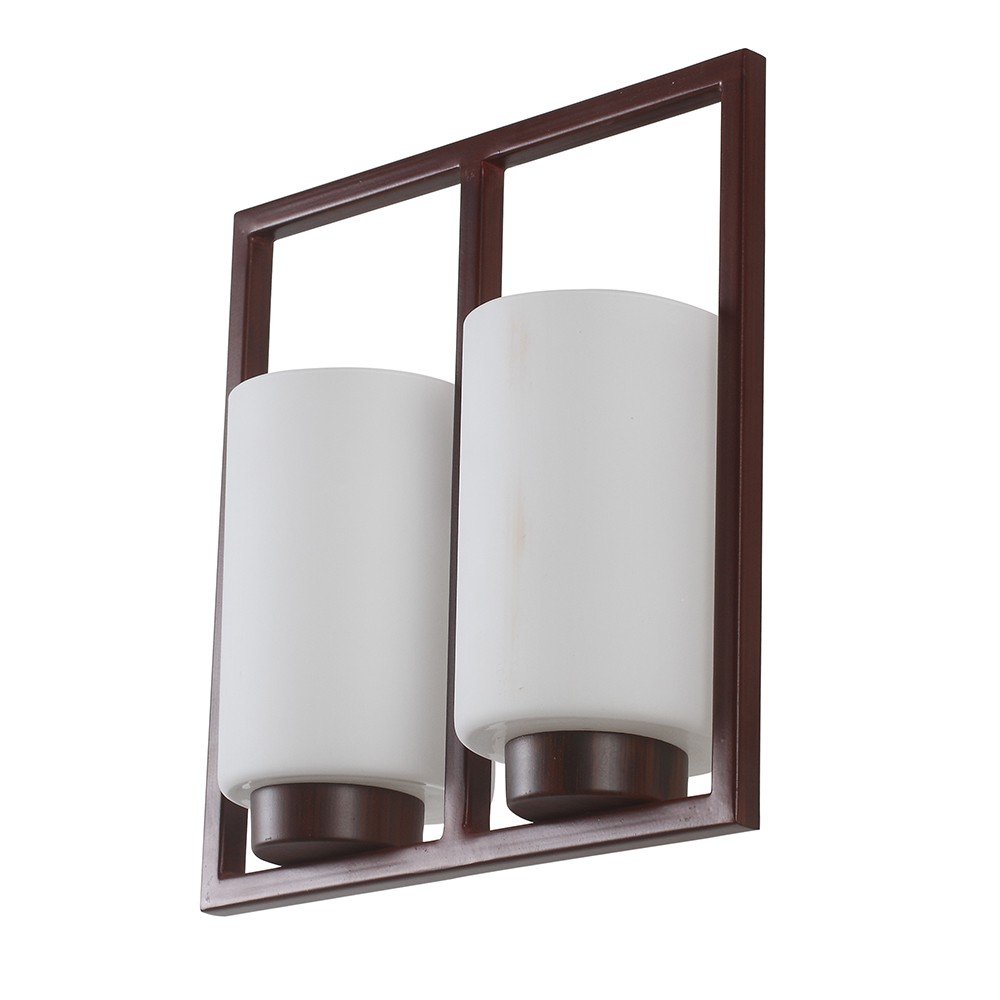 Dark brown (wood) finish double wall light having round, cylindrical white glasses mounted on a designer frame. It is maintenance free, it is easy to remove glass and wash it. Comes with an E27 holder, only the change of lamp is required, which is available locally everywhere. Application includes both residential and commercial premises wherever it matches with your interiors. Matching single wall light code – WL2209. Matching chandelier code – CH352. Can be customized as per requirement in case of bulk quantities. This along with its variants are the best selling products in our catalogue. Lamp not included.