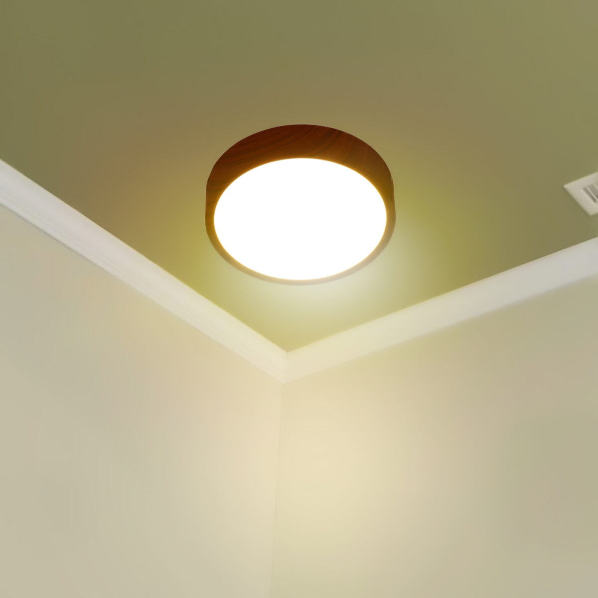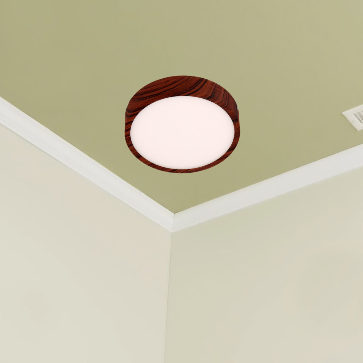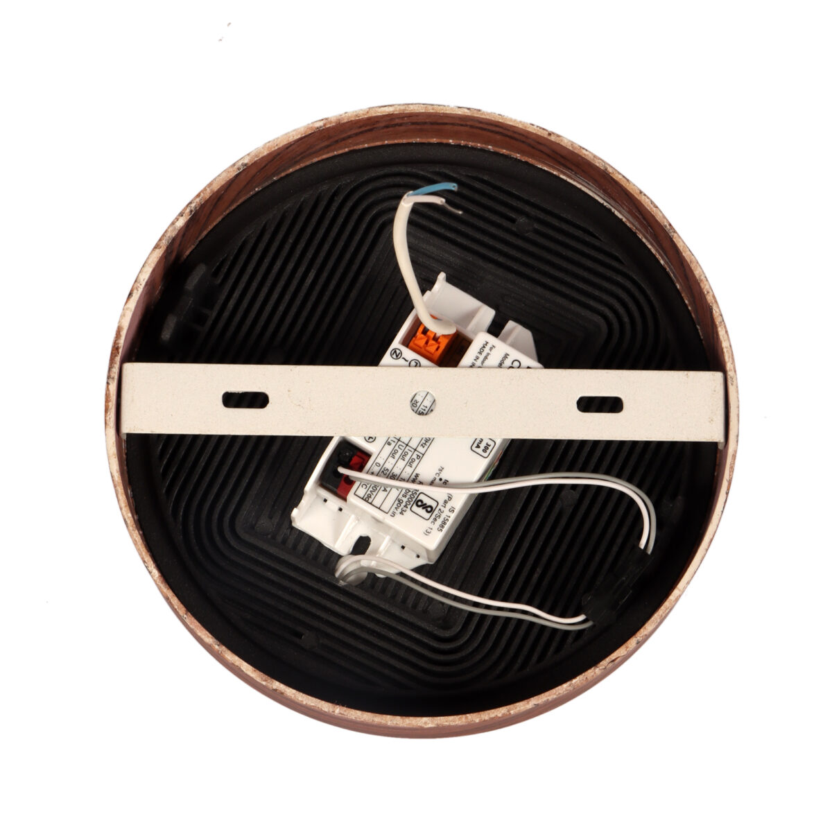 Brown (wood) finish round LED surface seiling light with warm white (yellow) light output. Can be used both indoors and outdoors. Also avalable in black finish. Please scroll down to see matching products.