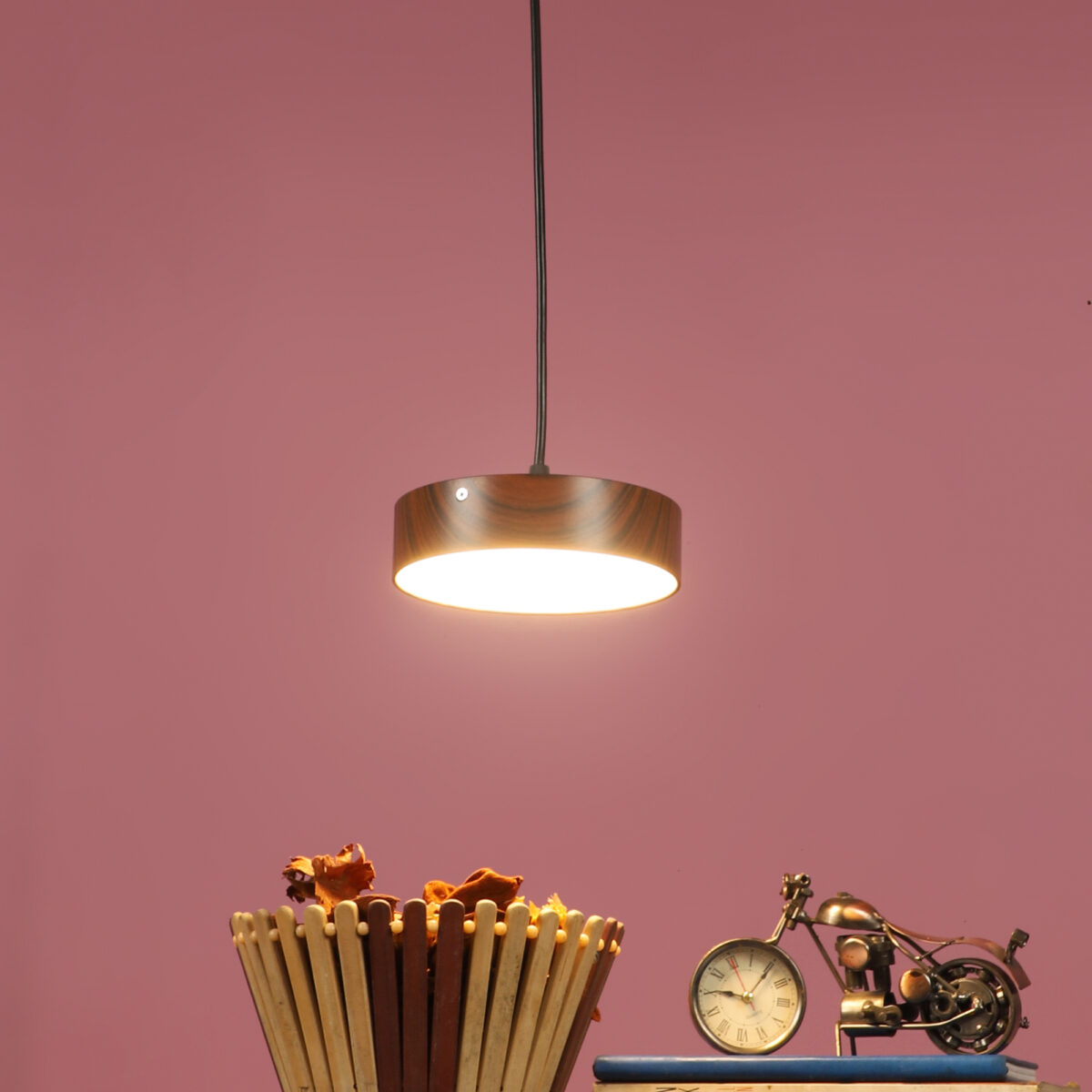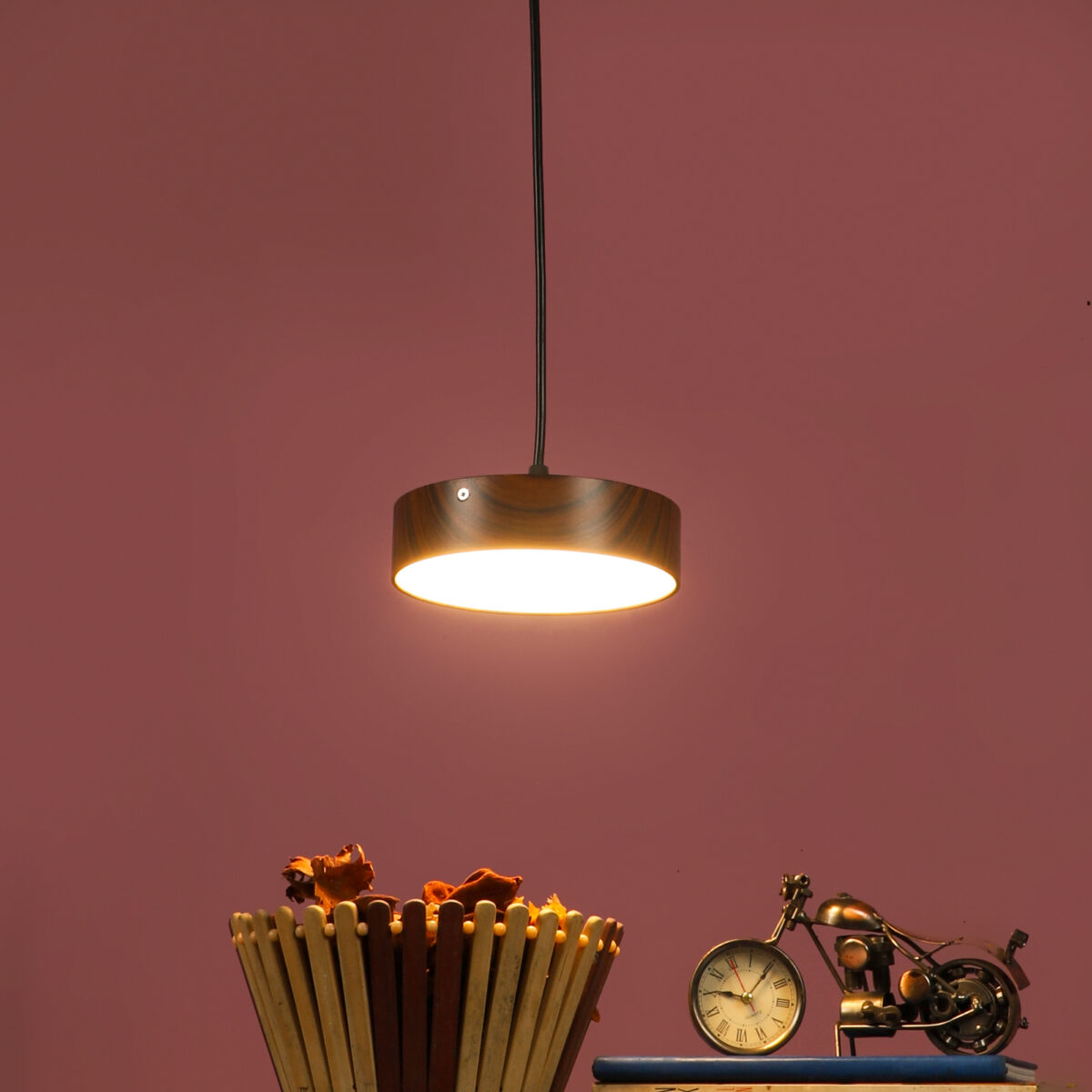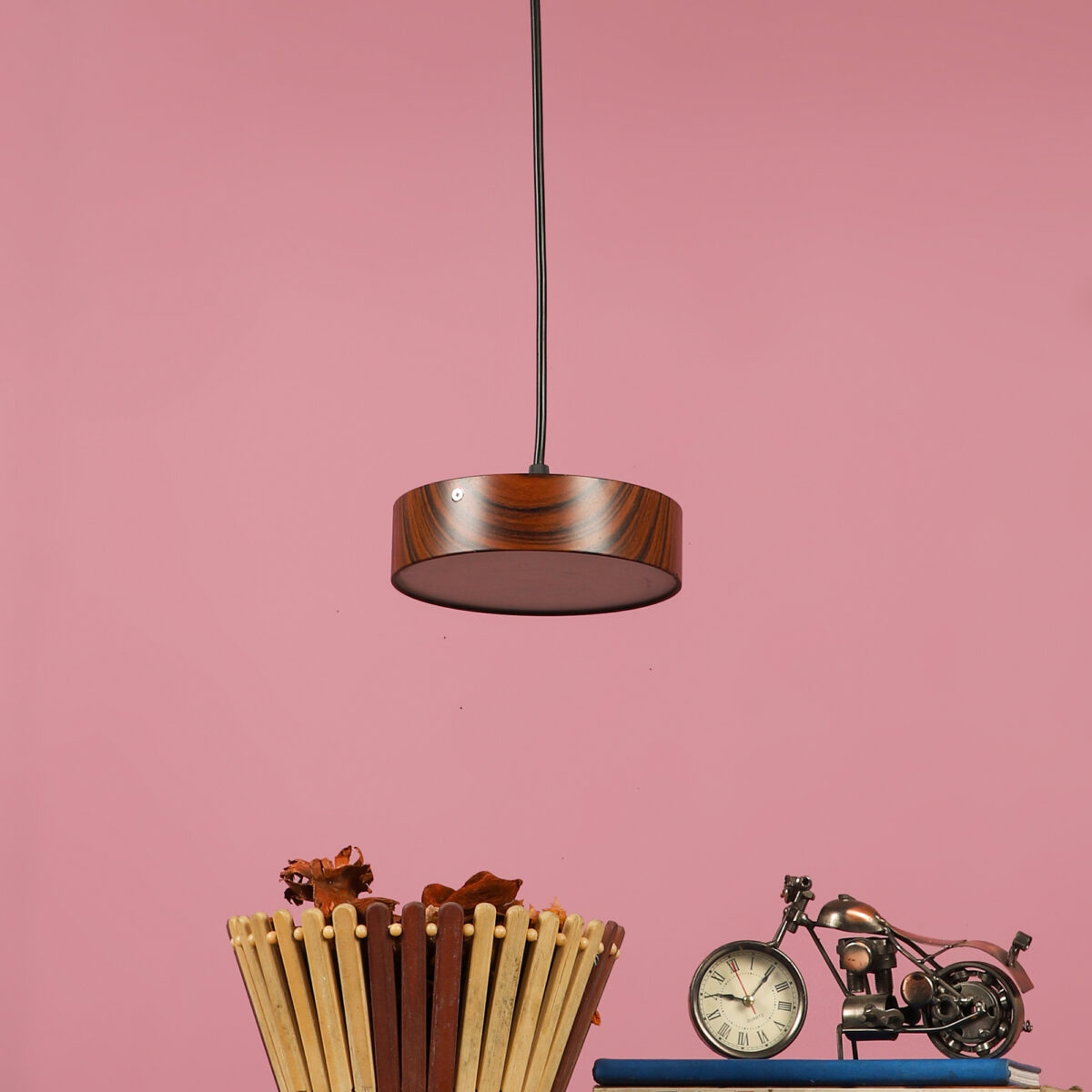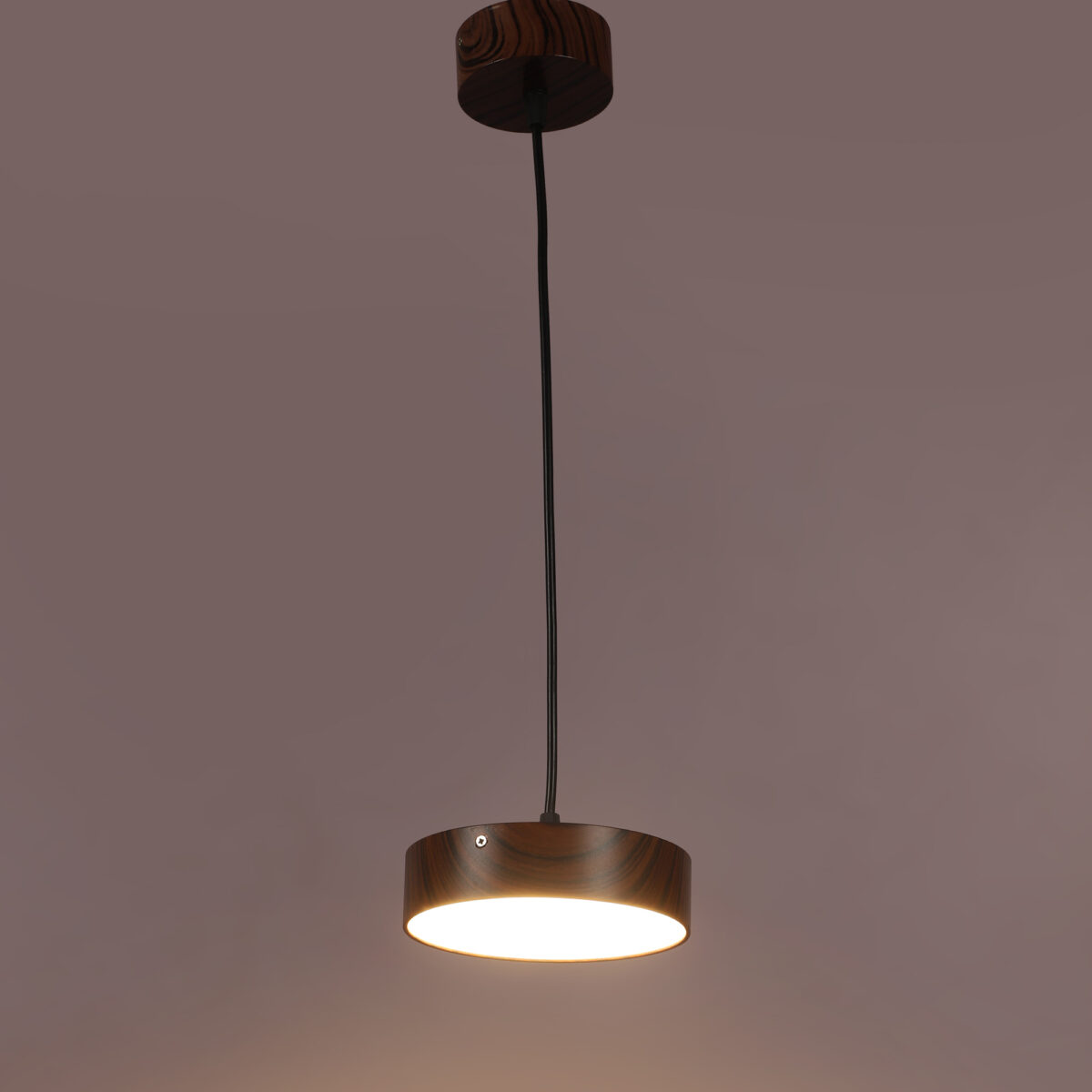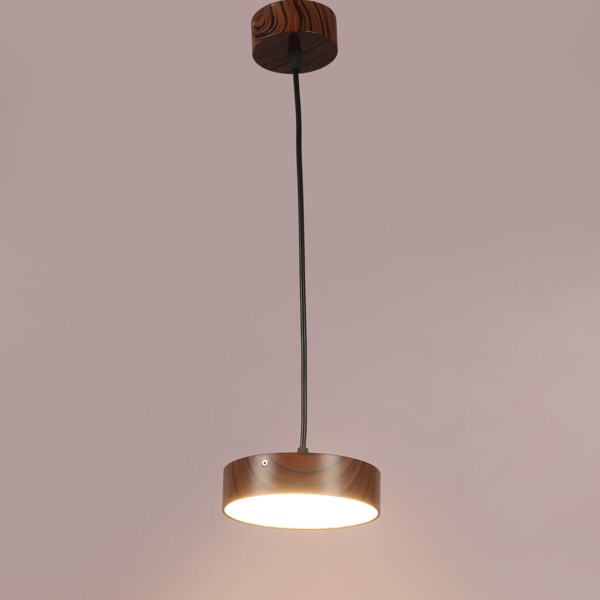 Brown (wood finish with grains), modern, round, 18W single LED hanging light having high quality LED and driver with high success rate having less than 0.5% replacement. It is one of the best selling product. . The suspension can be adjusted at time of installation to the desired height. Application includes both residential and commercial premises wherever it matches with your interiors.