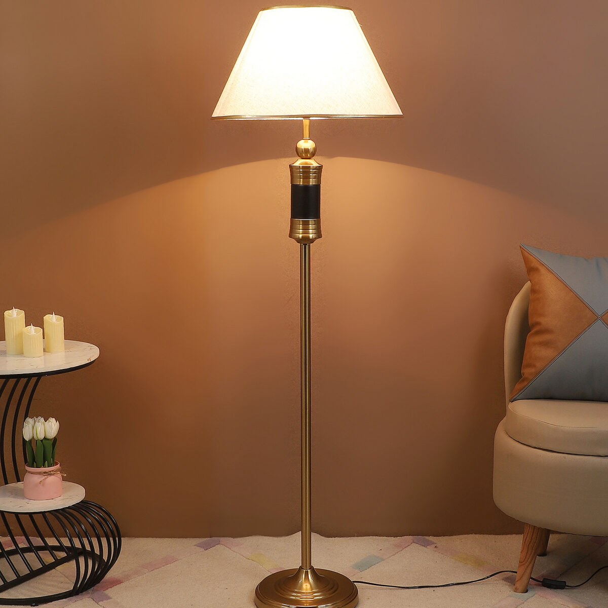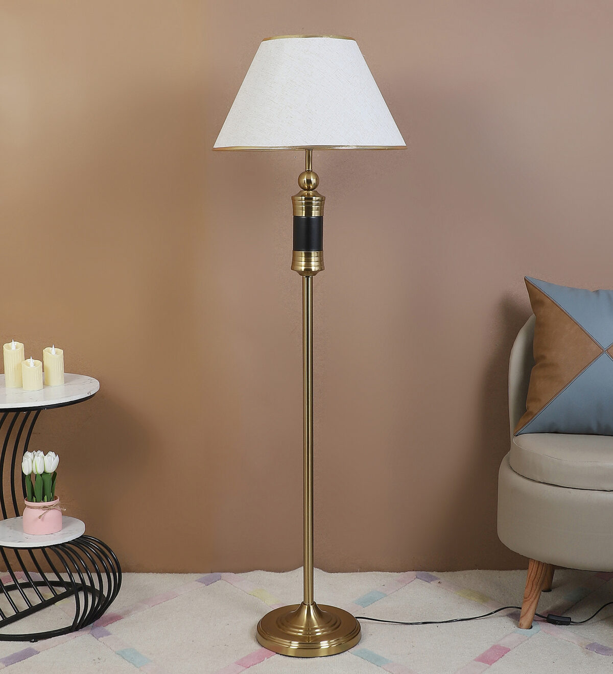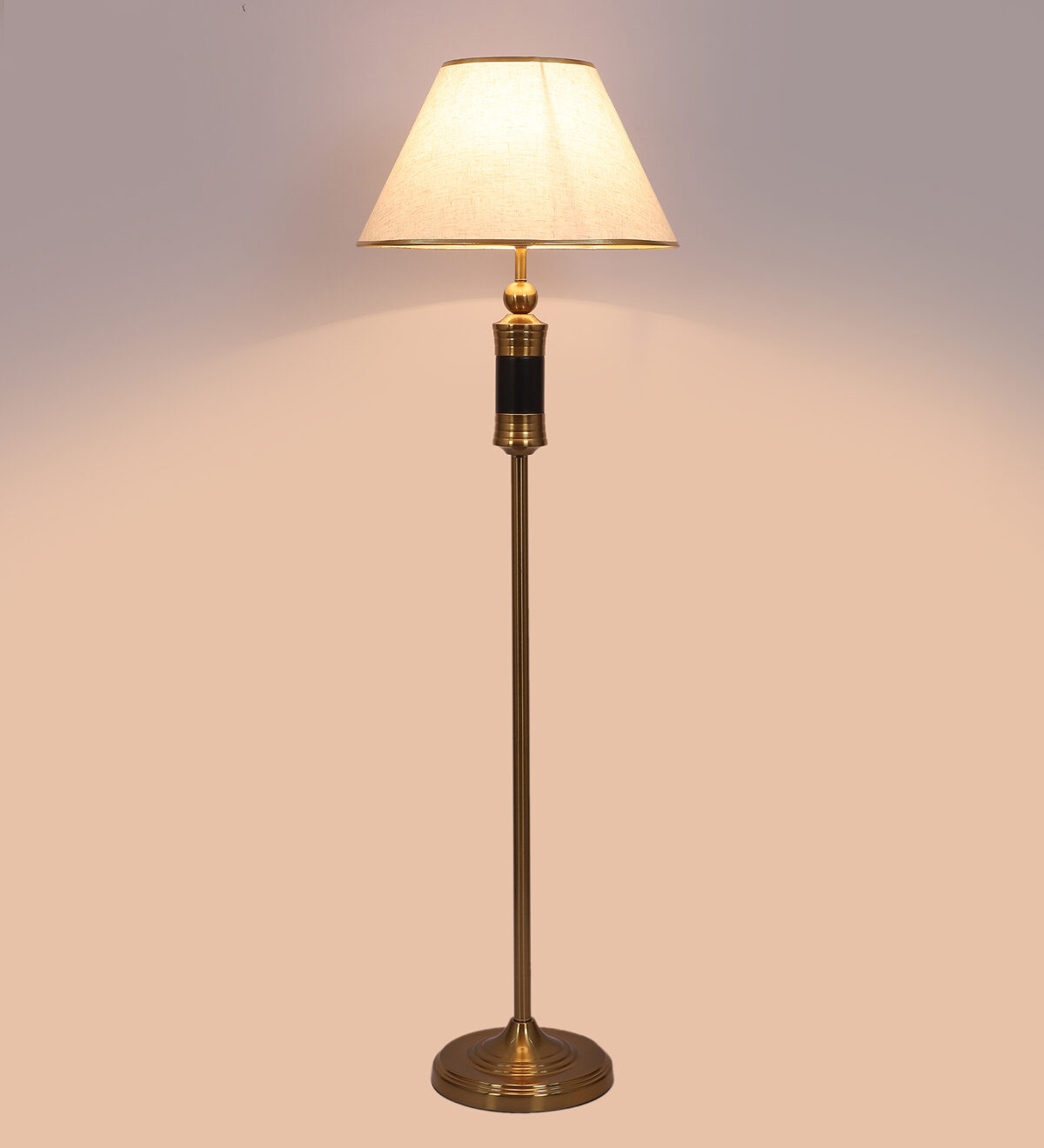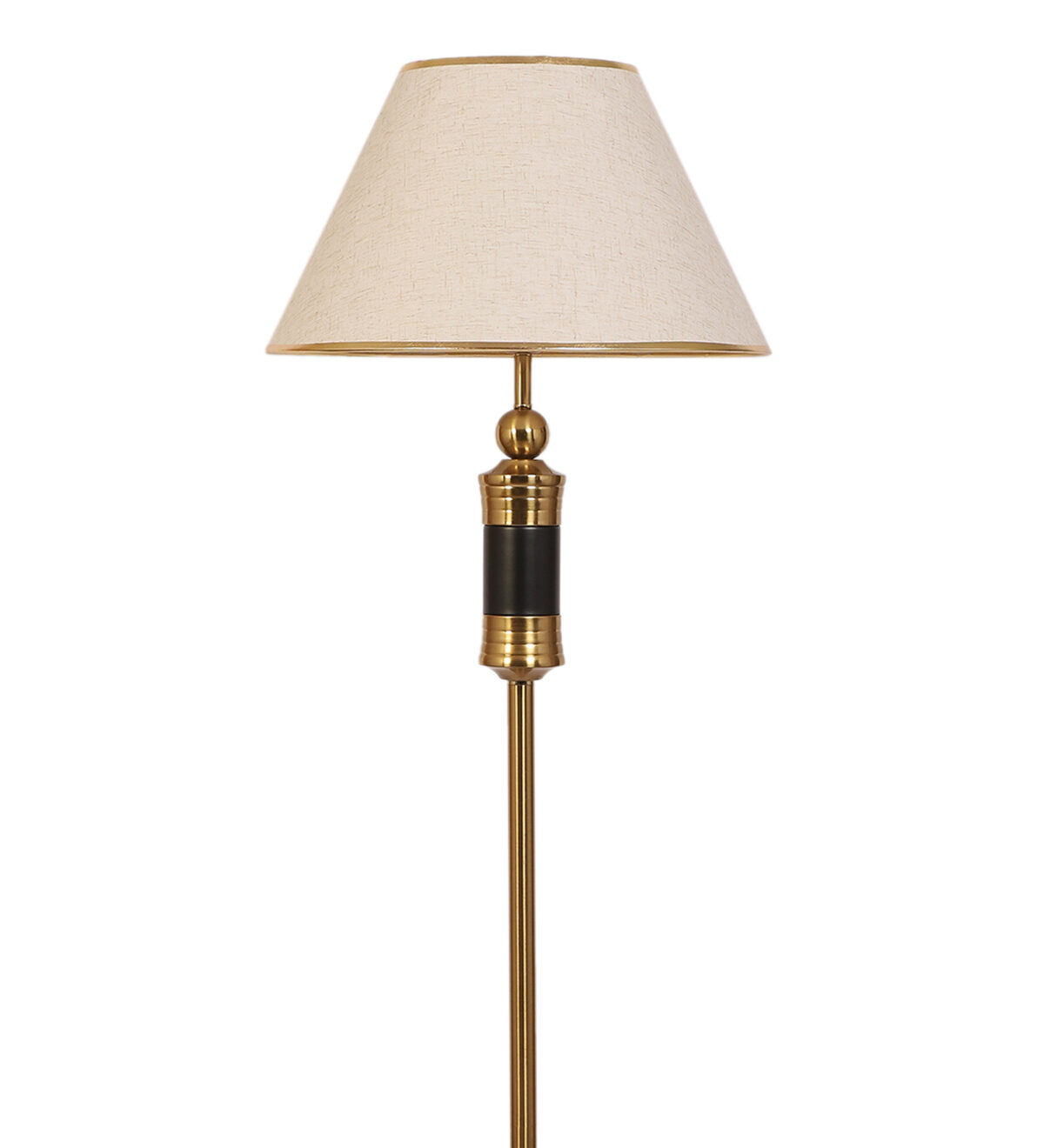 LEARC gold bronze and black finish floor lamp with cream textured shade having golden border. LAMP NOT INCLUDED.