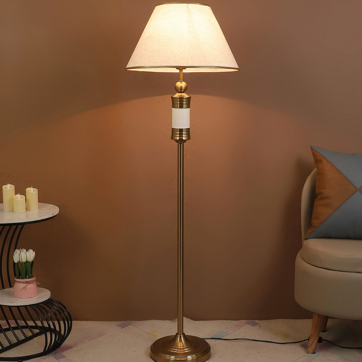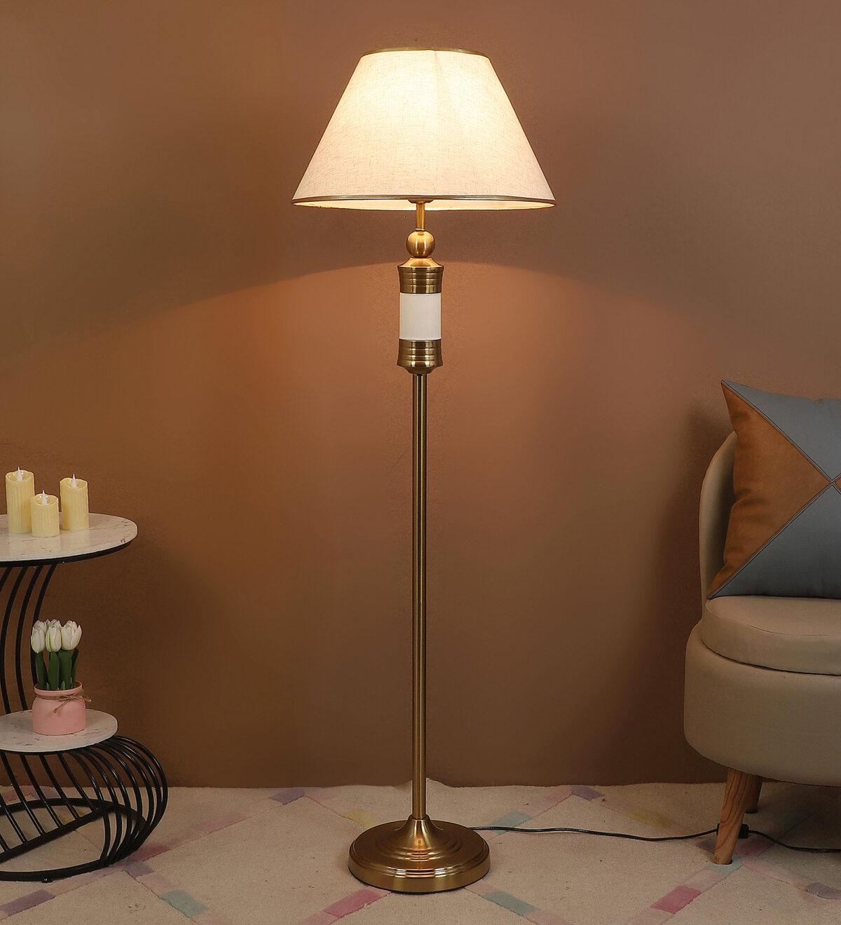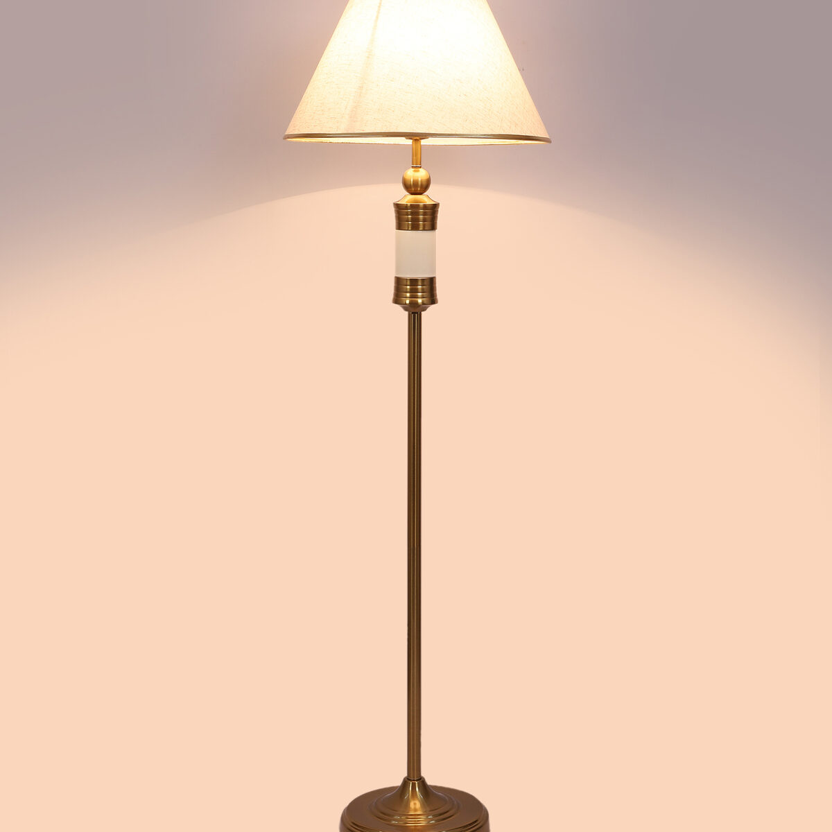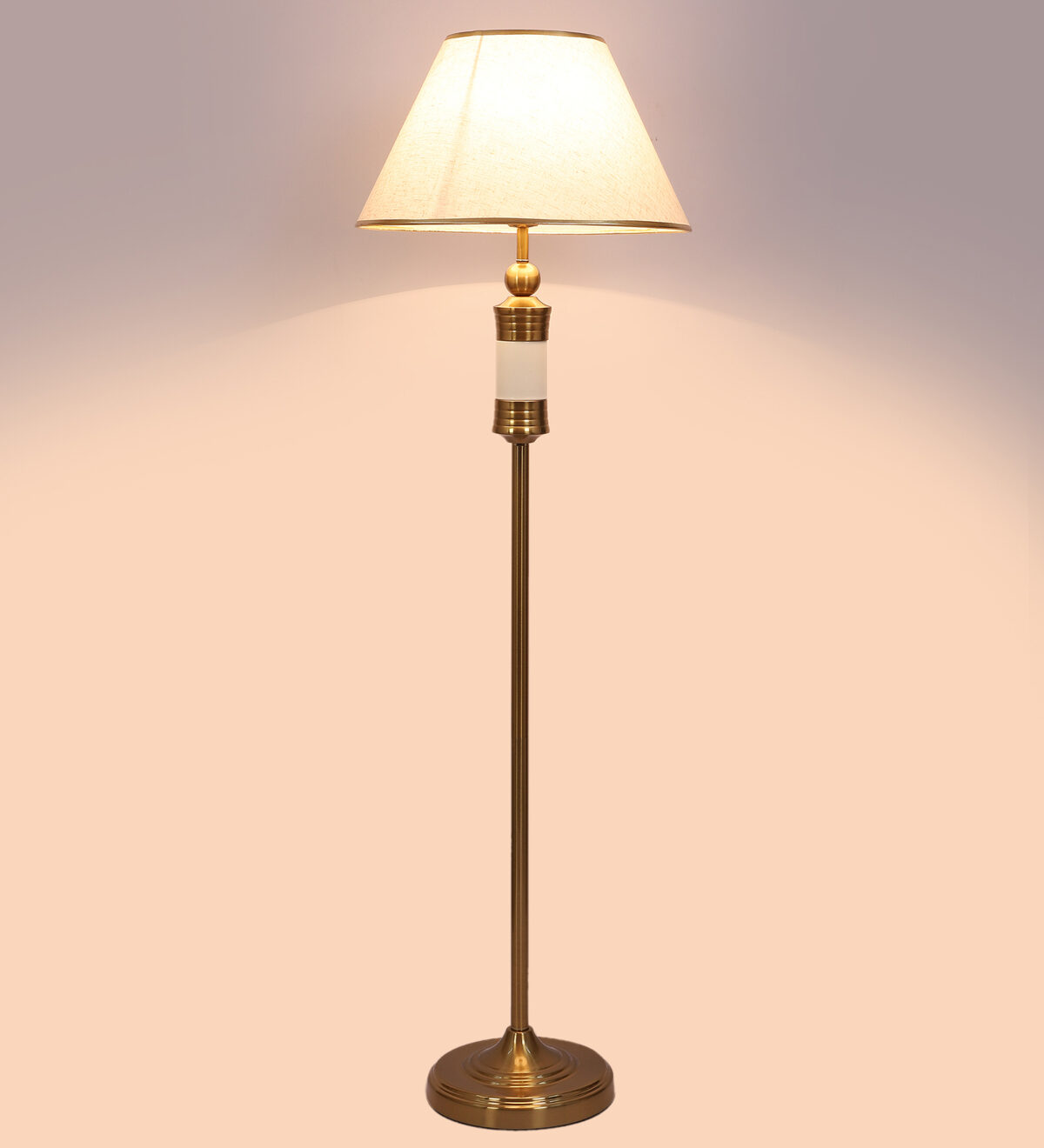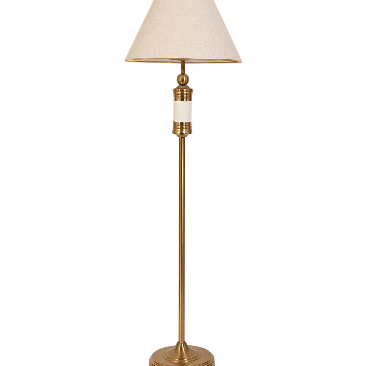 LEARC gold bronze and white finish floor lamp with cream textured shade having golden border. LAMP NOT INCLUDED.