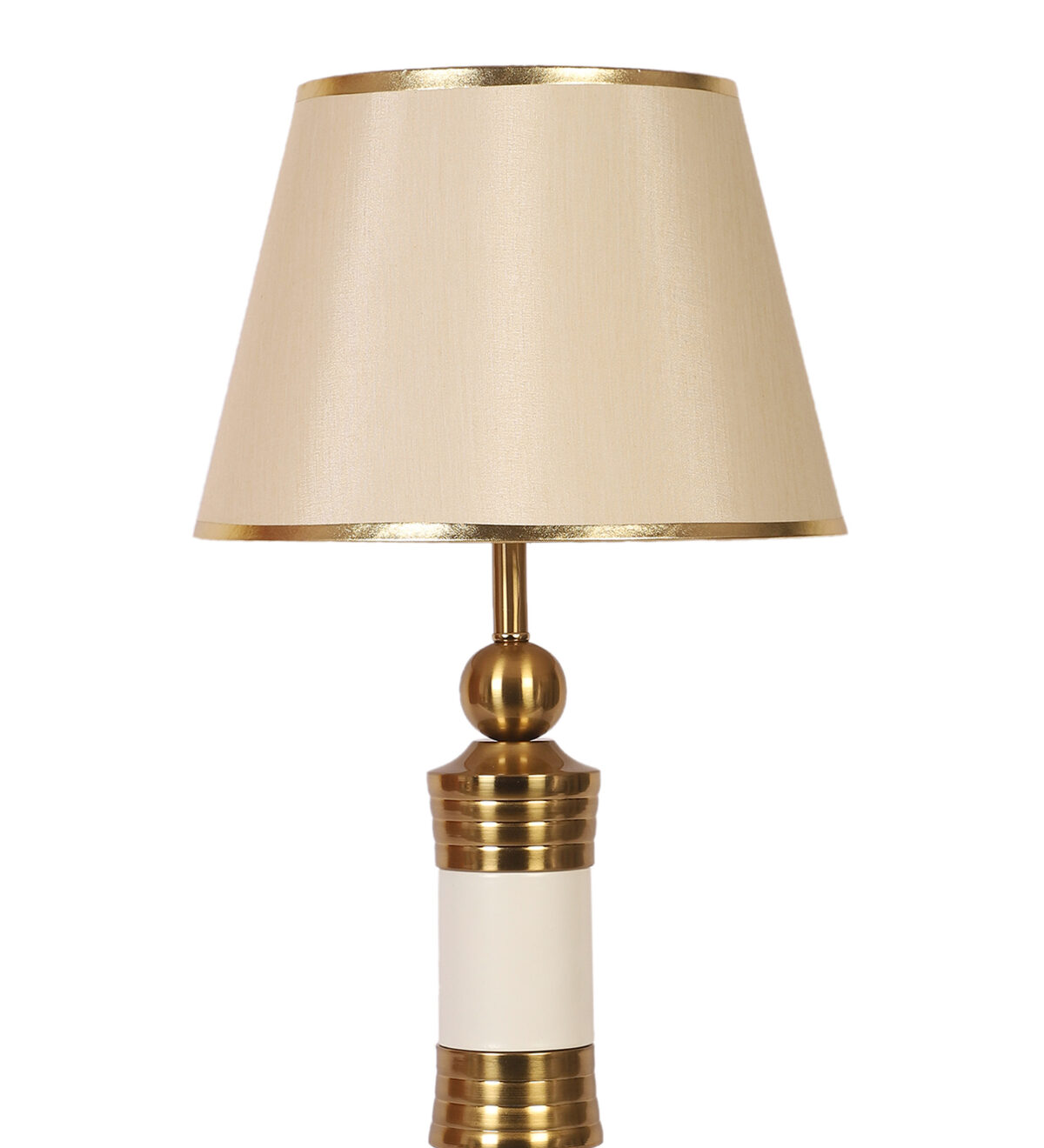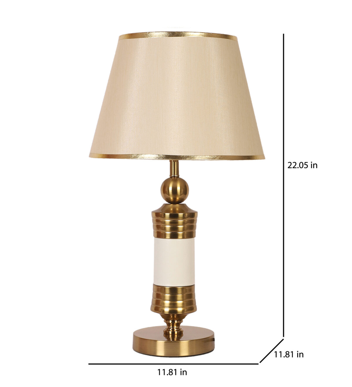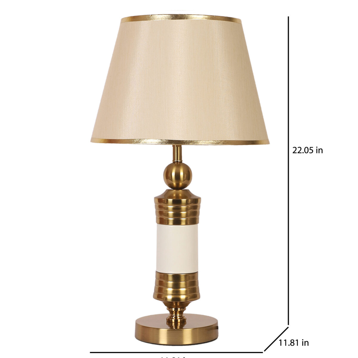 LEARC gold bronze and white finish table lamp with light gold shade having golden border. LAMP NOT INCLUDED.