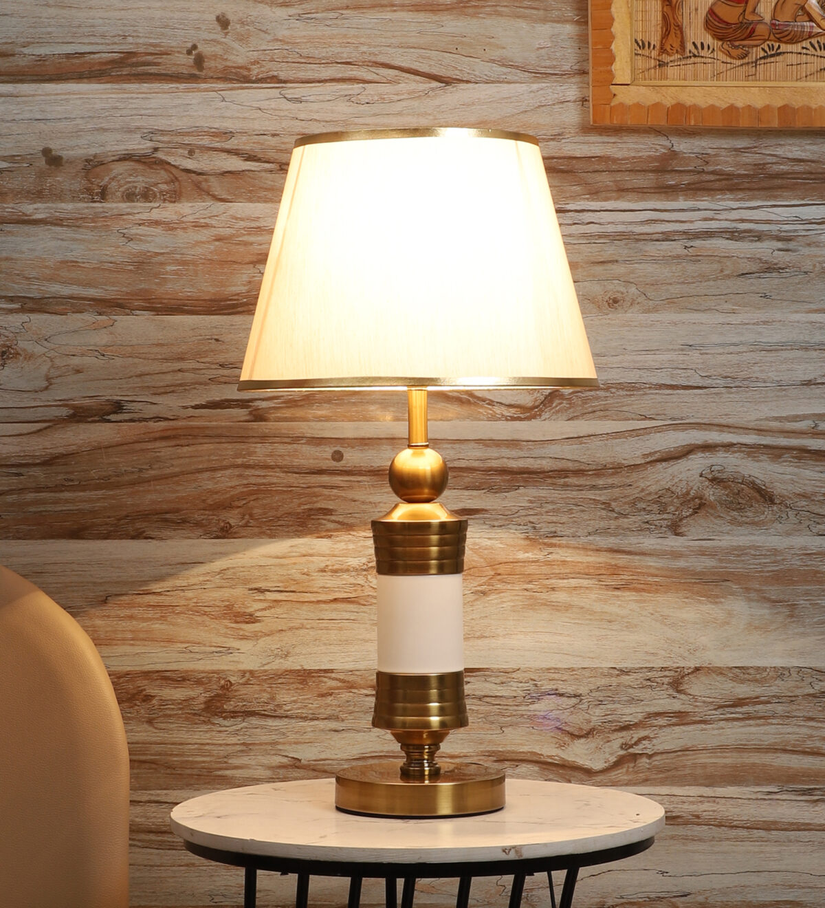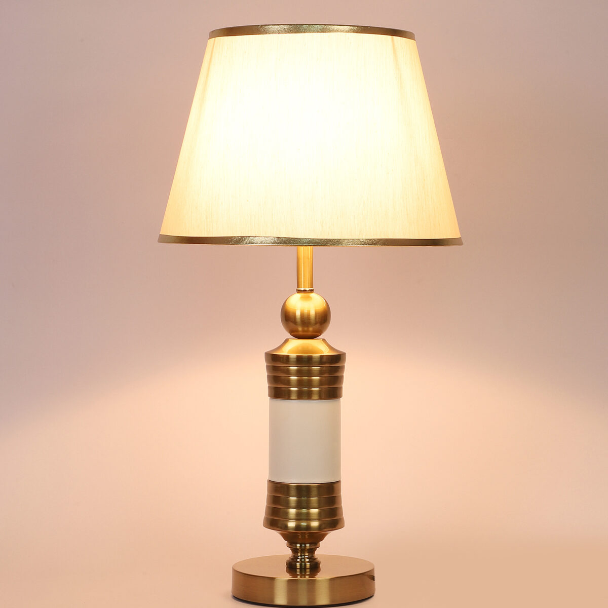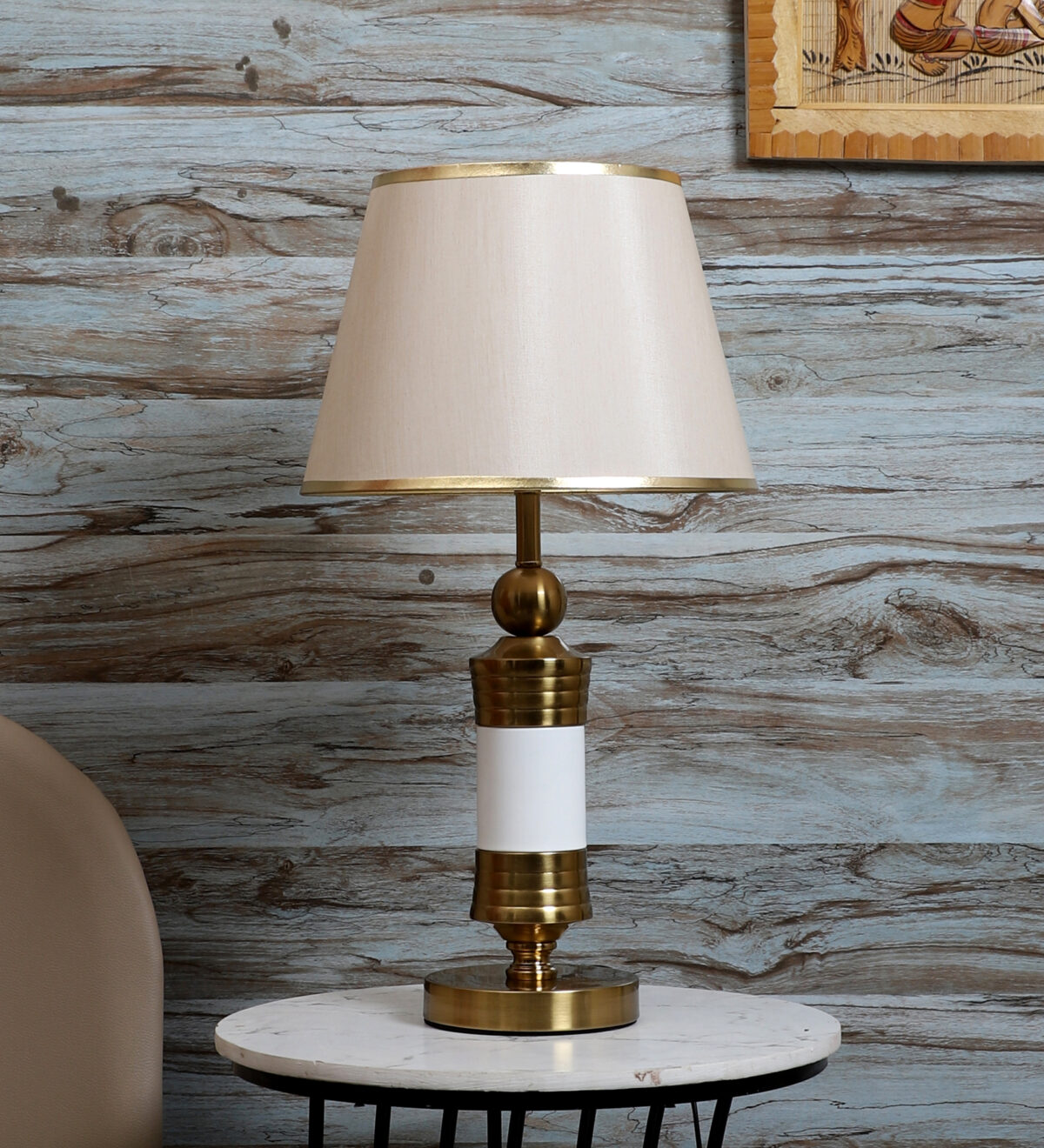 LEARC gold bronze and white finish table lamp with light gold shade having golden border. LAMP NOT INCLUDED.