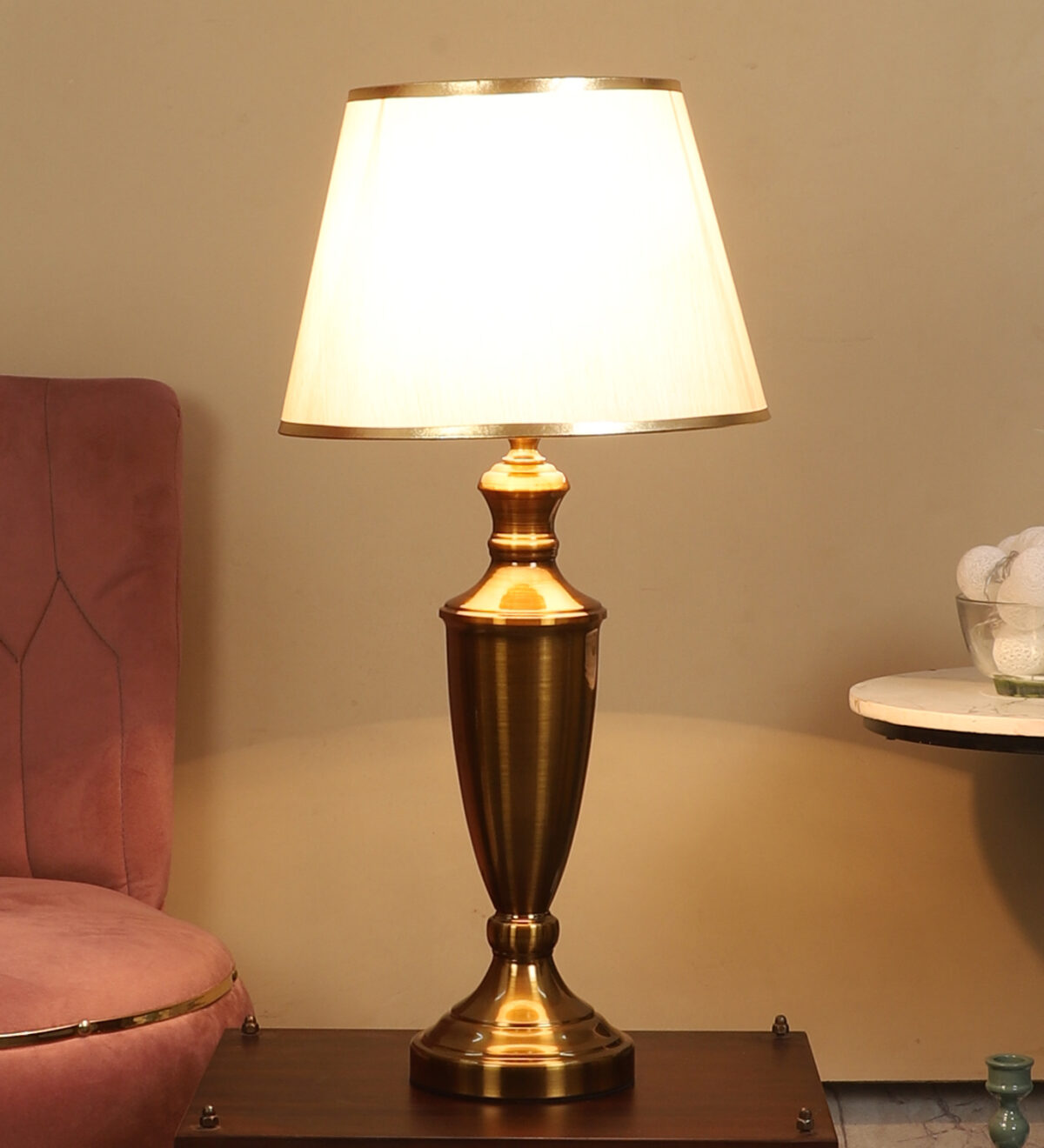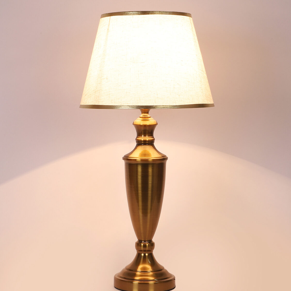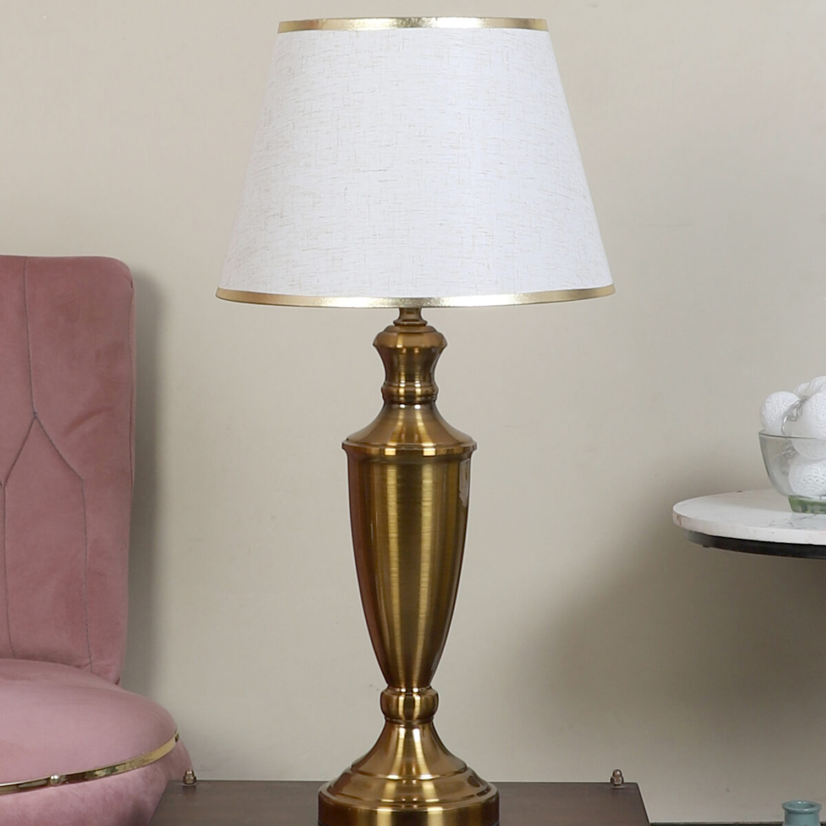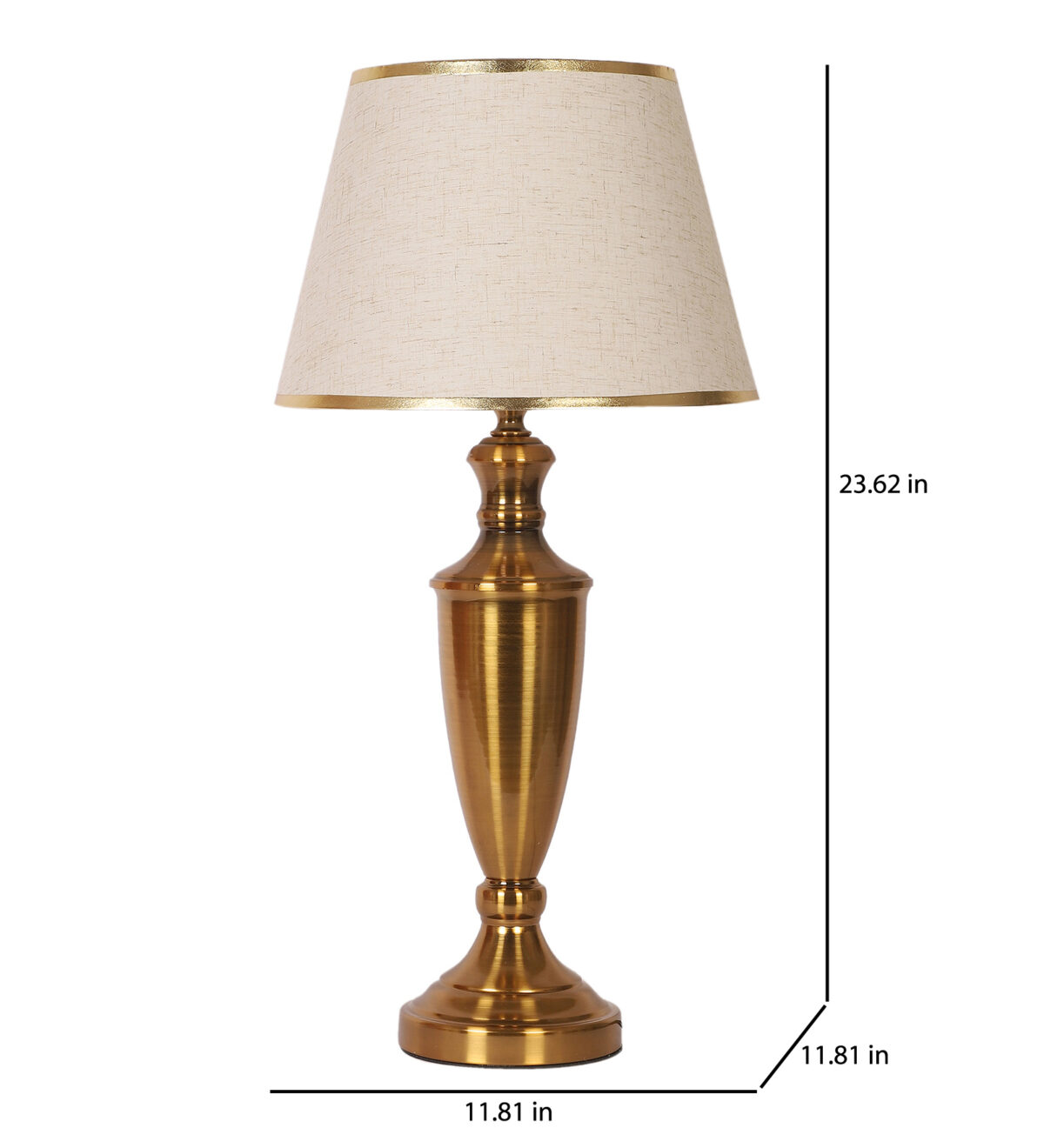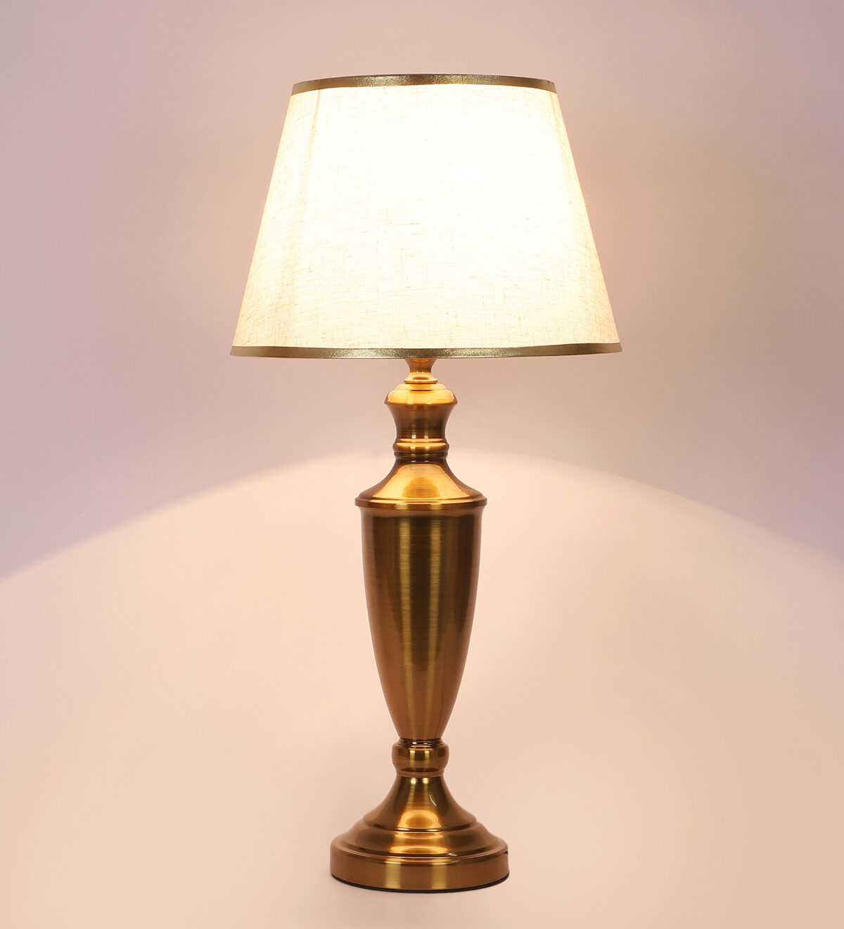 LEARC gold bronze finish table lamp with cream textured shade having golden border. LAMP NOT INCLUDED.