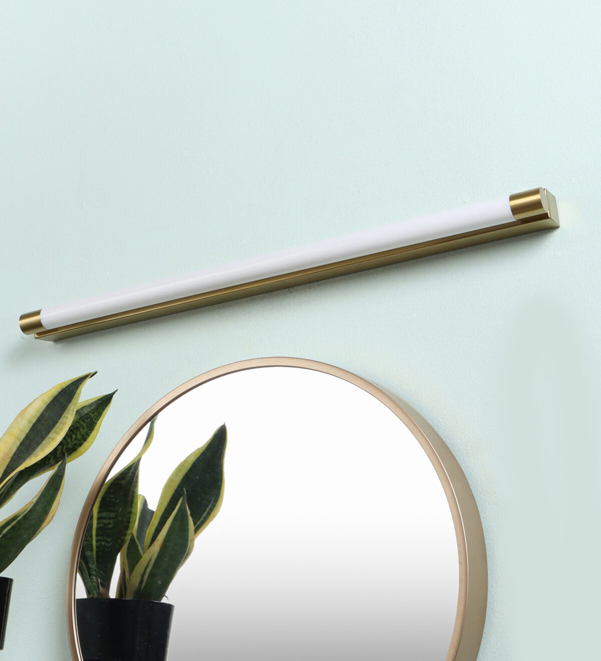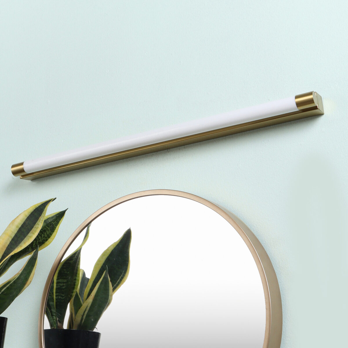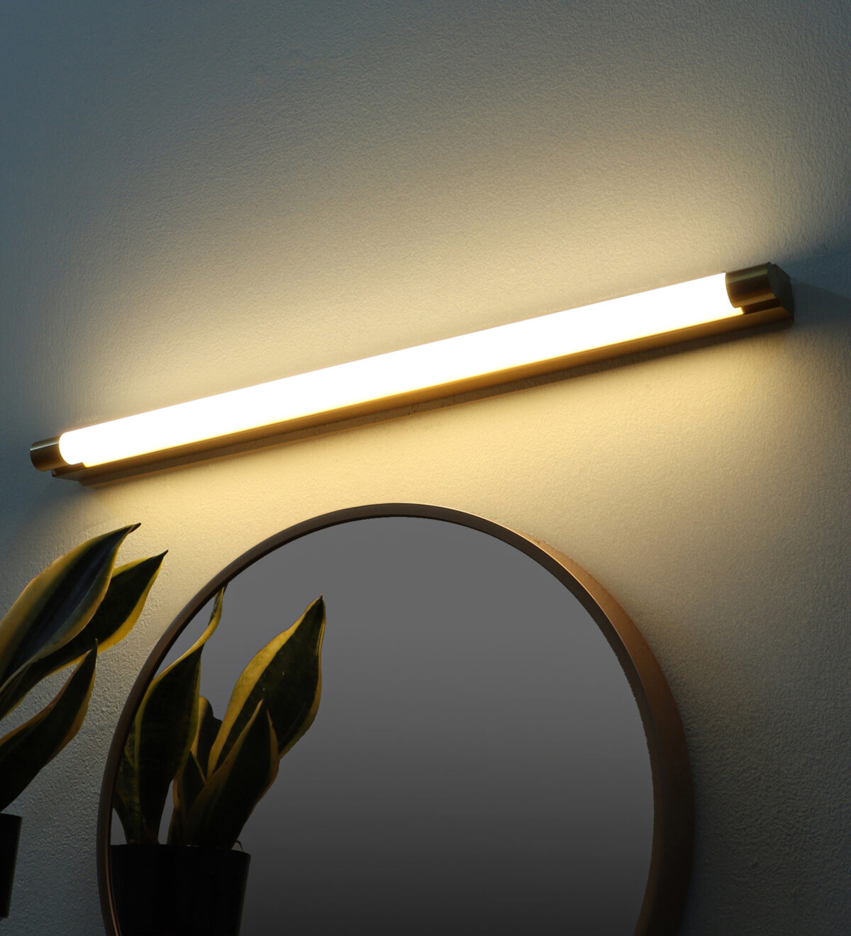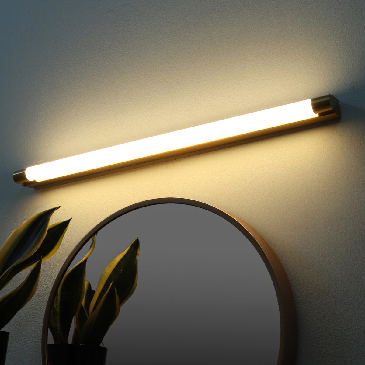 LEARC gold finish 18 watt colour changing 3 in 1 LED Mirror Light. Colour changes fom white to neutral white to yellow by switching on and off.