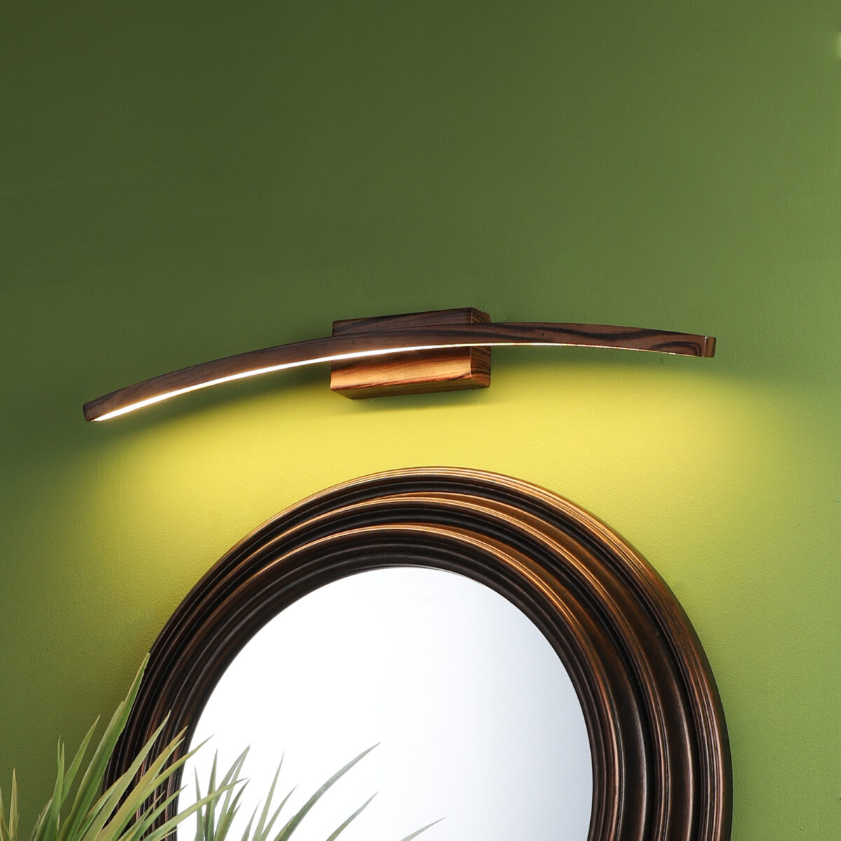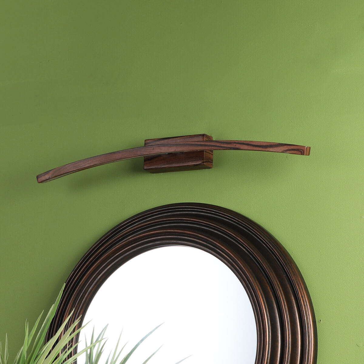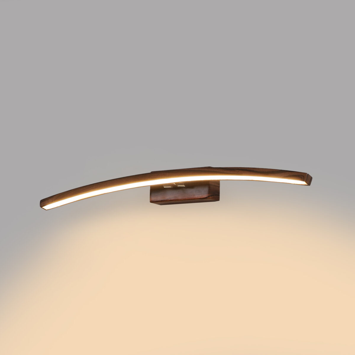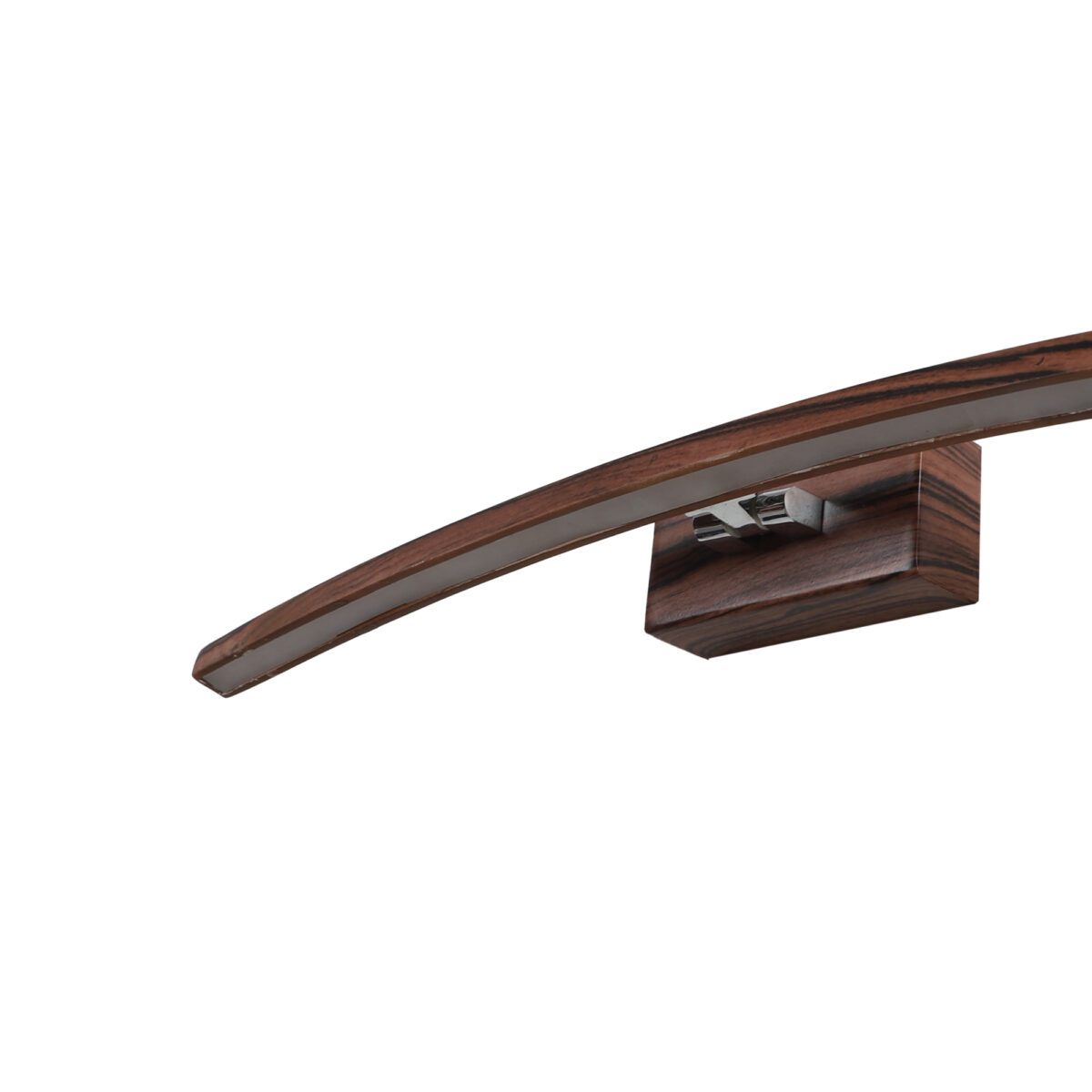 Exclusive dark brown (wood finish with grains) LED picture light using high quality LED and driver with high success rate having less than 0.5% replacement having warm white (yellow) light output. It features one adjustible point. It is usually placed over the painting or a photo frame on the wall. Can be customised as per requirement in terms of body colour, colour of light output and wattage.