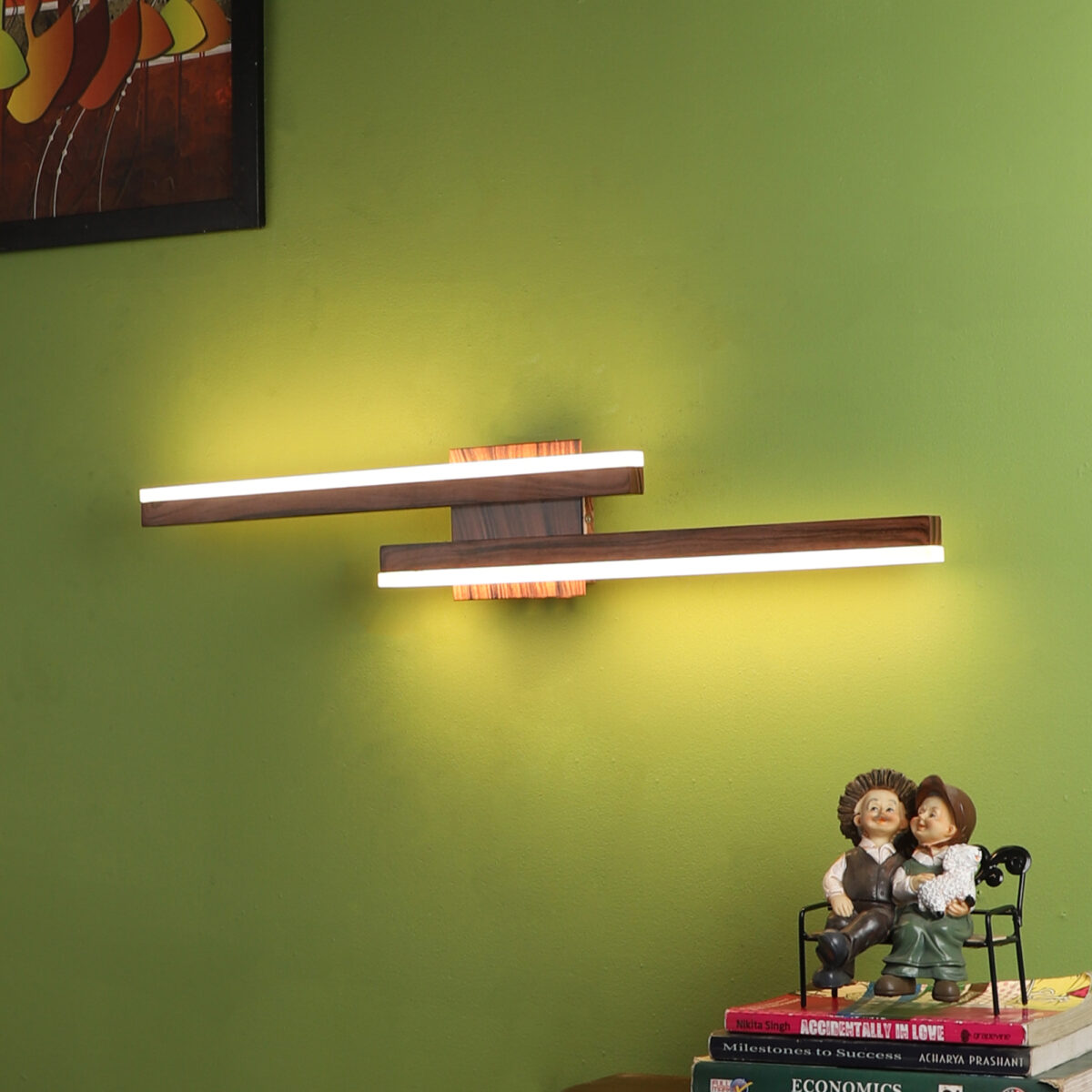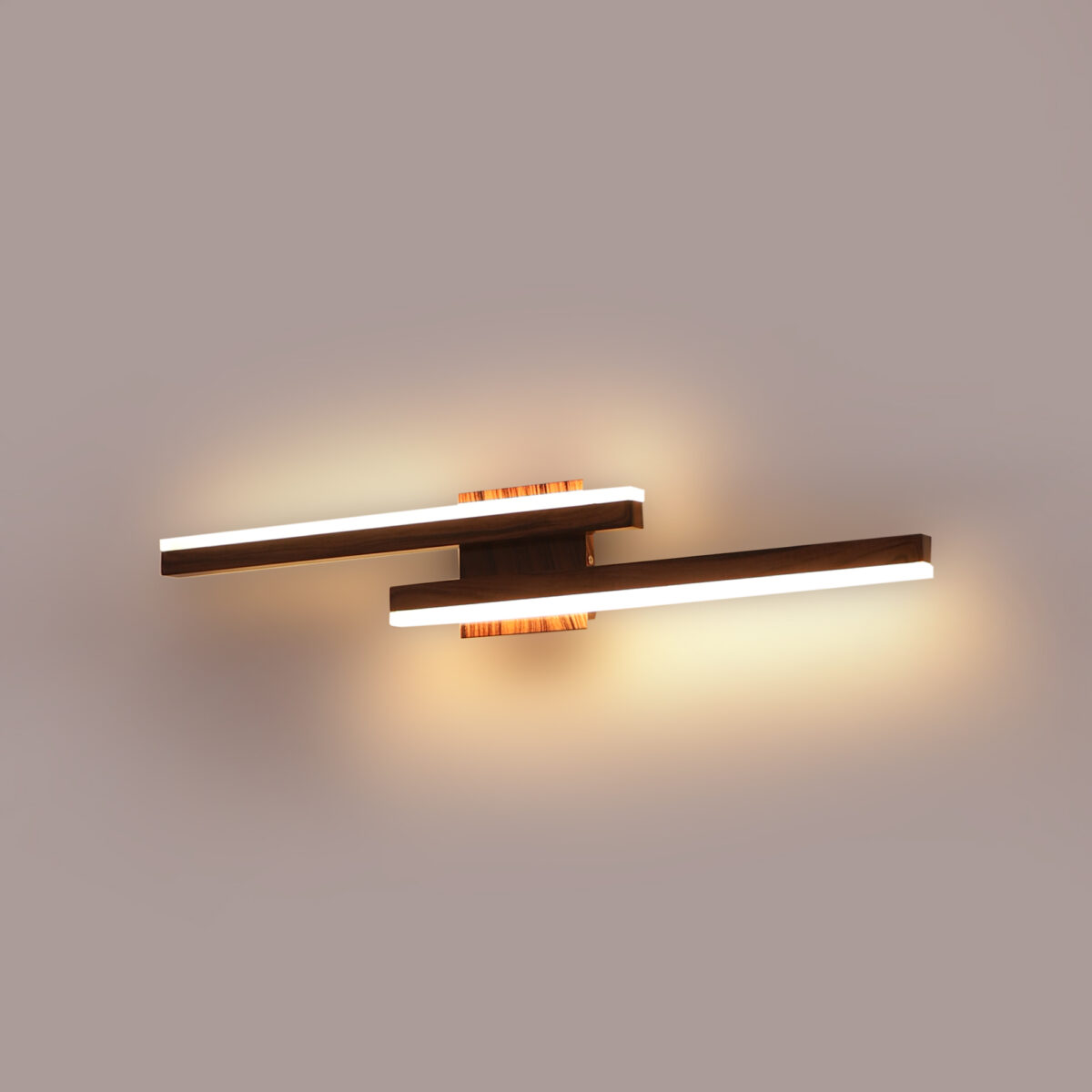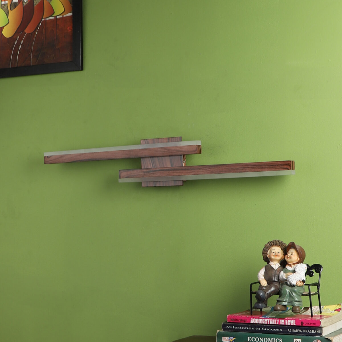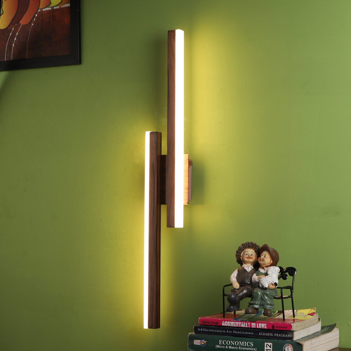 Brown (wood finish with grains) up and down LED wall light using high quality LED and driver with high success rate having less than 0.5% replacement with warm white (yellow) light output. This design is largely preferred by architects and interior designers. Application includes both residential and commercial premises. Can also be used as a mirror light. Can be customised as per requirement.
