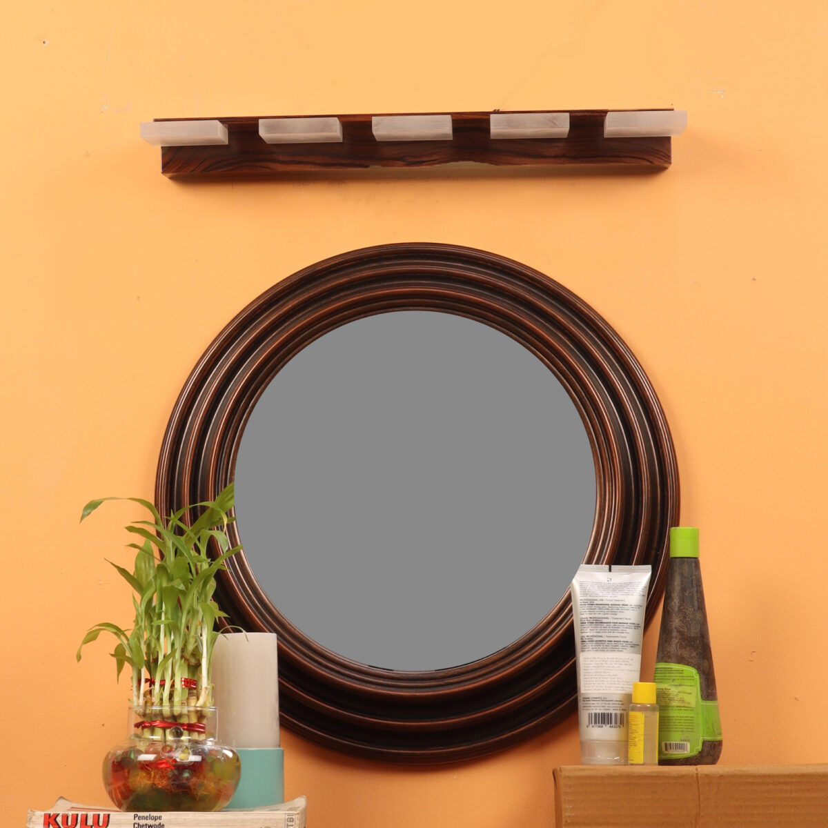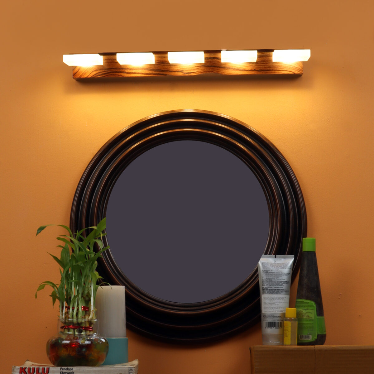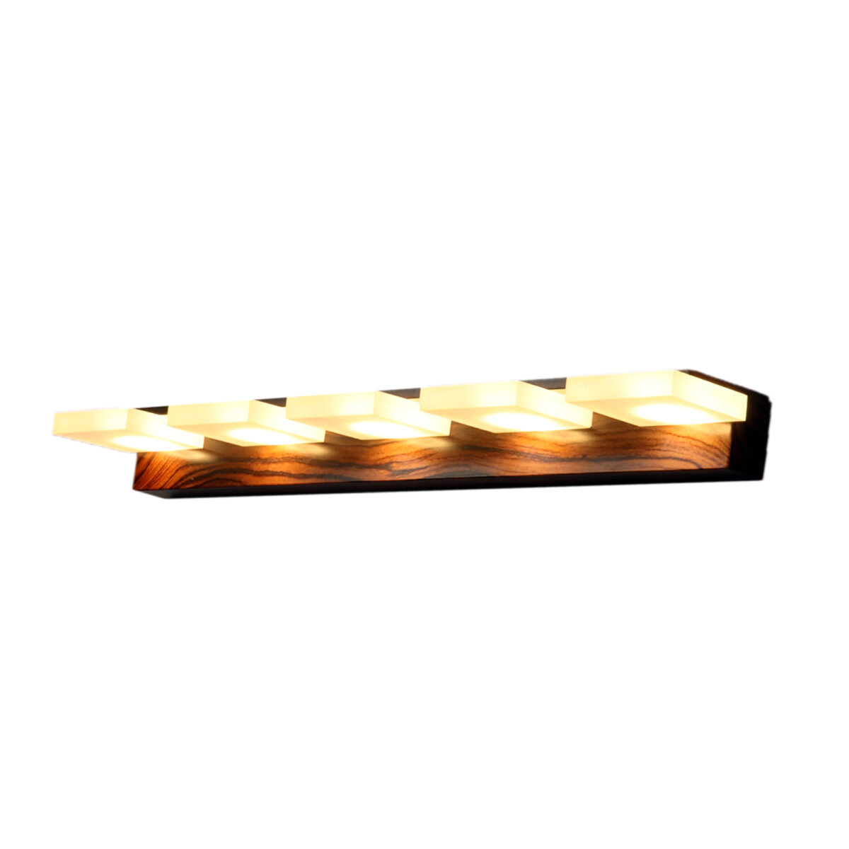 Exclusive dark brown (wood finish with grains) LED mirror light using high quality LED and driver with high success rate having less than 0.5% replacement with warm white (yellow) light output. It is usually placed over the mirror. Can also be used as a picture light or a wall light. Its premium quality wood finish makes it one of the best selling product in our catalogue. It is also available with three, four and six light options. Can be customized as per requirement in terms of finish and weidth.