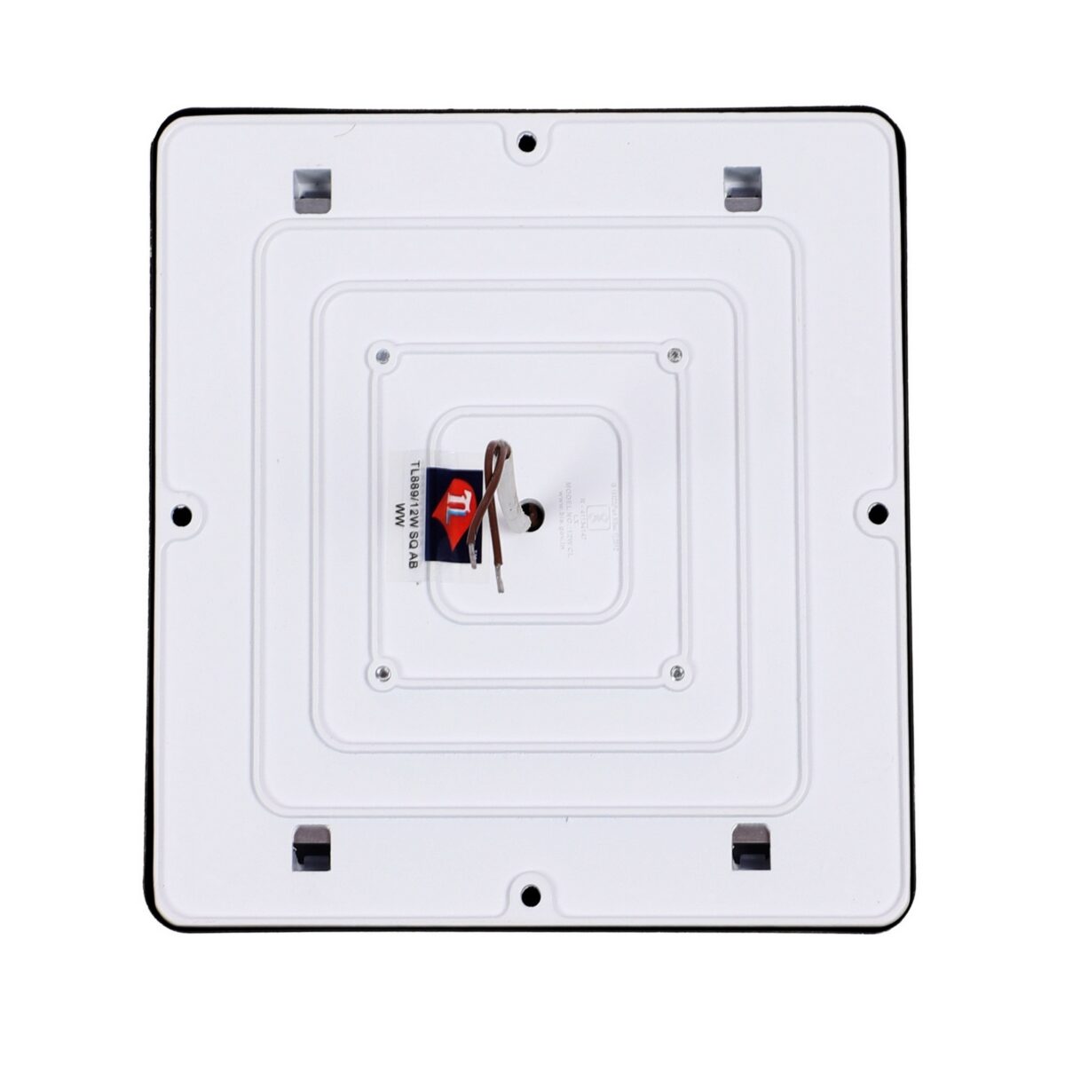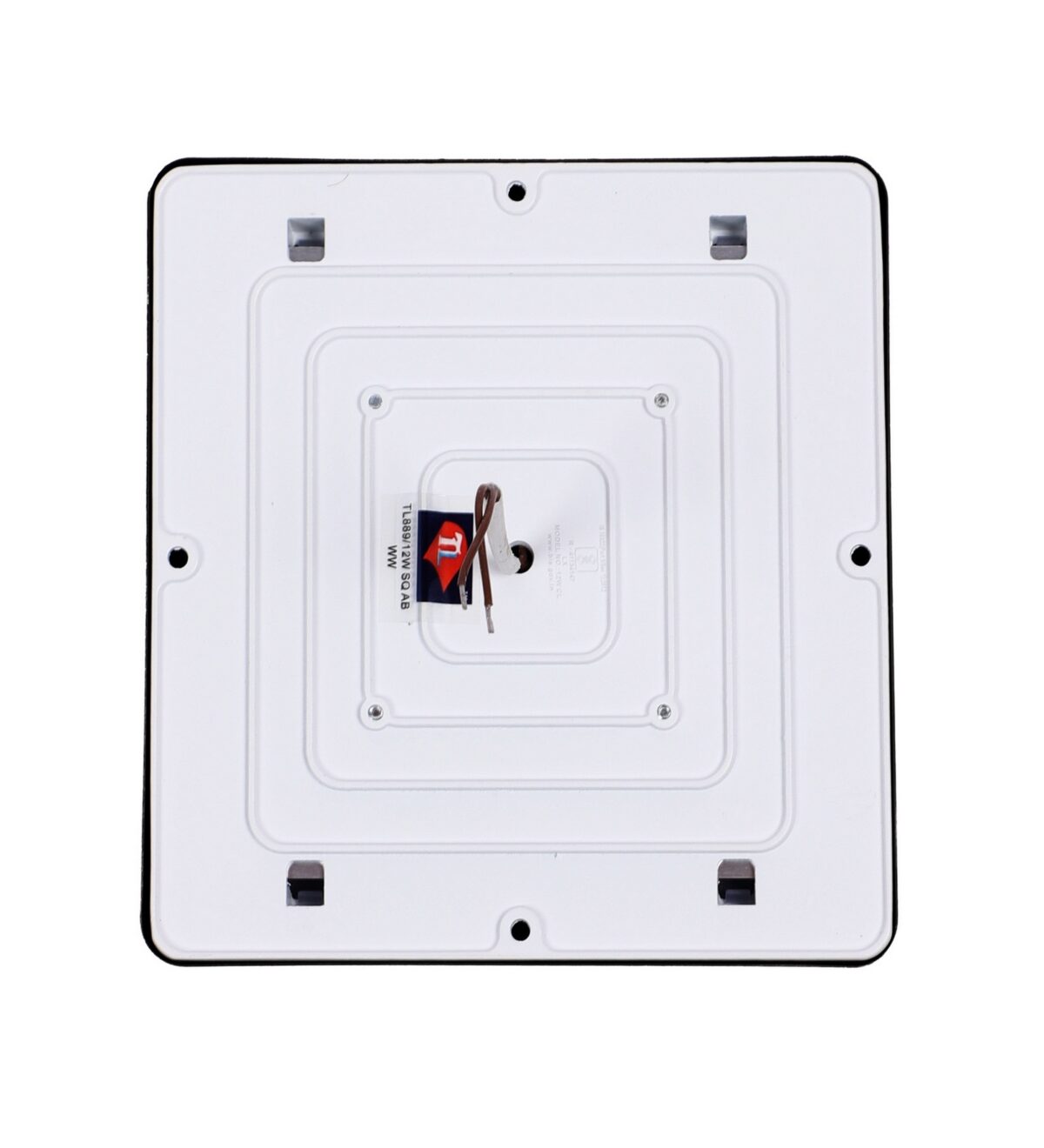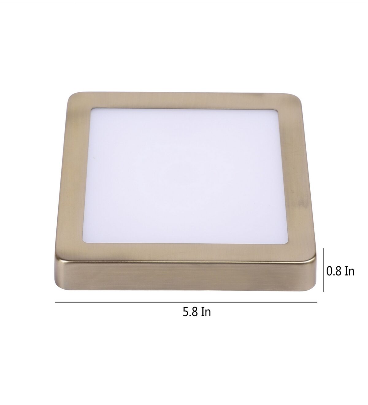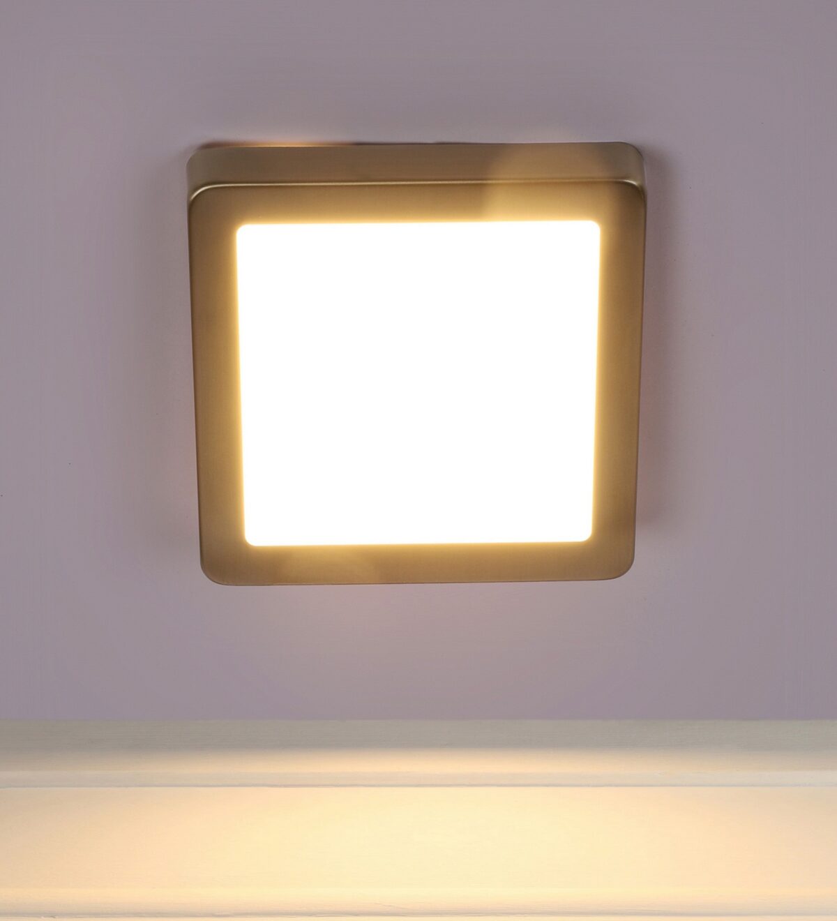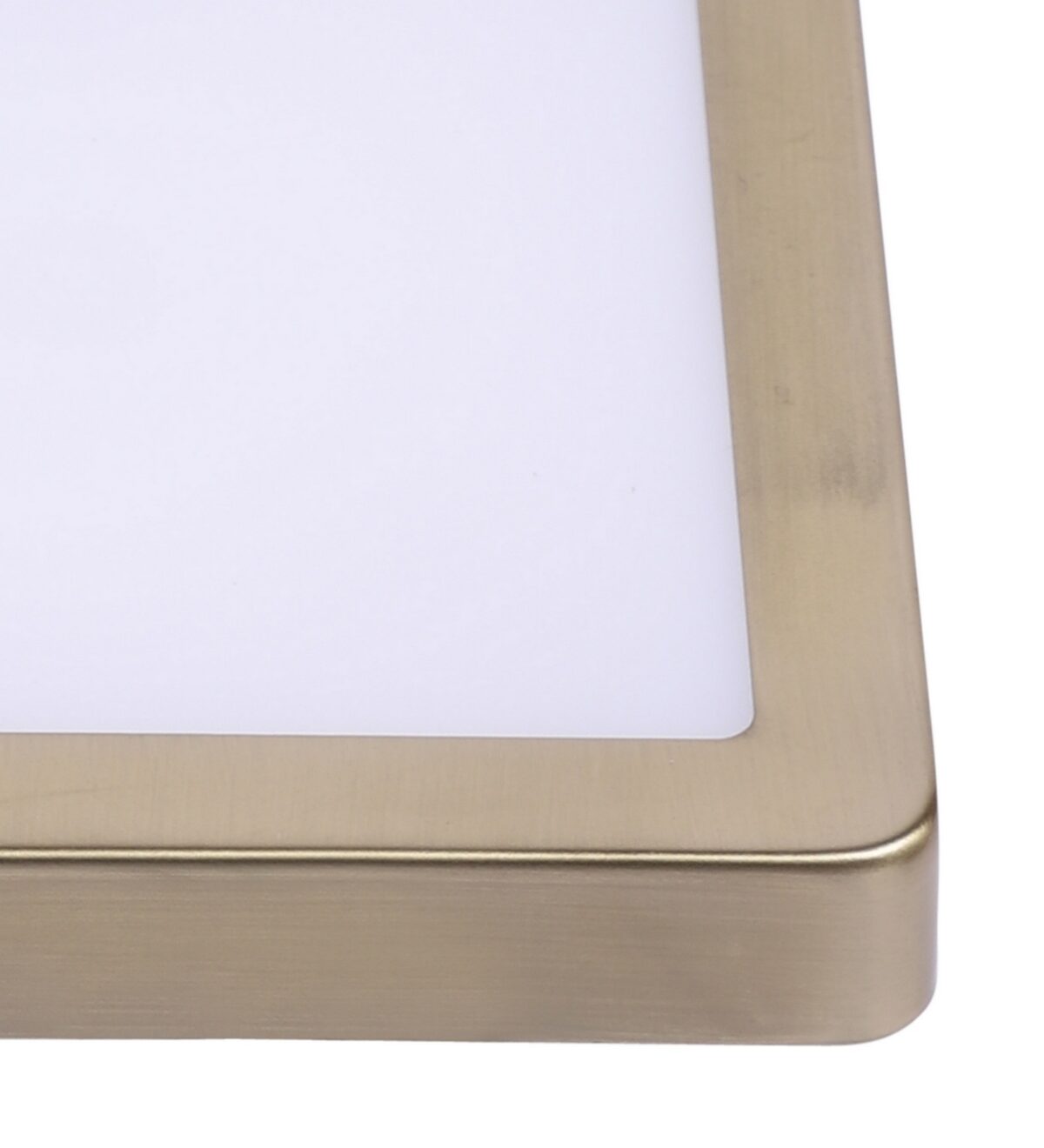 Antique brass finish square LED surface seiling light with warm white (yellow) light output. Can be used both indoors and outdoors.