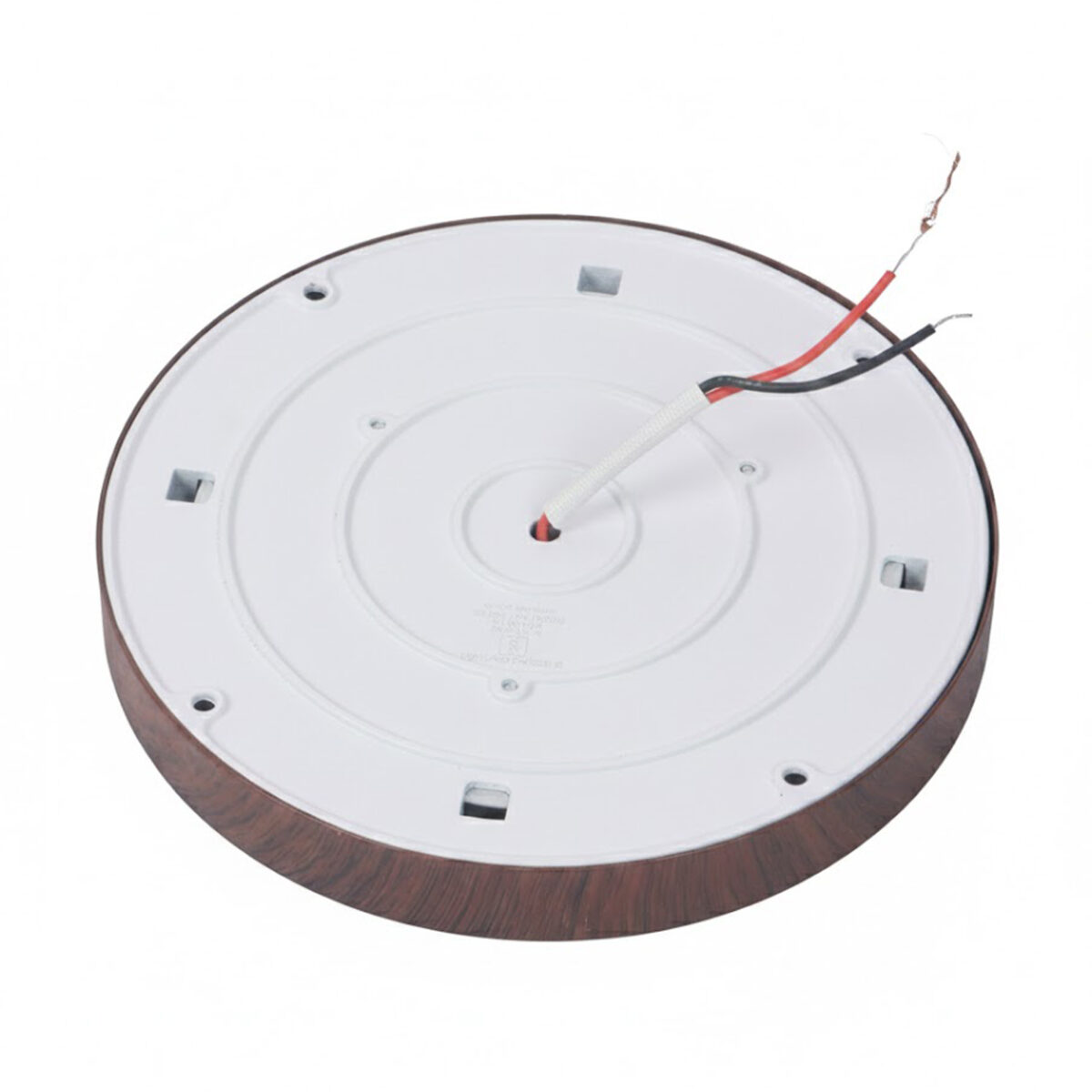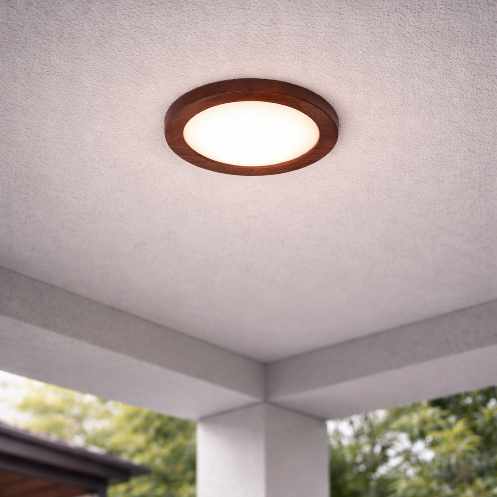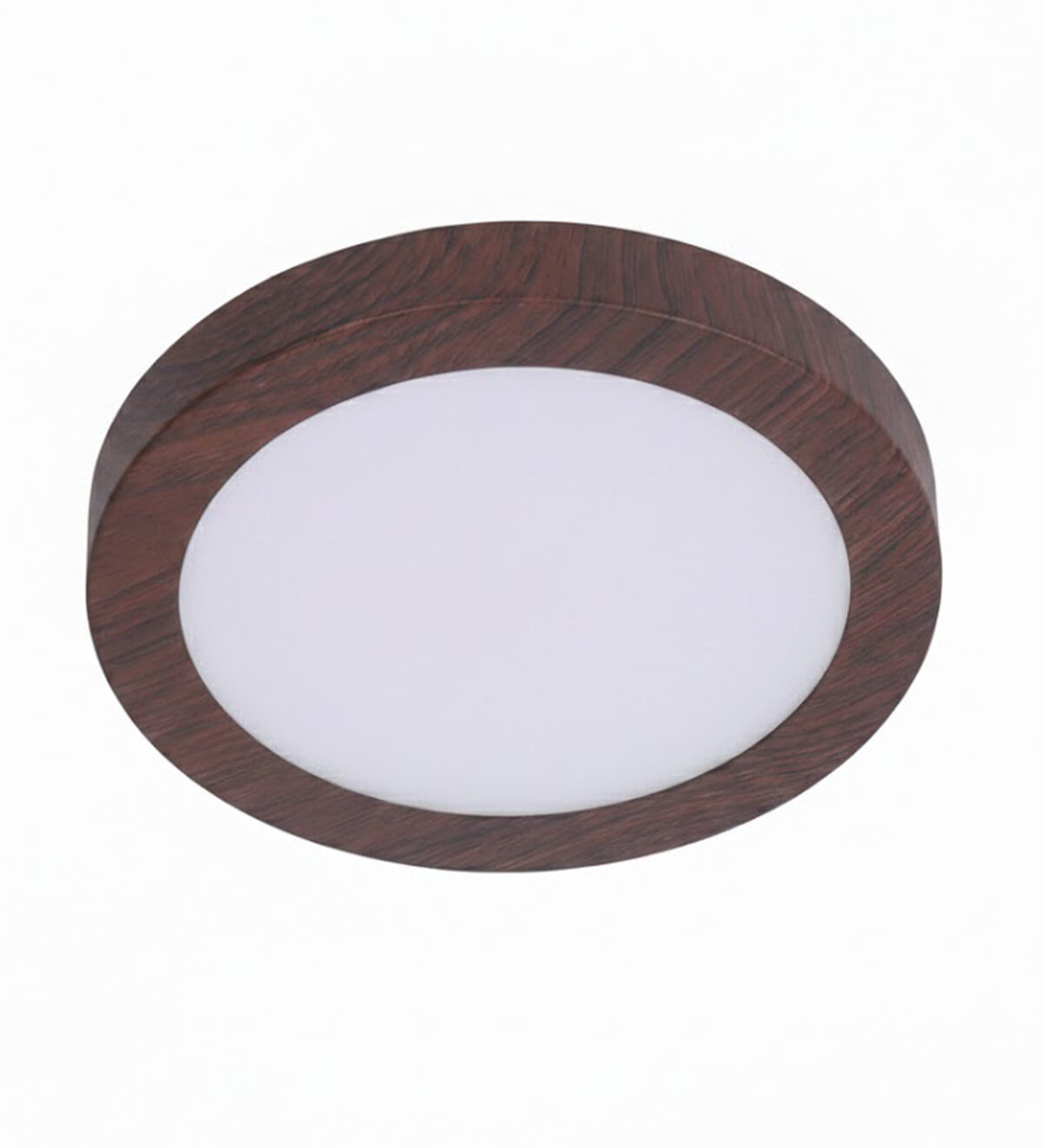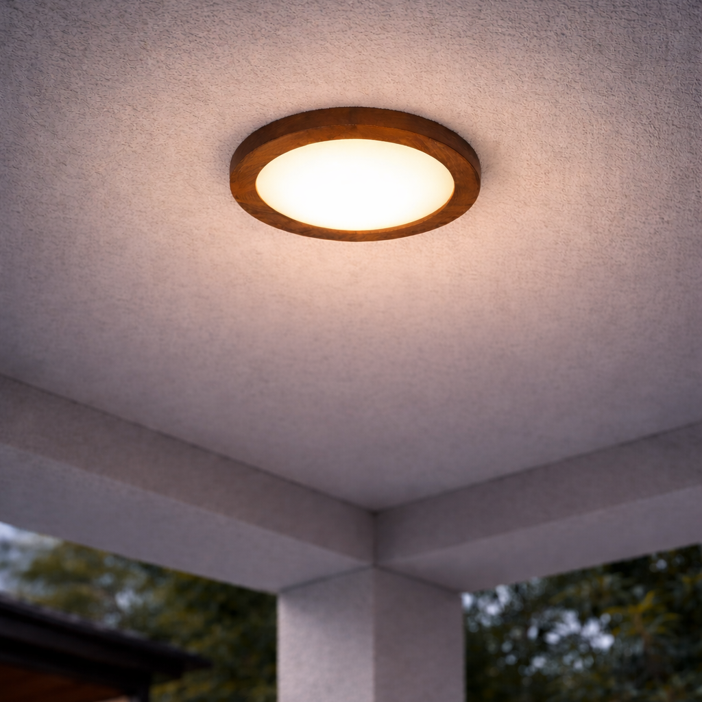 Wooden finish square LED surface ceiling light with warm white (yellow) light output. Can be used both indoors and outdoors.