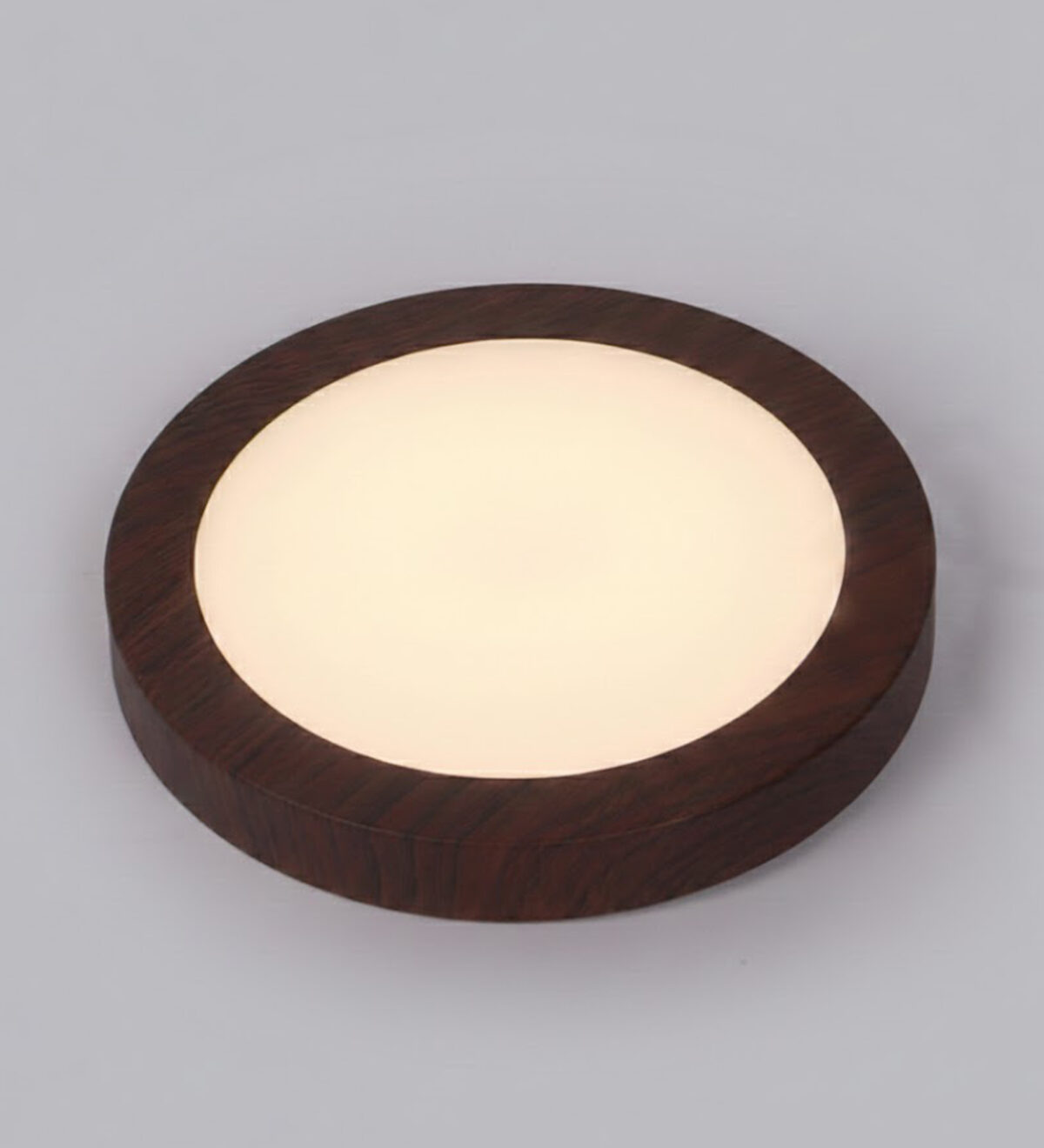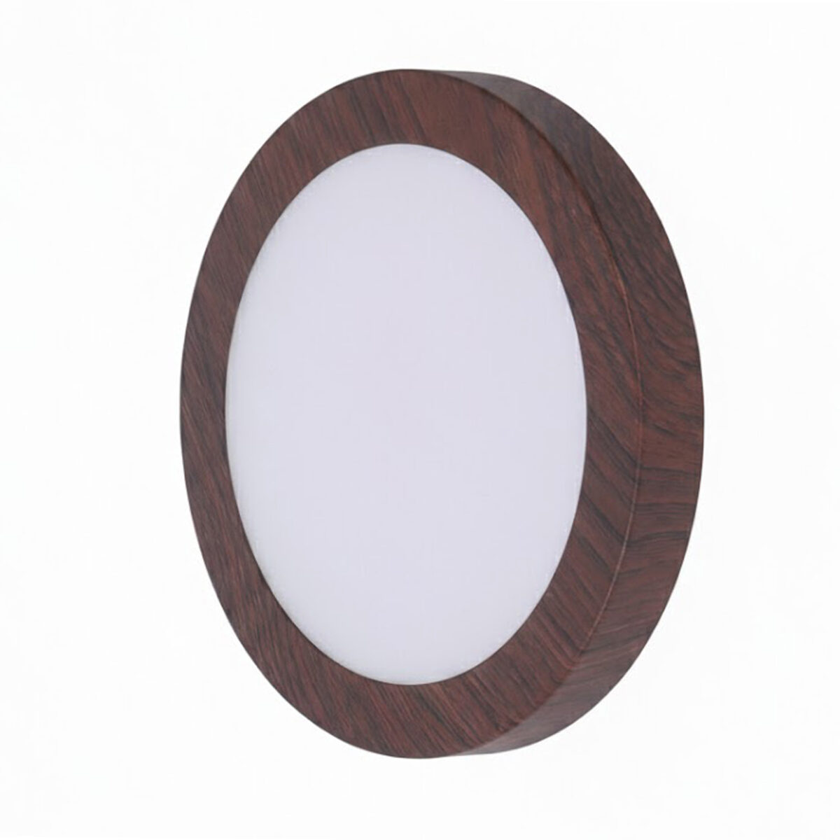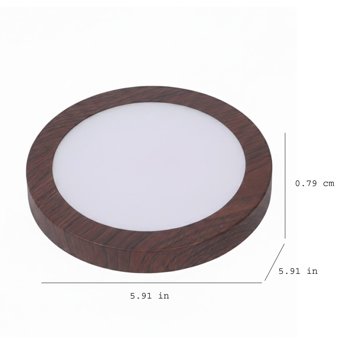 Wooden finish square LED surface ceiling light with warm white (yellow) light output. Can be used both indoors and outdoors.