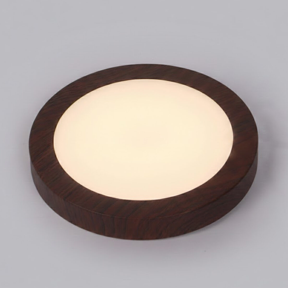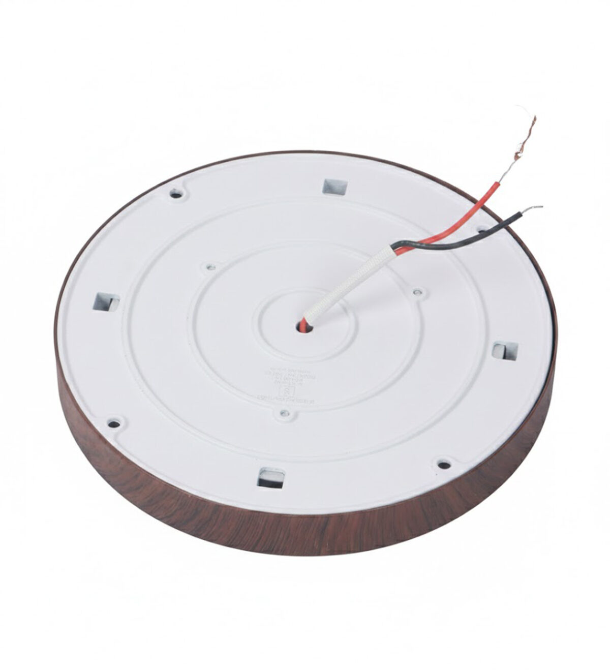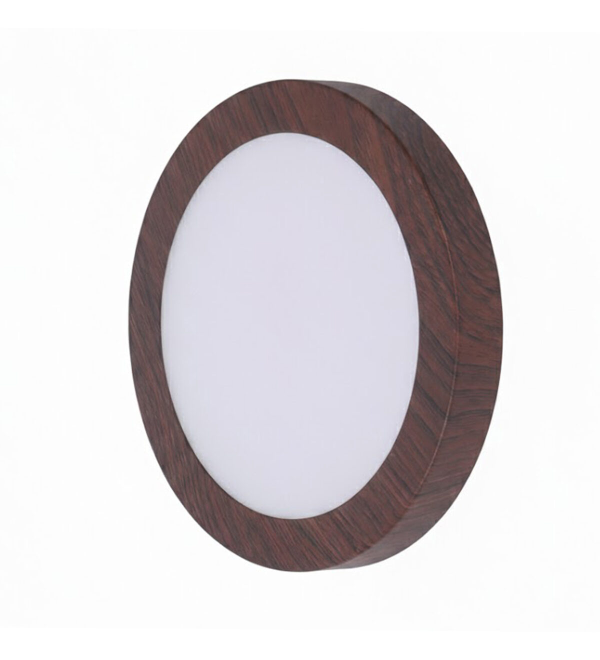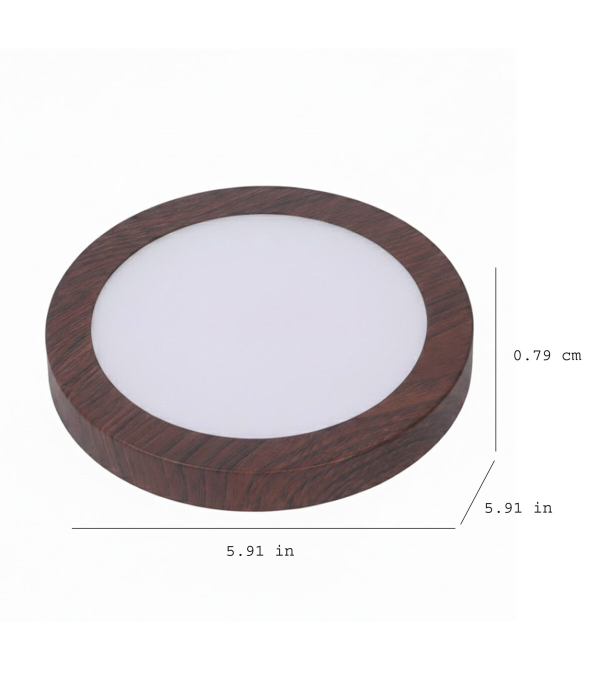 Wooden finish square LED surface ceiling light with warm white (yellow) light output. Can be used both indoors and outdoors.