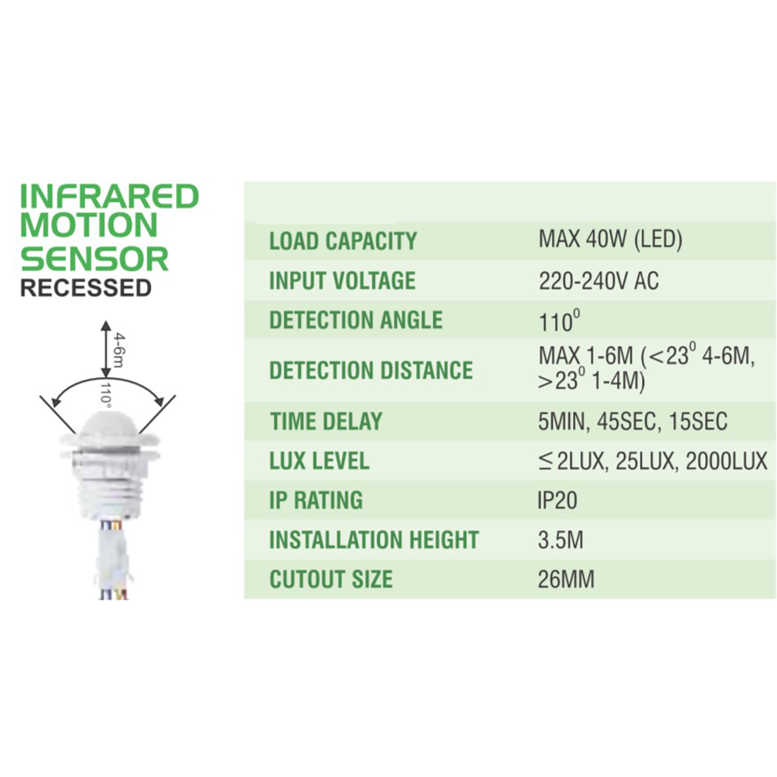 LEARC PIR motion sensor for single light with distance time and Lux adjustment.