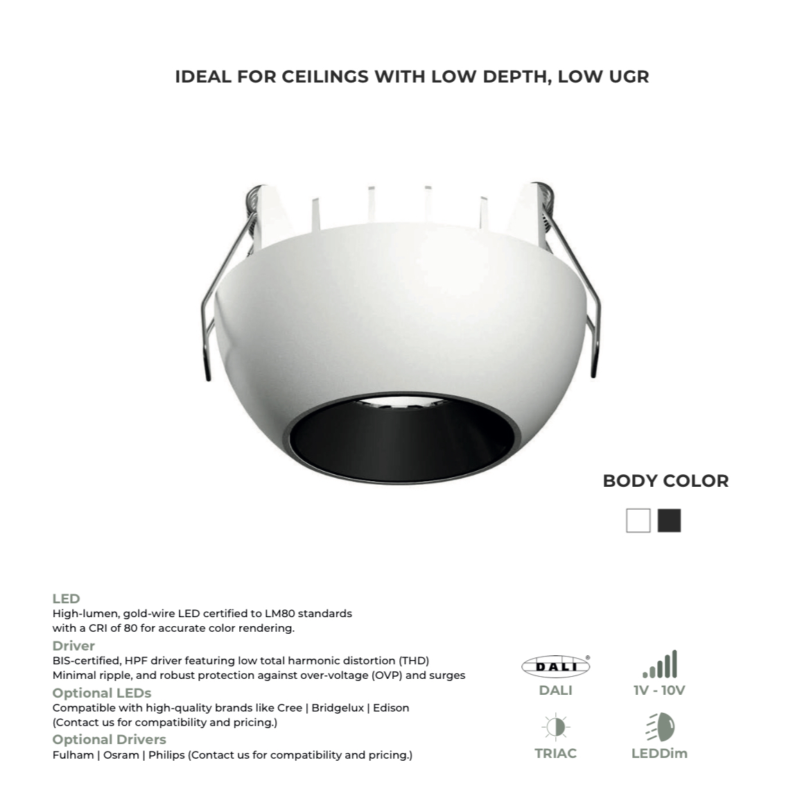 LEARC premium 12 watt black finish low depth LED recessed down light.
