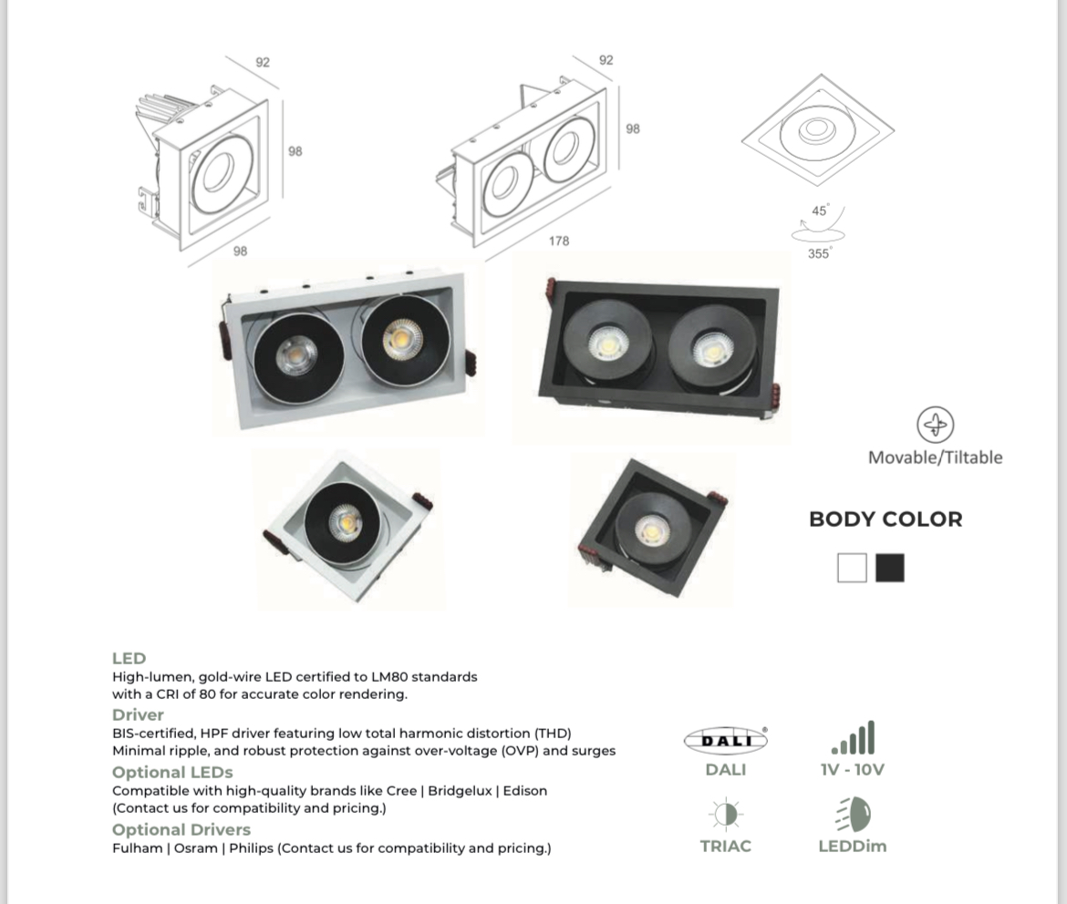 LEARC premium 2X12 watt movable and tiltable LED down light black finish with top branded LED and Driver.
