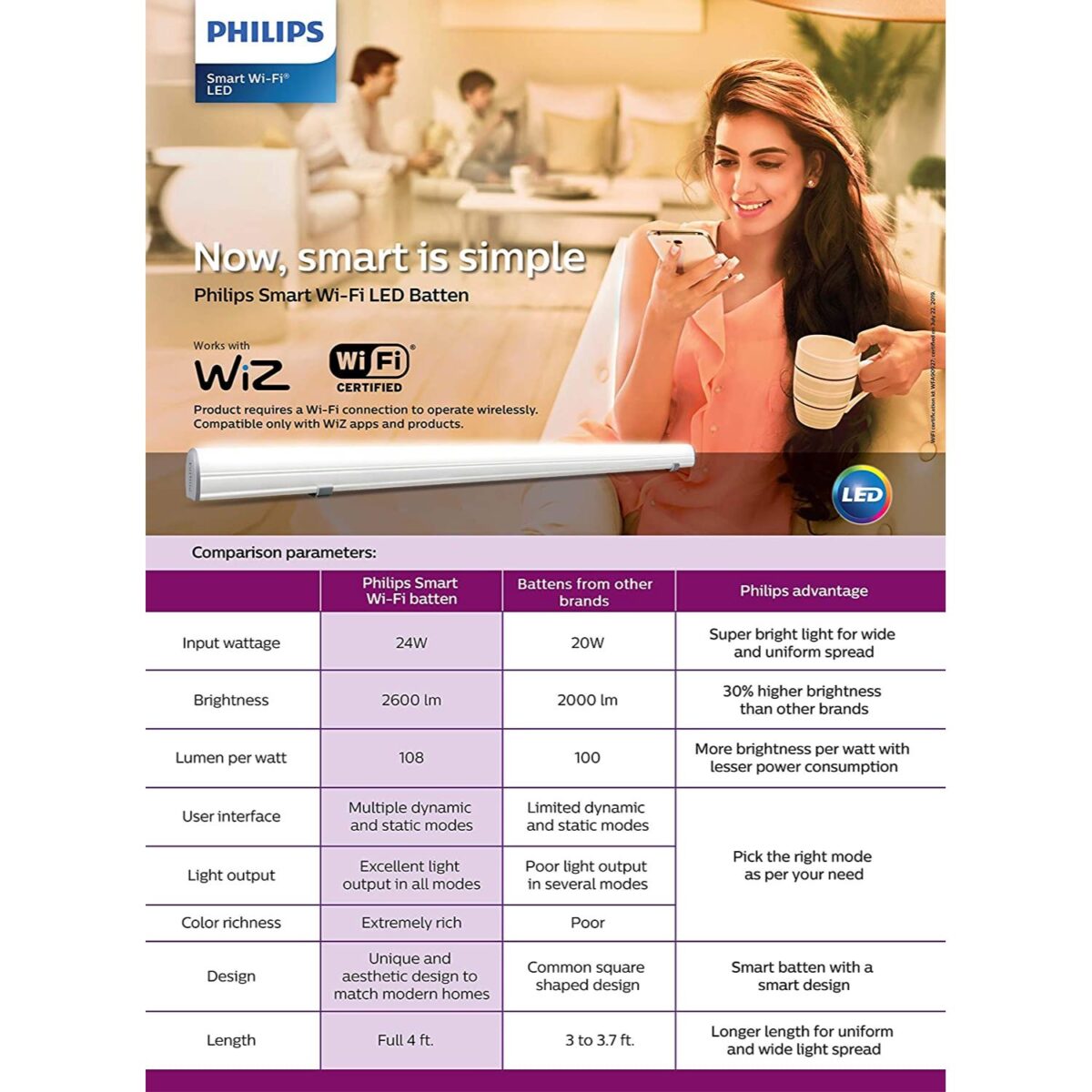 PHILIPS 24W SMART WI-FI WIZ CONNECTED TUNEABLE, DIMMABLE LED BATTEN PH1086