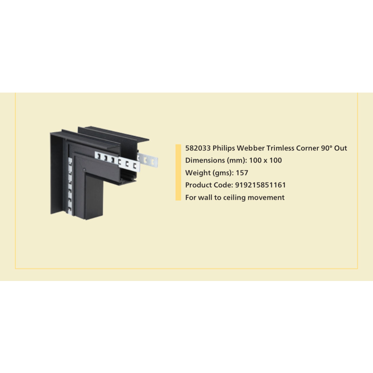 PHILIPS WEBBER 582033 TRIMLESS CORNER 90 DEGREES OUT FOR CEILING TO WALL MOVEMENT.