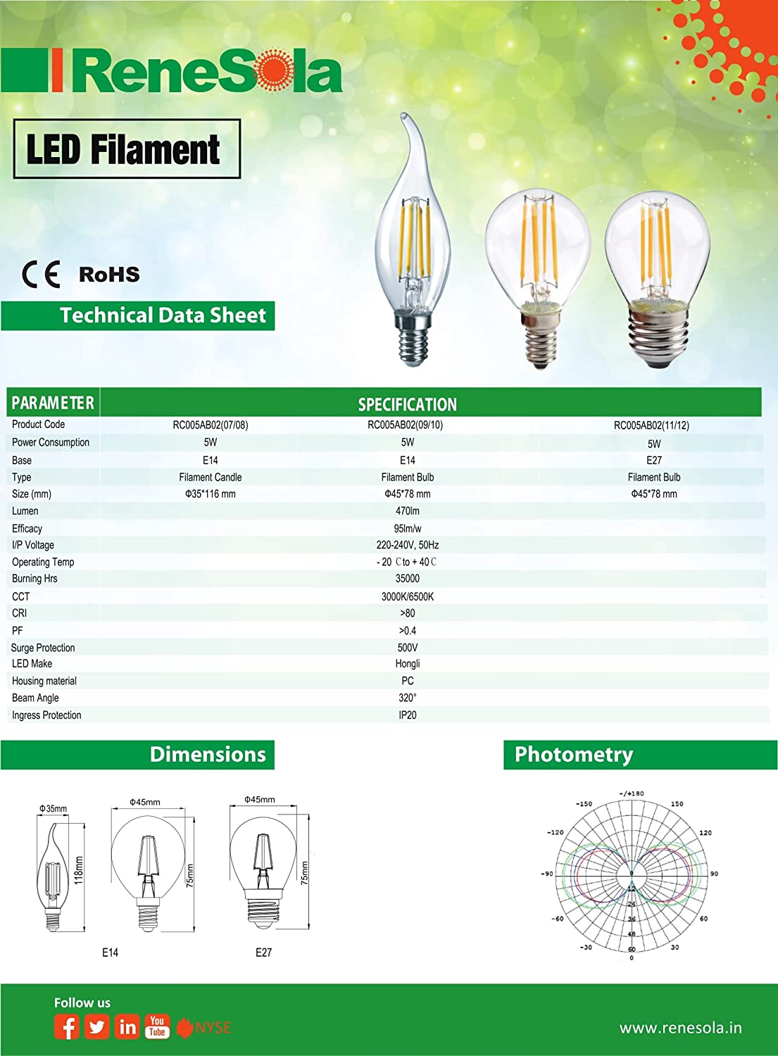 RENESOLA P45 E27 5 WATT LED FILAMENT BULB WARM WHITE 2700K RN1031
