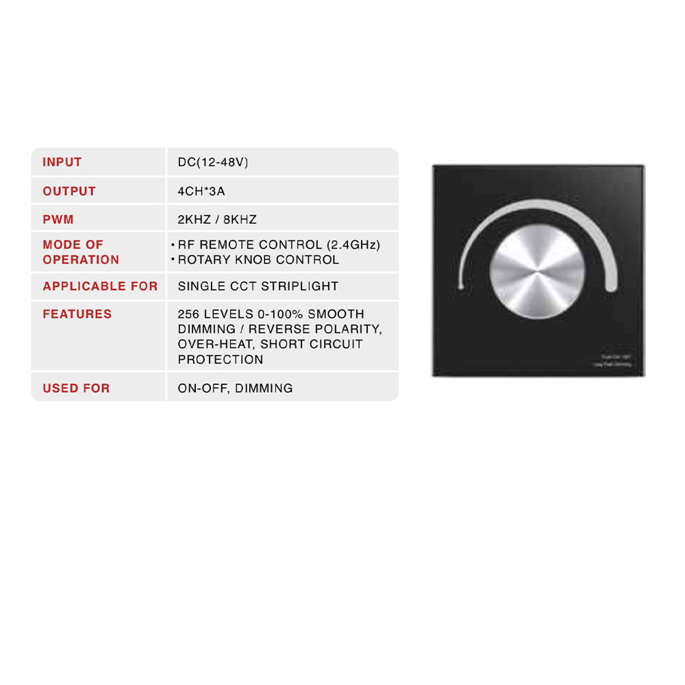 RF knob controller for 1 channel single CCT strip light used for on off and dimming operation.