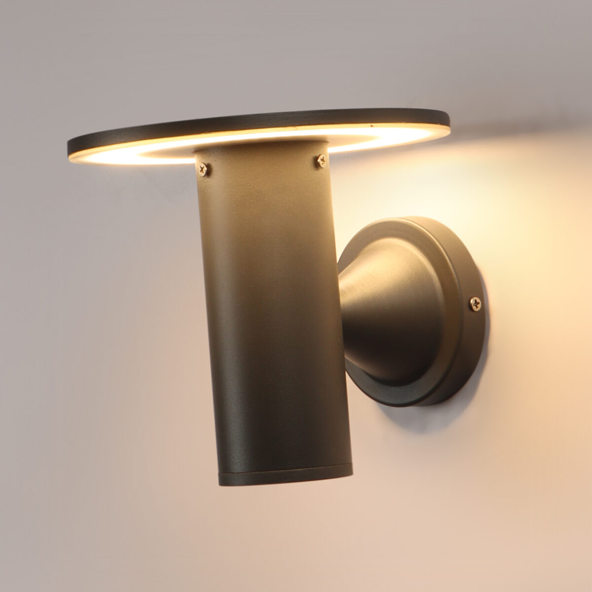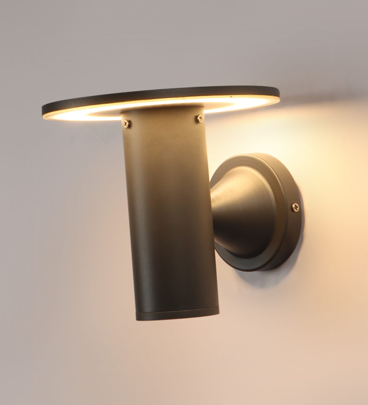 Circular, modern, aluminum die cast outdoor wall light in gray finish using high quality LED and driver with high success rate having less than 0.5% replacement. It is preferred by architects and designers. It is giving light output in downward direction. It can be used in both indoor and outdoor applications such as stair case walls, terrace walls, outdoor walls, boundary walls, open parking, stilt parking, basement parking, passage walls, entrance pillars. IP54 rated. Protection against splashed water can be customized as per requirement for bulk quantities. Similar variation in wall light WL2296. Matching bollards K1061-M, K1061-S, K1061-L.