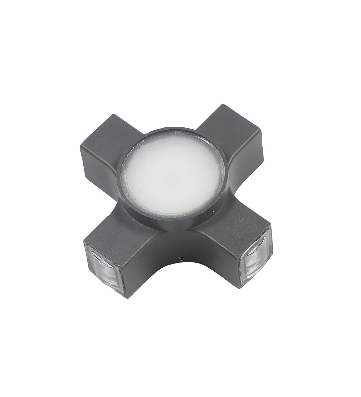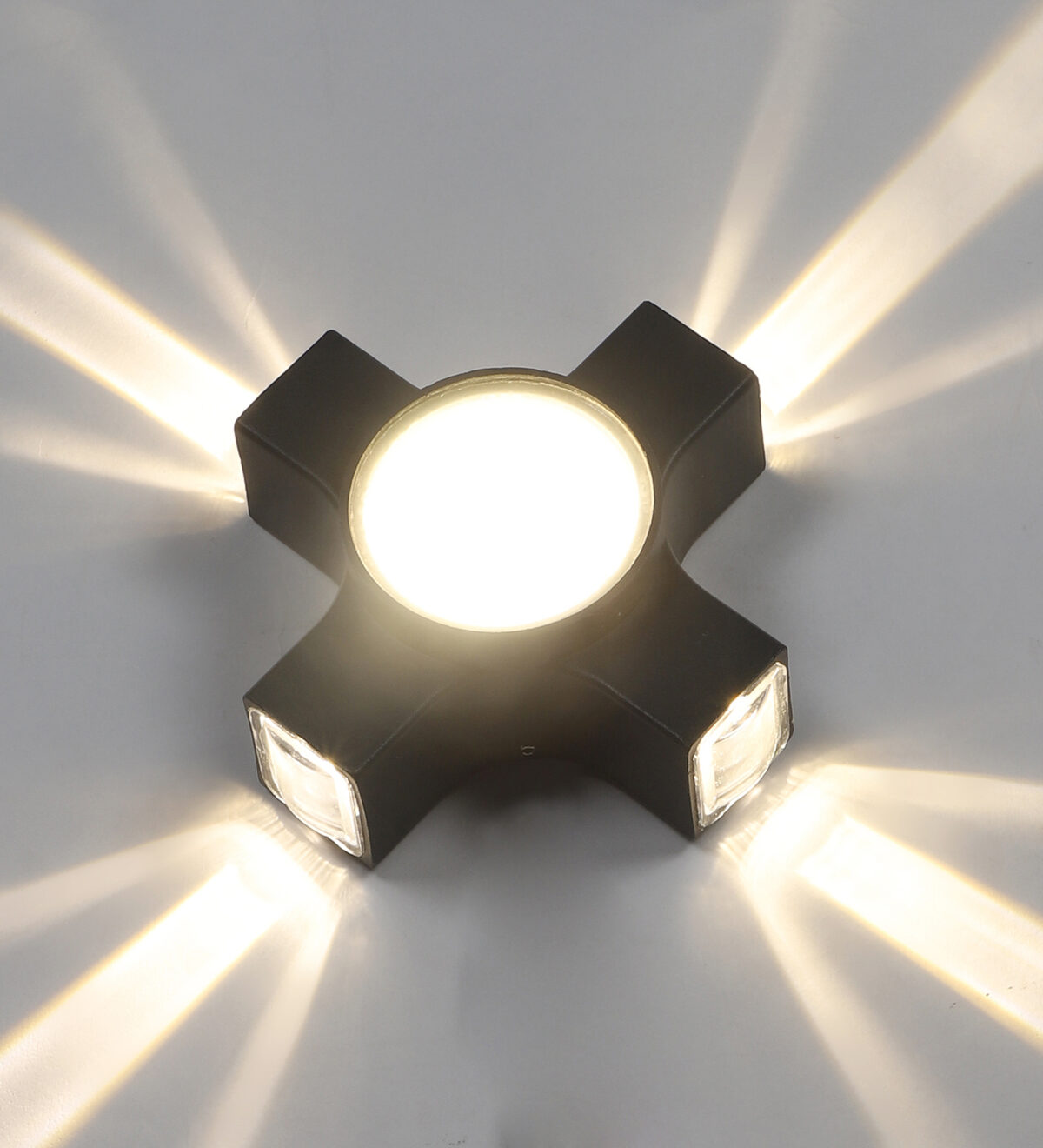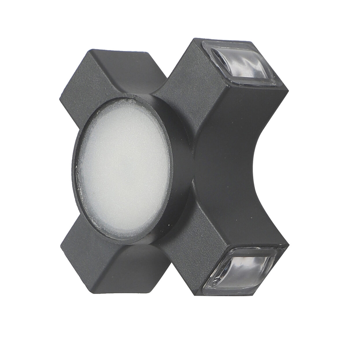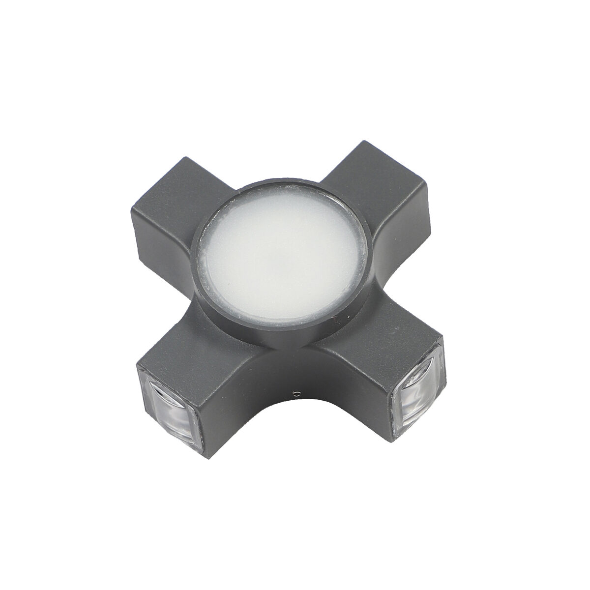 Elegant nicely shaped aluminum die cast outdoor wall light in grey finish using high quality LED and driver. It is a four way light with lens to enhance the output to give a defined beam spread in all the four directions. Central part also has light form general lighting.This in combination with multiple pieces is preferred by the lighting designers to create a lighting effect in a single wide wall, and multiple units are used to create the design.
