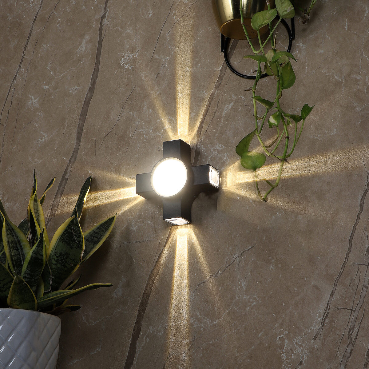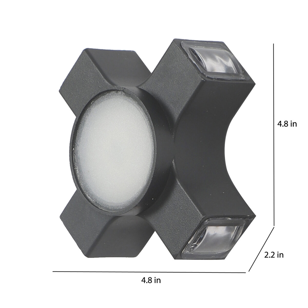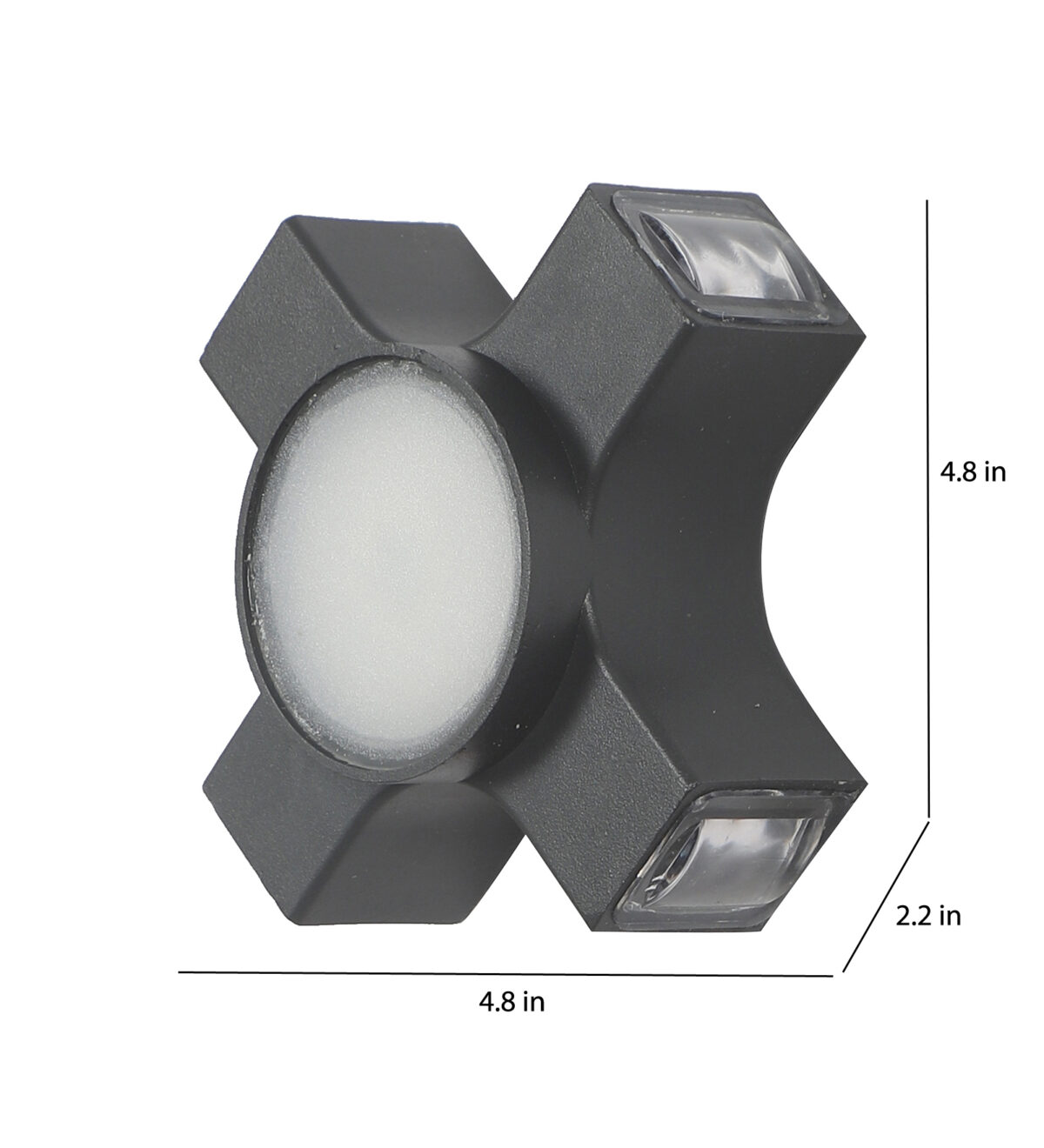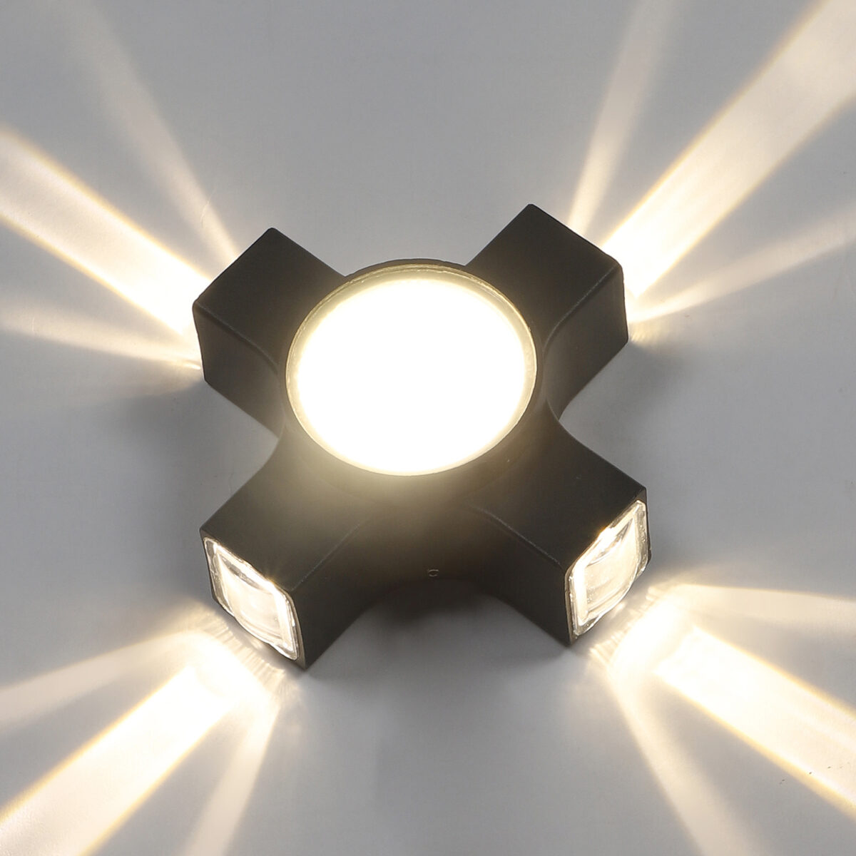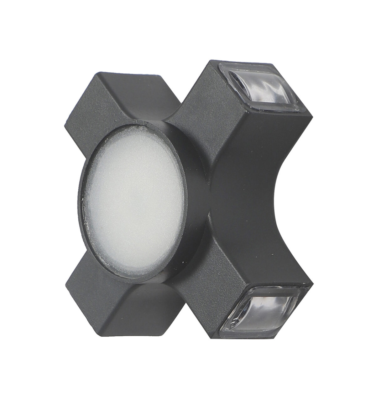 Elegant nicely shaped aluminum die cast outdoor wall light in grey finish using high quality LED and driver. It is a four way light with lens to enhance the output to give a defined beam spread in all the four directions. Central part also has light form general lighting.This in combination with multiple pieces is preferred by the lighting designers to create a lighting effect in a single wide wall, and multiple units are used to create the design.