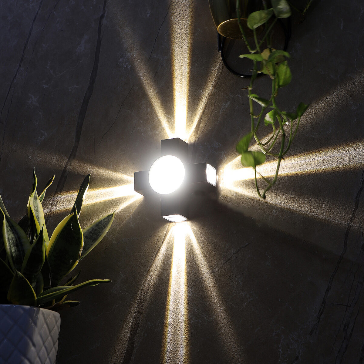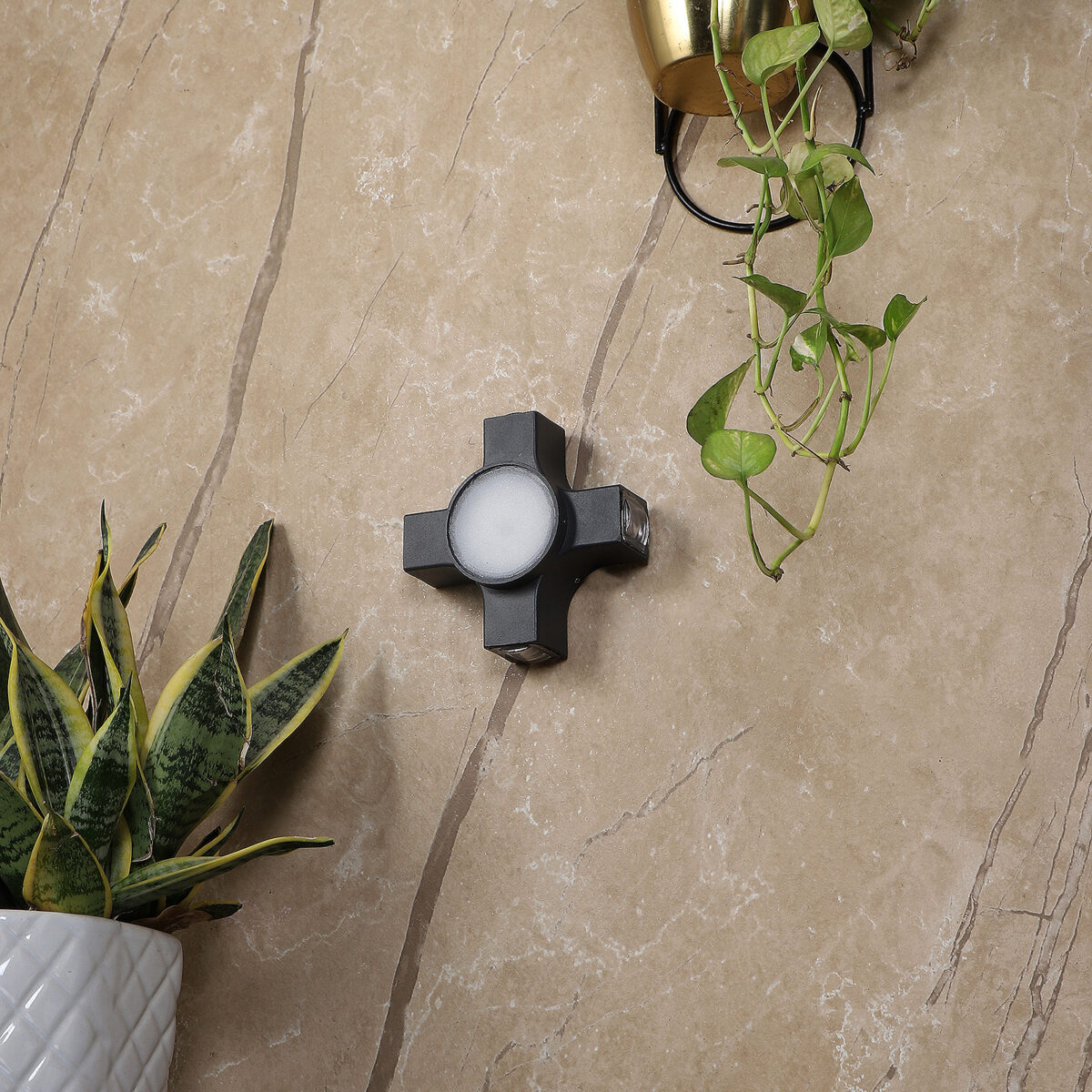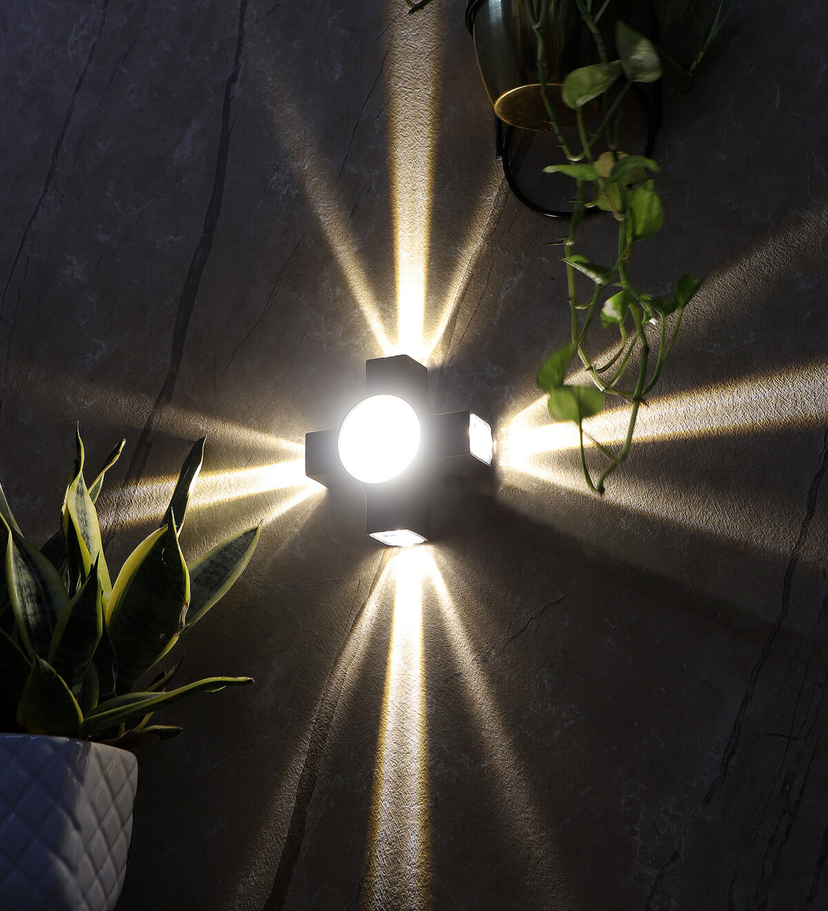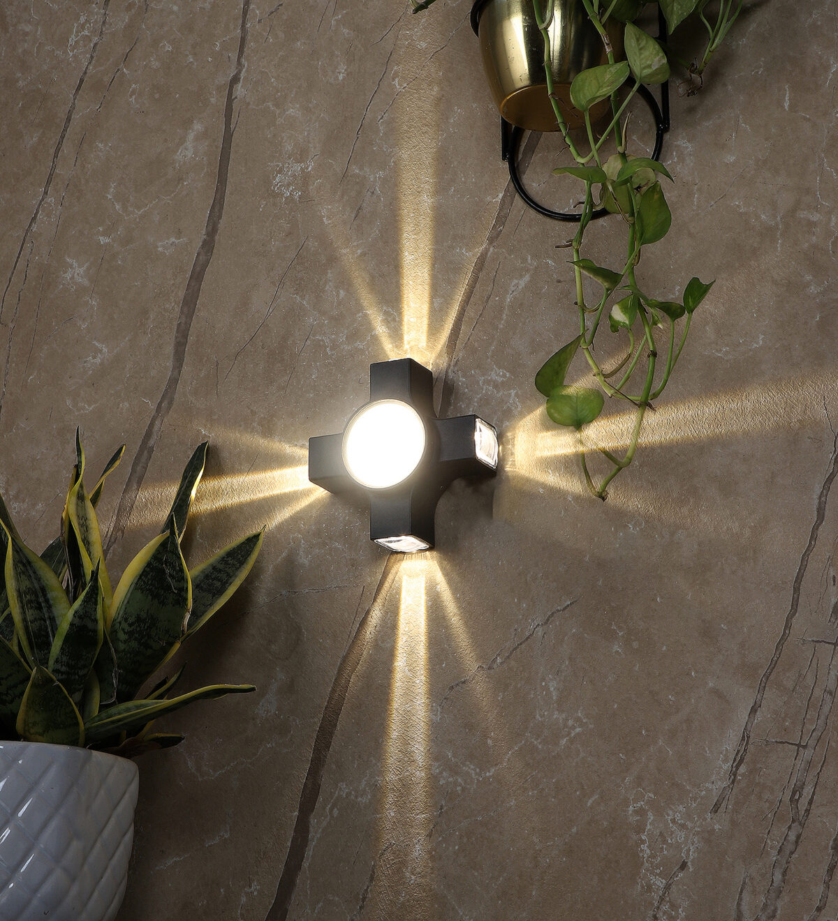 Elegant nicely shaped aluminum die cast outdoor wall light in grey finish using high quality LED and driver. It is a four way light with lens to enhance the output to give a defined beam spread in all the four directions. Central part also has light form general lighting.This in combination with multiple pieces is preferred by the lighting designers to create a lighting effect in a single wide wall, and multiple units are used to create the design.