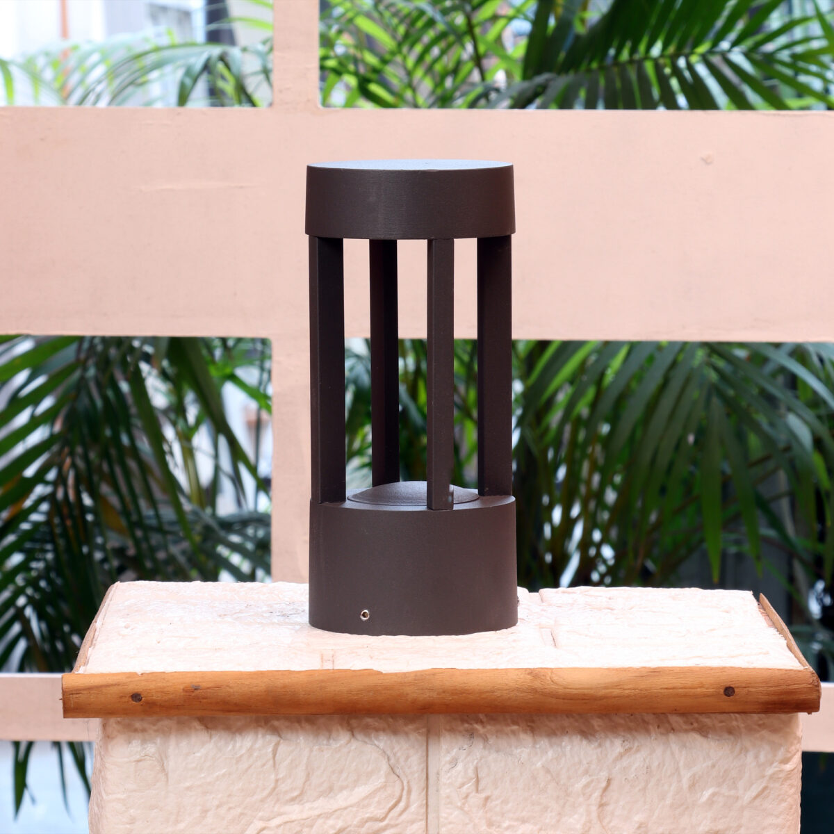 Modern sleek aluminium die cast gate pillar post light in grey finish having indirect lighting effect, using high quality LED and driver with high success rate having less than 0.5% replacement. IP 54 rated, providing protection from sprayed water in any direction and making this light perfect for use outdoors. Application areas include building entrance, on top of terrace walls, terrace gardens, boundary walls, open parking, stilt parking.