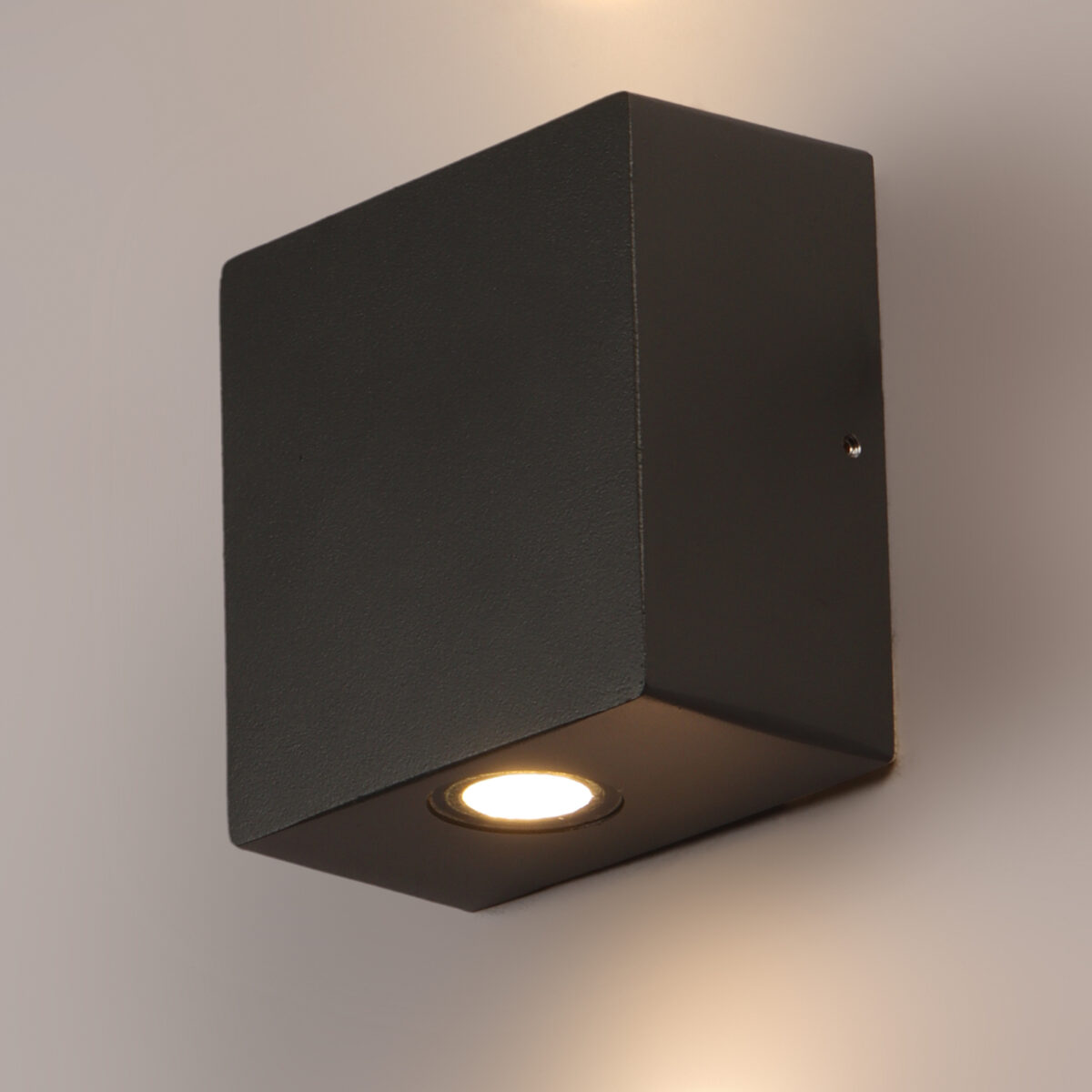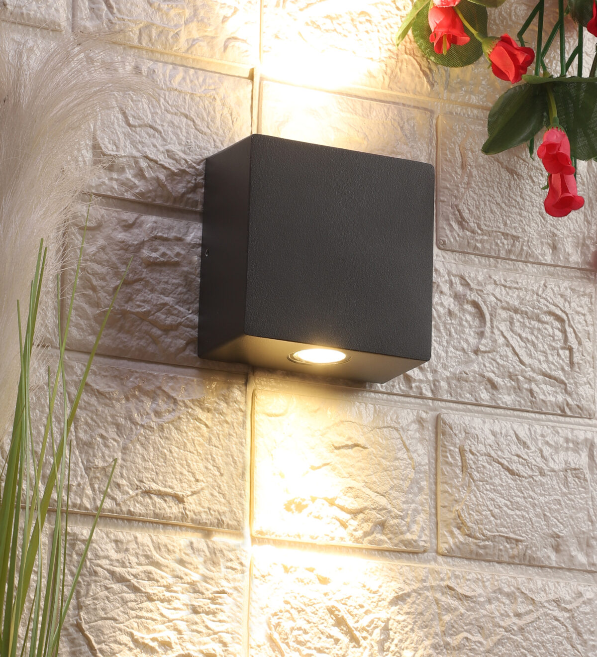 Square up and down, aluminum die cast outdoor wall light in gray finish using high quality LED and driver with high success rate having less than 0.5% replacement. Also available in one way, three way and four way design. It is a two way light providing light in two directions. This in combination with its variants is preferred by the lighting designers to create a lighting effect in a single wide wall, and multiple units are used to create the design. It can be used in both indoor and outdoor applications such as stair case walls, terrace walls, outdoor walls, boundary walls, open parking, stilt parking, basement parking, passage walls. IP54 rated. Protection against splashed water can be customized as per requirement for bulk quantities.