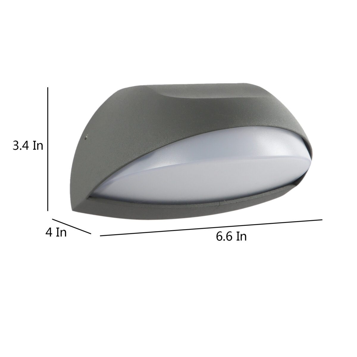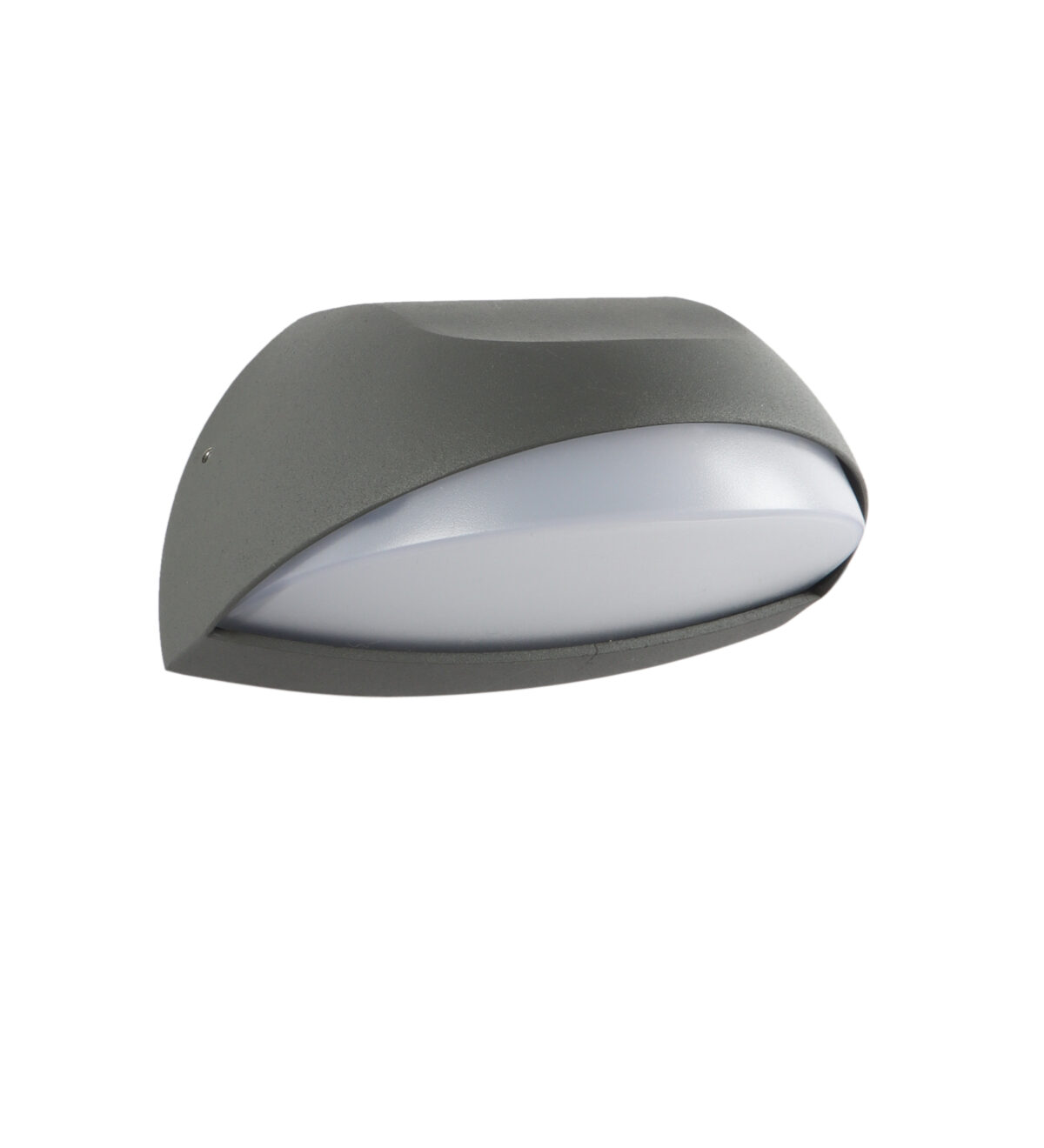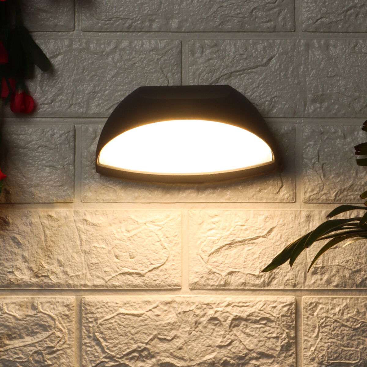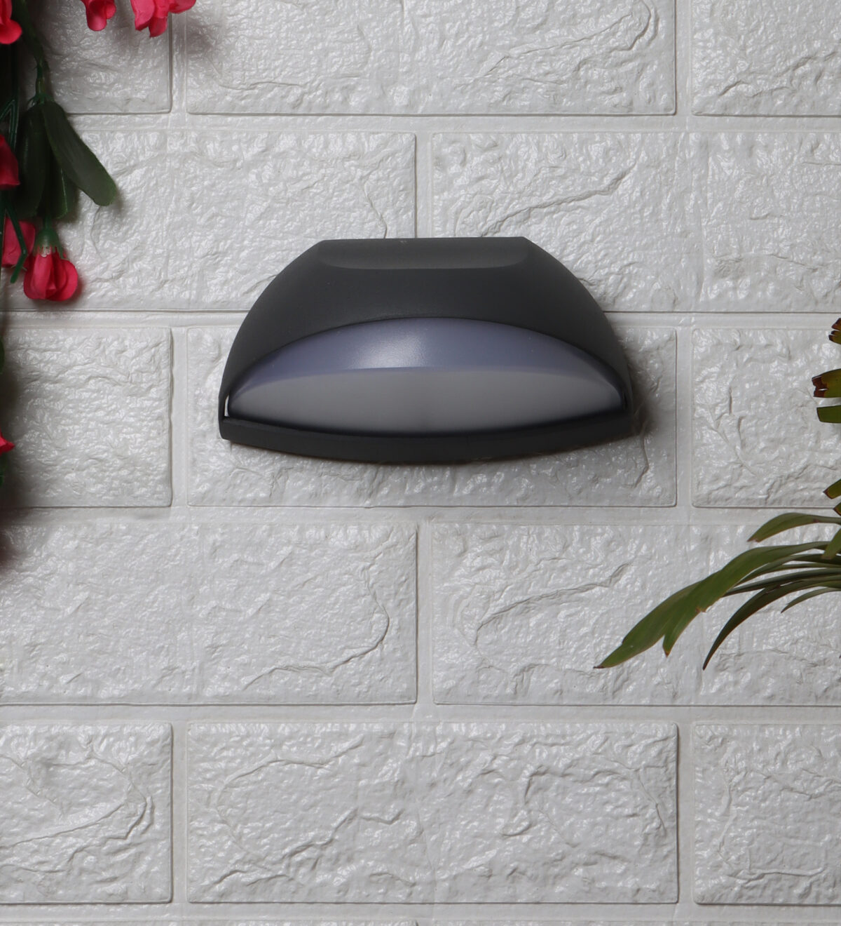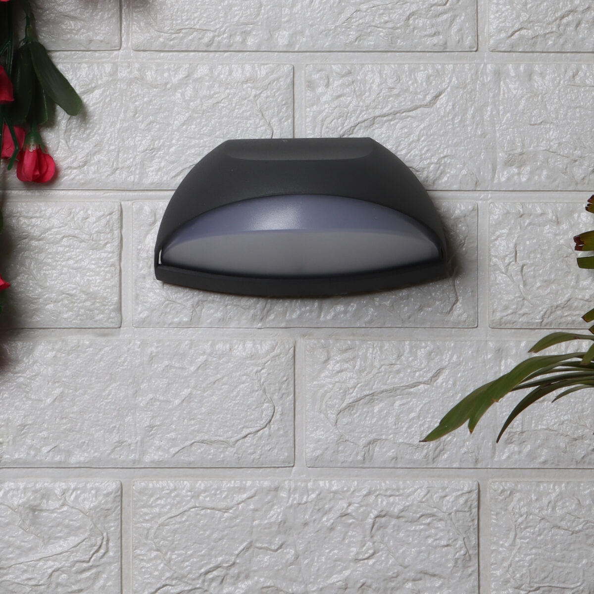 Compact, semi circular, aluminium die cast modern outdoor wall light in grey finish, using high quality LED and driver with high success rate having less than 0.5% replacement. IP65 rated, providing protection from sprayed water in any direction and making this light perfect for use outdoors. It can also be used in indoor applications. Application areas include Stair case walls, passage to staircase, terrace walls, terrace gardens outdoor walls, boundary walls, open parking, stilt parking, basement parking, balcony. Can also be used in place of a bulkhead.