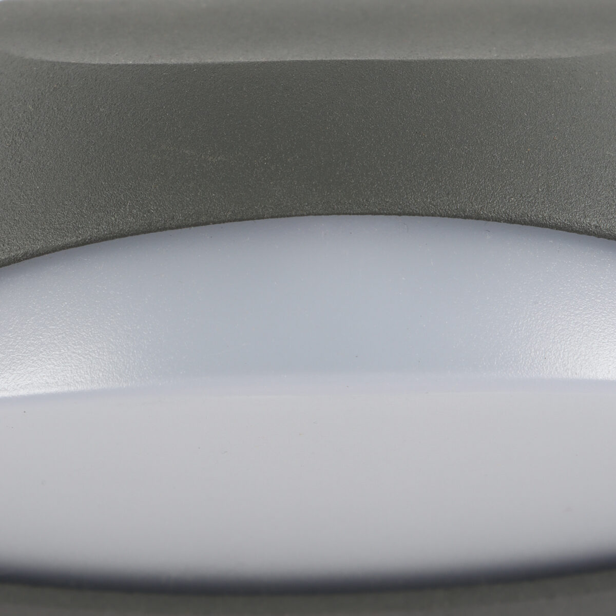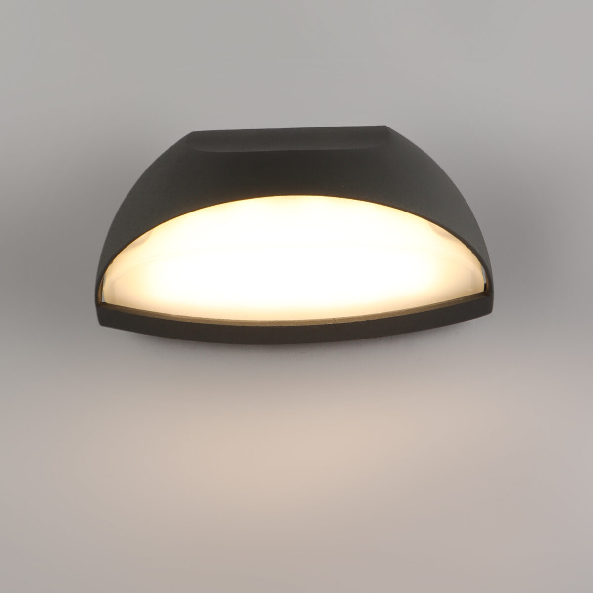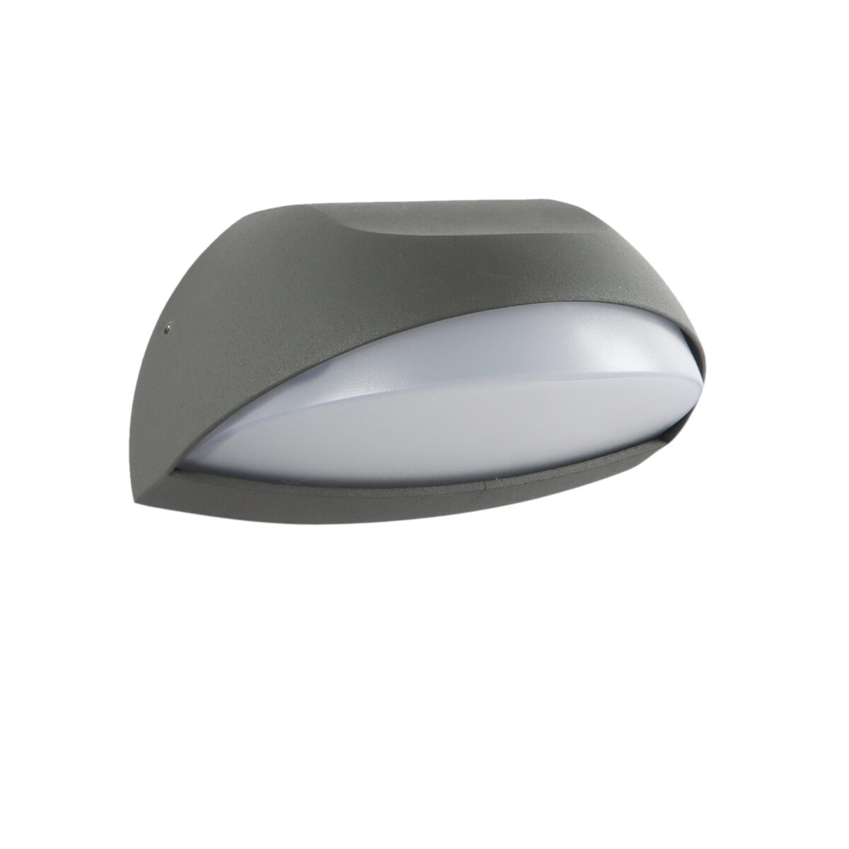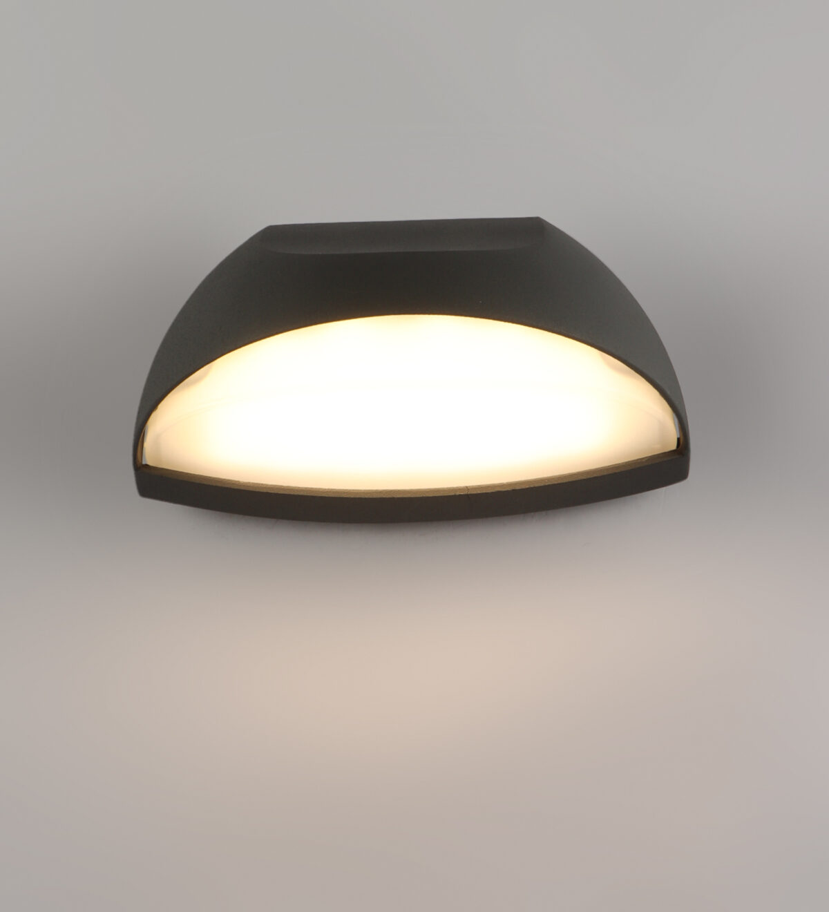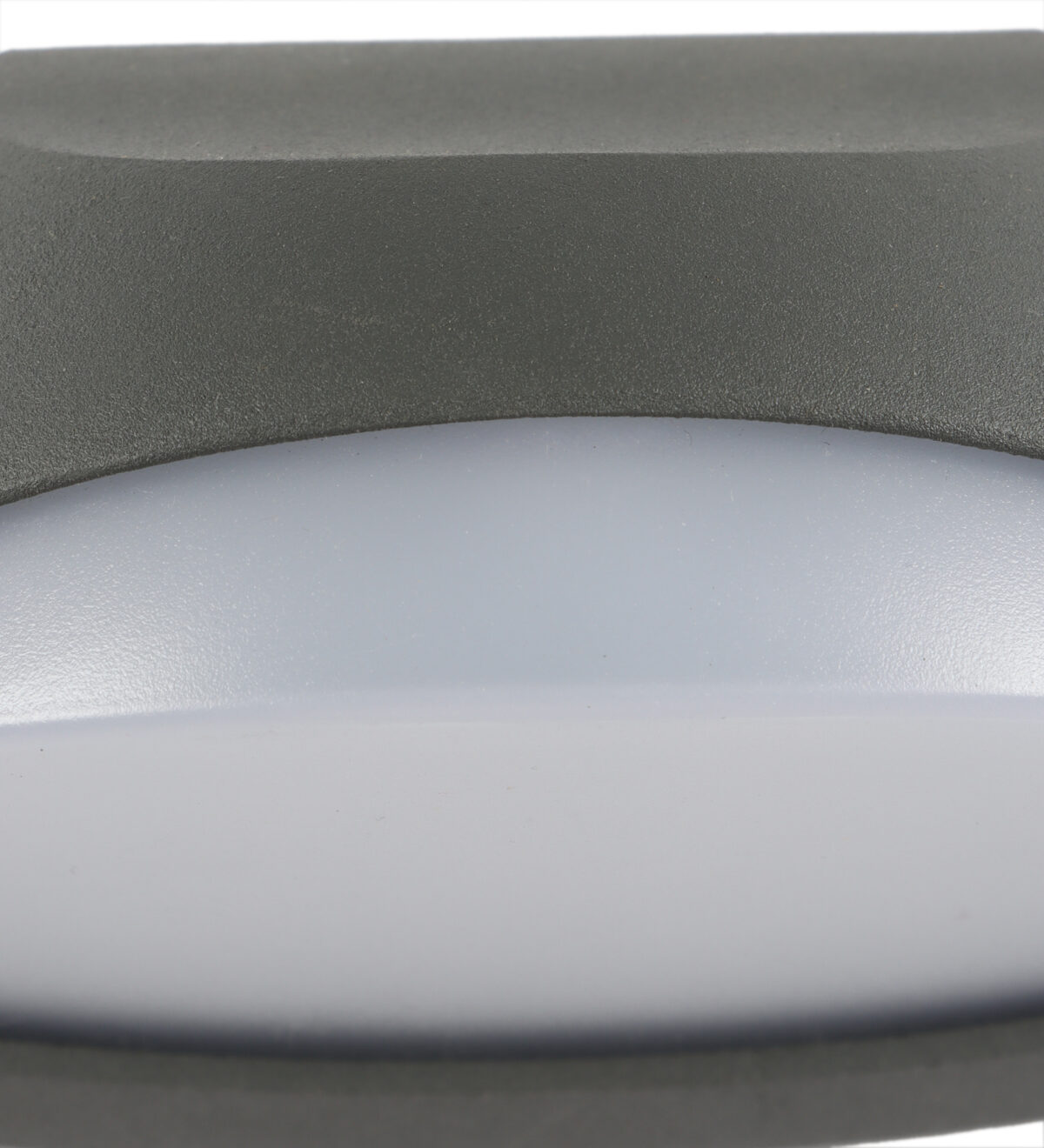 Compact, semi circular, aluminium die cast modern outdoor wall light in grey finish, using high quality LED and driver with high success rate having less than 0.5% replacement. IP65 rated, providing protection from sprayed water in any direction and making this light perfect for use outdoors. It can also be used in indoor applications. Application areas include Stair case walls, passage to staircase, terrace walls, terrace gardens outdoor walls, boundary walls, open parking, stilt parking, basement parking, balcony. Can also be used in place of a bulkhead.