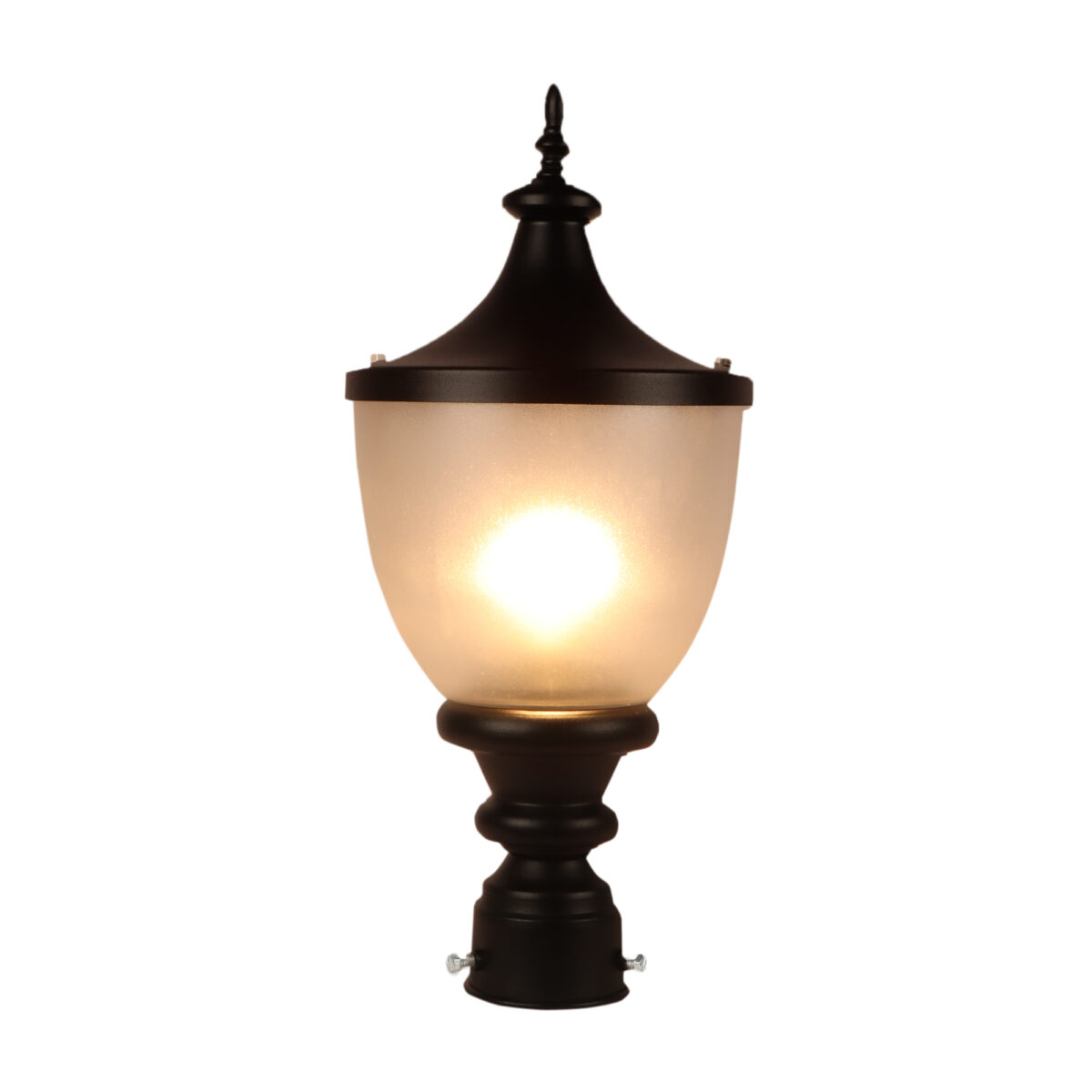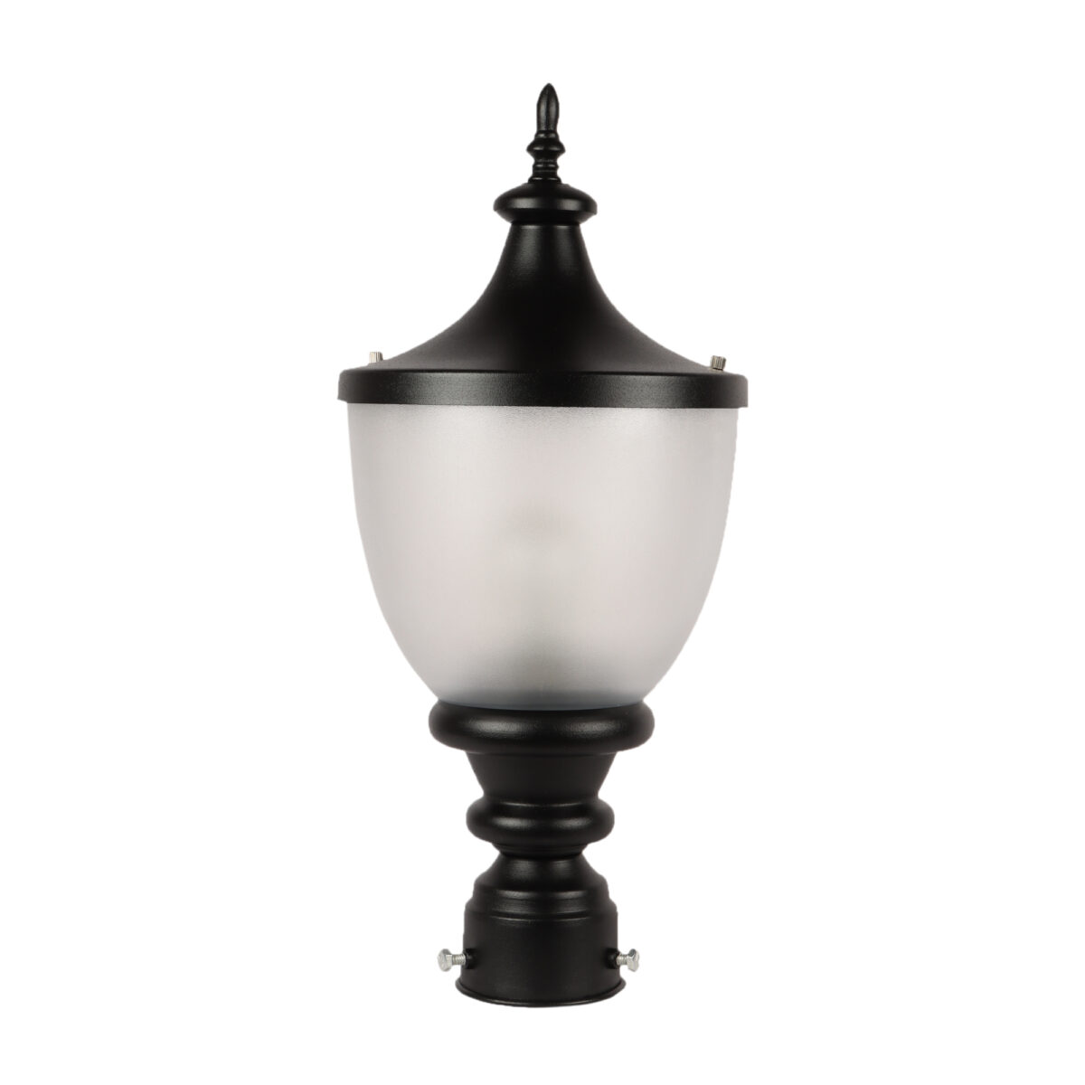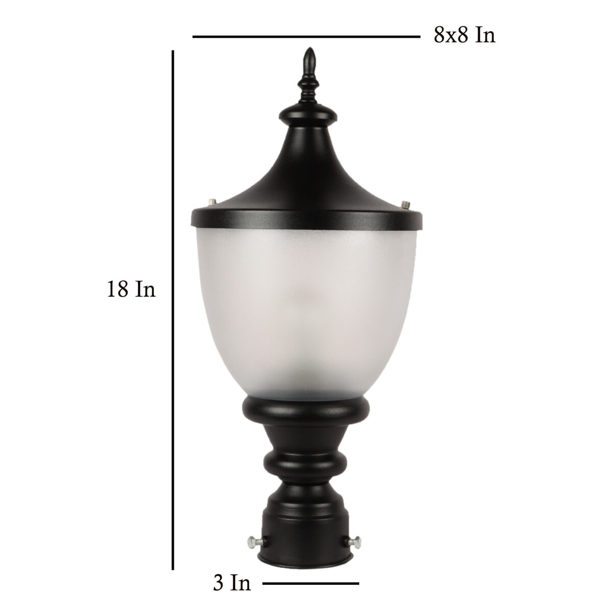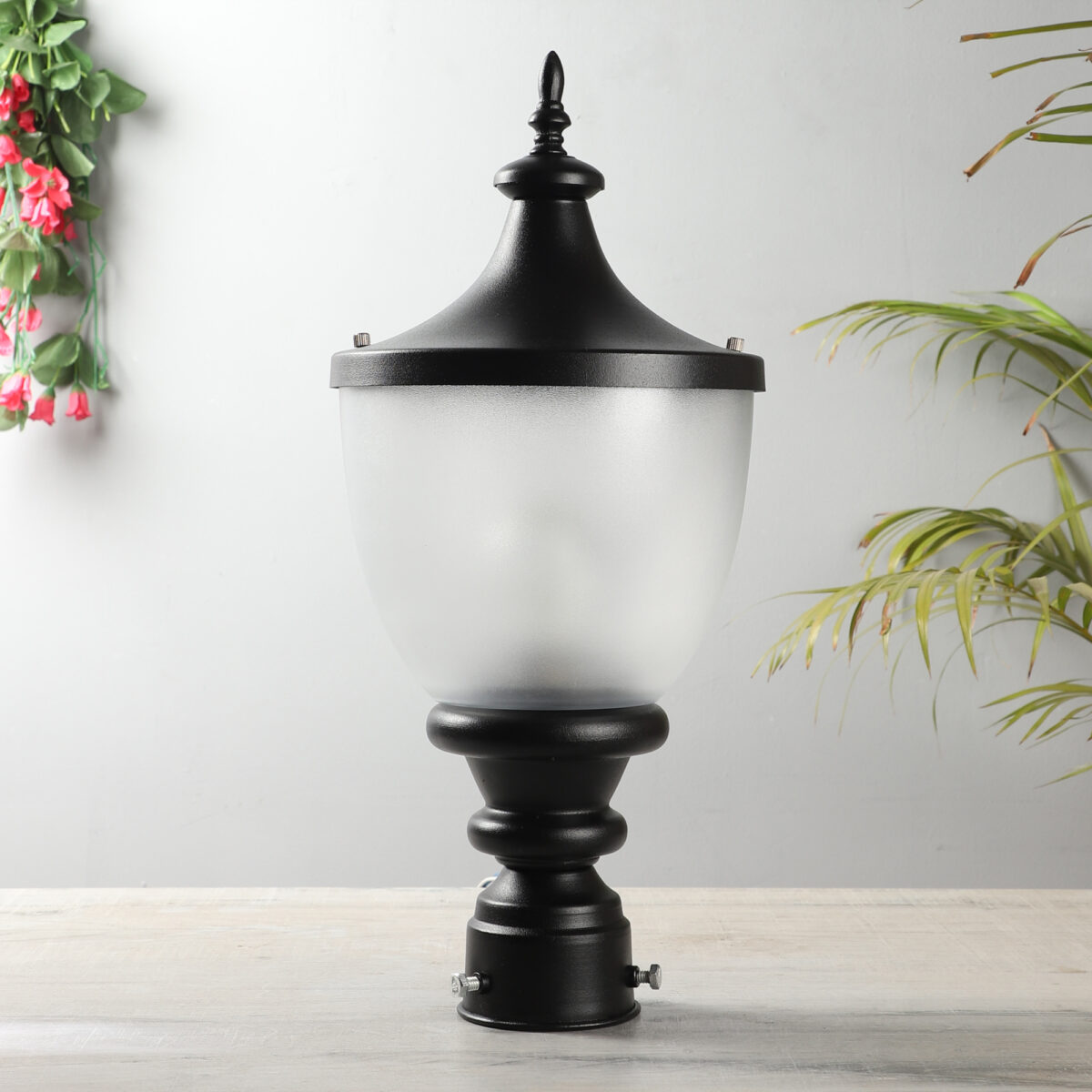 Traditional aluminium die cast, export quality gate pillar post light in black finish. It is maintenance free, comes with an B22 holder, only the change of lamp is required, which is available locally everywhere You can of course swap out the bulb for one that is dimmable, has a higher light output or a different color temperature. High quality acrylic is used to withstand tough weather conditions. IP54 rated, providing protection from sprayed water in any direction and making this light perfect for use outdoors.Application areas include building entrance, on top of terrace walls, terrace gardens, boundary walls, open parking, stilt parking. Matching wall light – WL1197, Matching Pendant – HL3754.