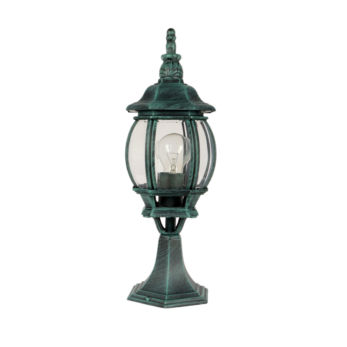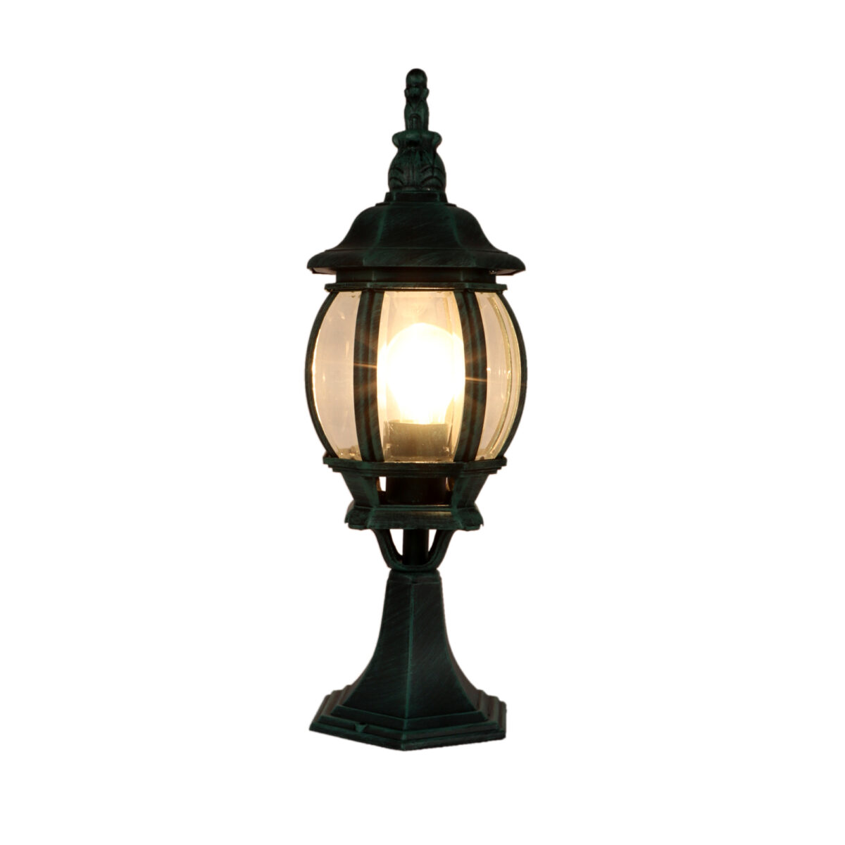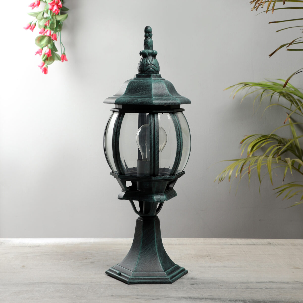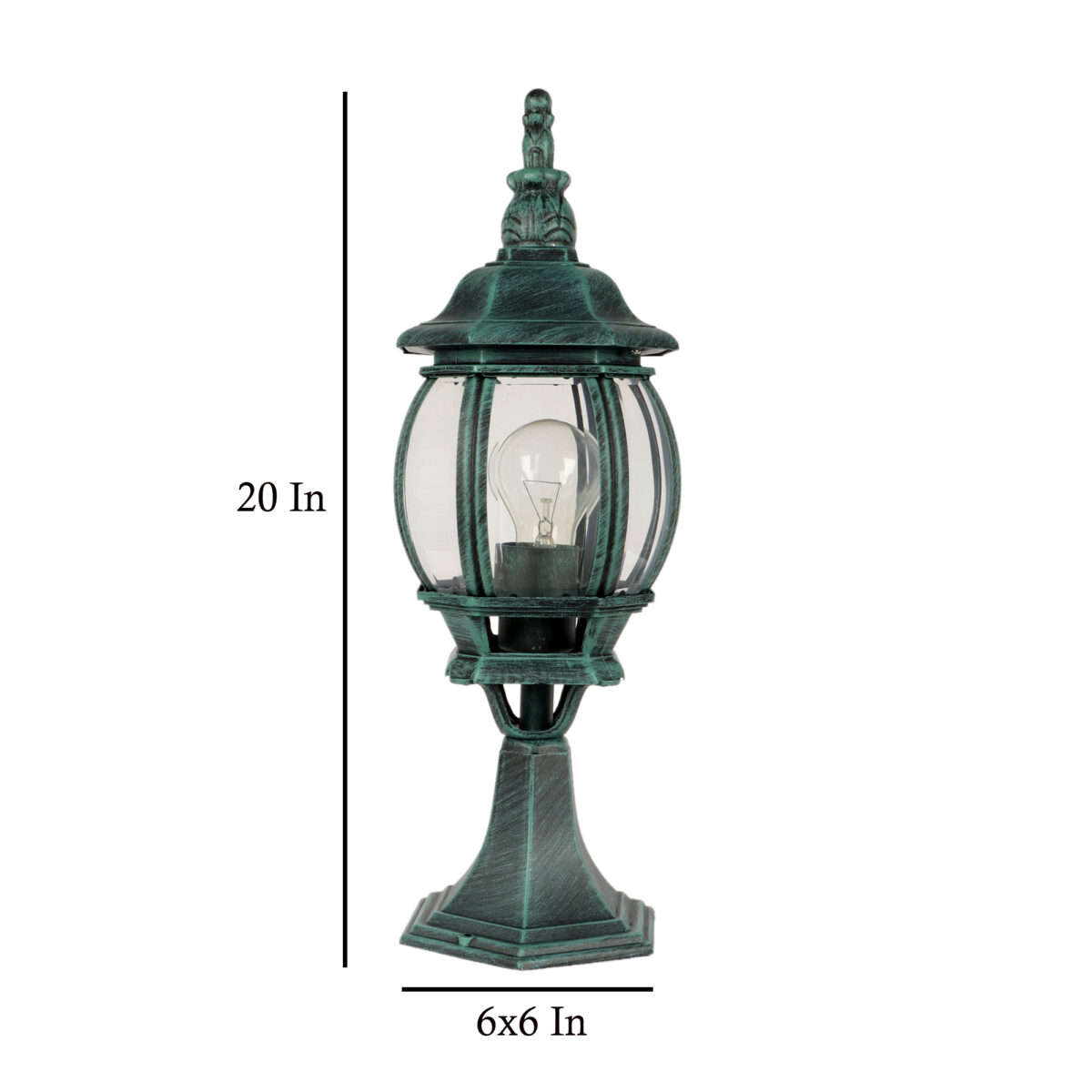 Traditional aluminium sheet gate pillar post light in attractive green finish. It is maintenance free, comes with an E27 holder, only the change of lamp is required, which is available locally everywhere You can of course swap out the bulb for one that is dimmable, has a higher light output or a different color temperature. IP 54 rated, providing protection from sprayed water in any direction and making this light perfect for using outdoors. Application areas include building entrance, on top of terrace walls, terrace gardens, boundary walls, open parking, stilt parking. Available in two sizes with code of bigger size as GL4784, Matching wall light code – WL2306.