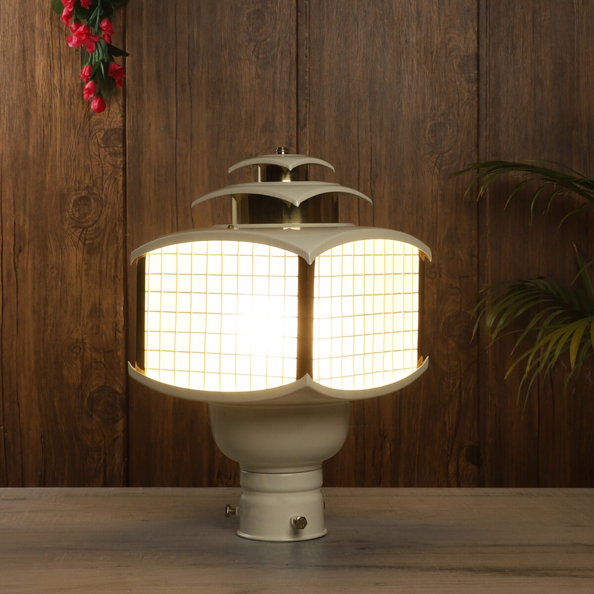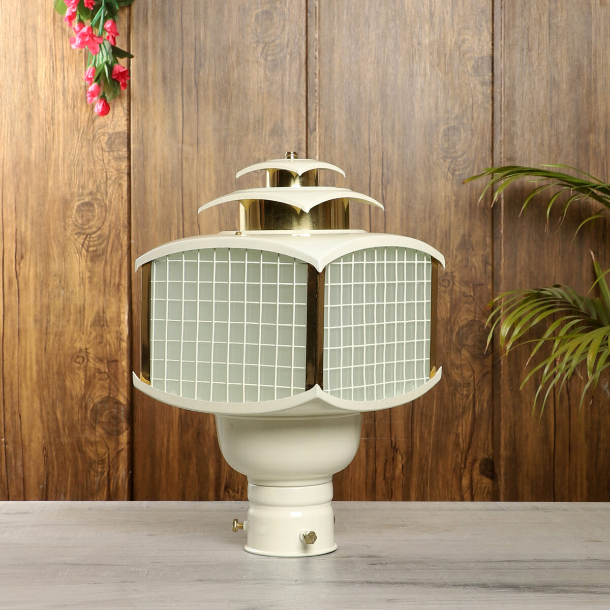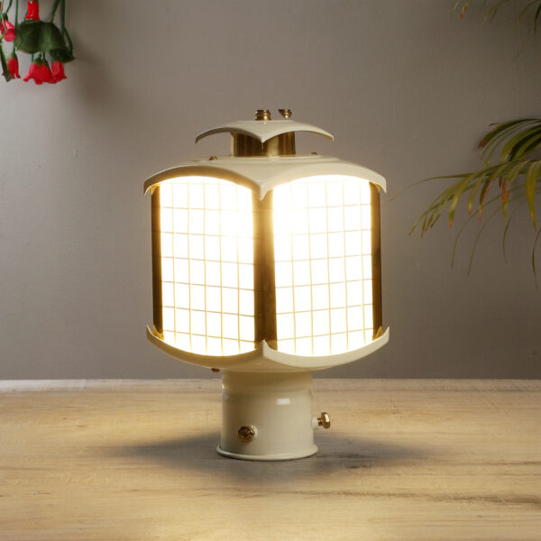Traditional aluminium sheet, export quality gate pillar post light in cream finish. It is maintenance free, comes with an B22 holder, only the change of lamp is required, which is available locally everywhere You can of course swap out the bulb for one that is dimmable, has a higher light output or a different color temperature. IP54 rated, providing protection from sprayed water in any direction and making this light perfect for use outdoors. Application areas include building entrance, on top of terrace walls, terrace gardens, boundary walls, open parking, stilt parking. Available in two sizes. Smaller size code- GL4785.