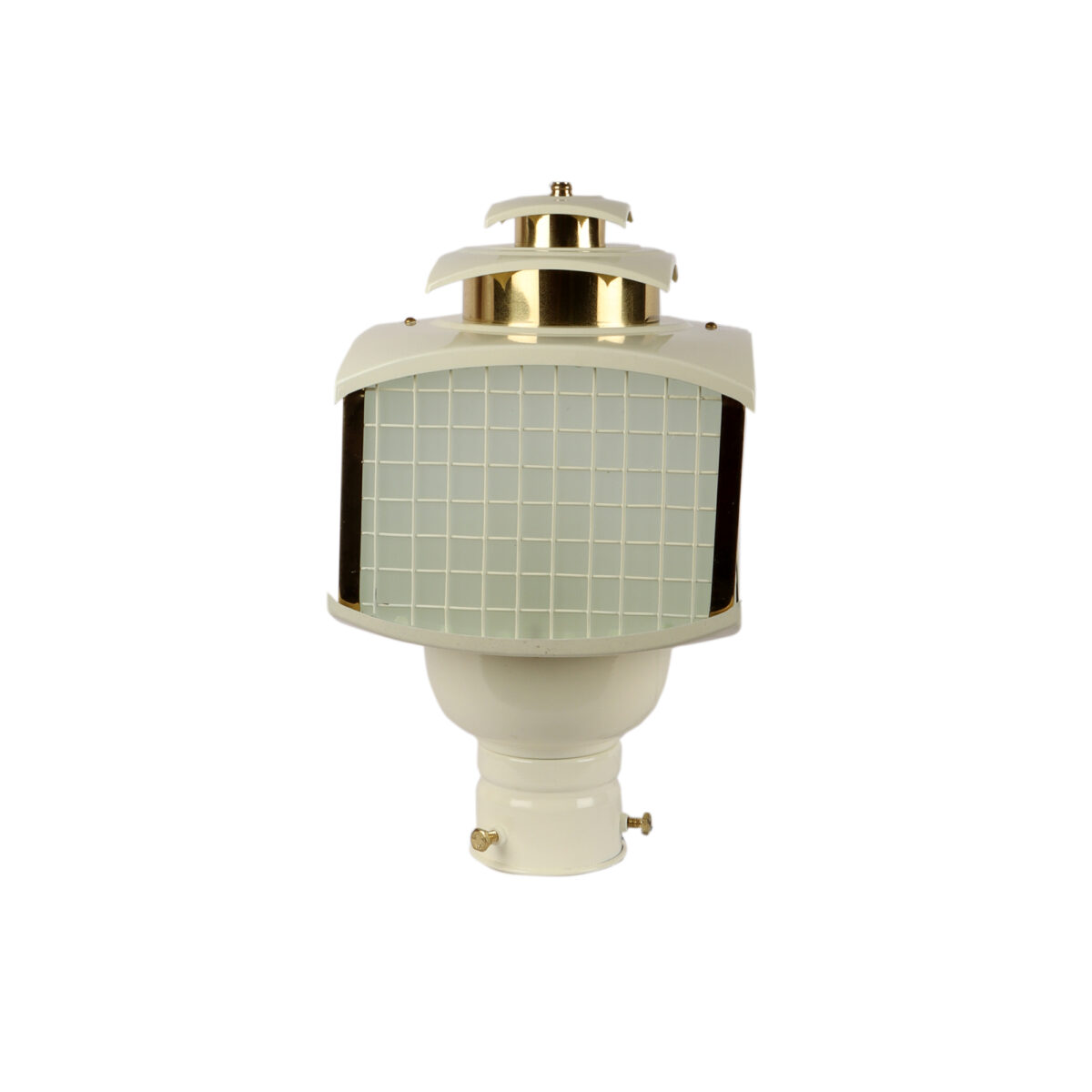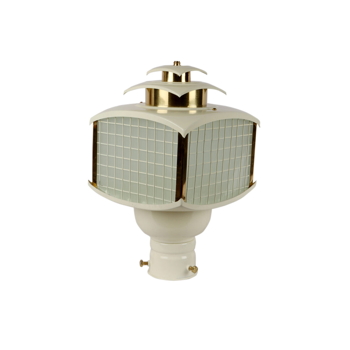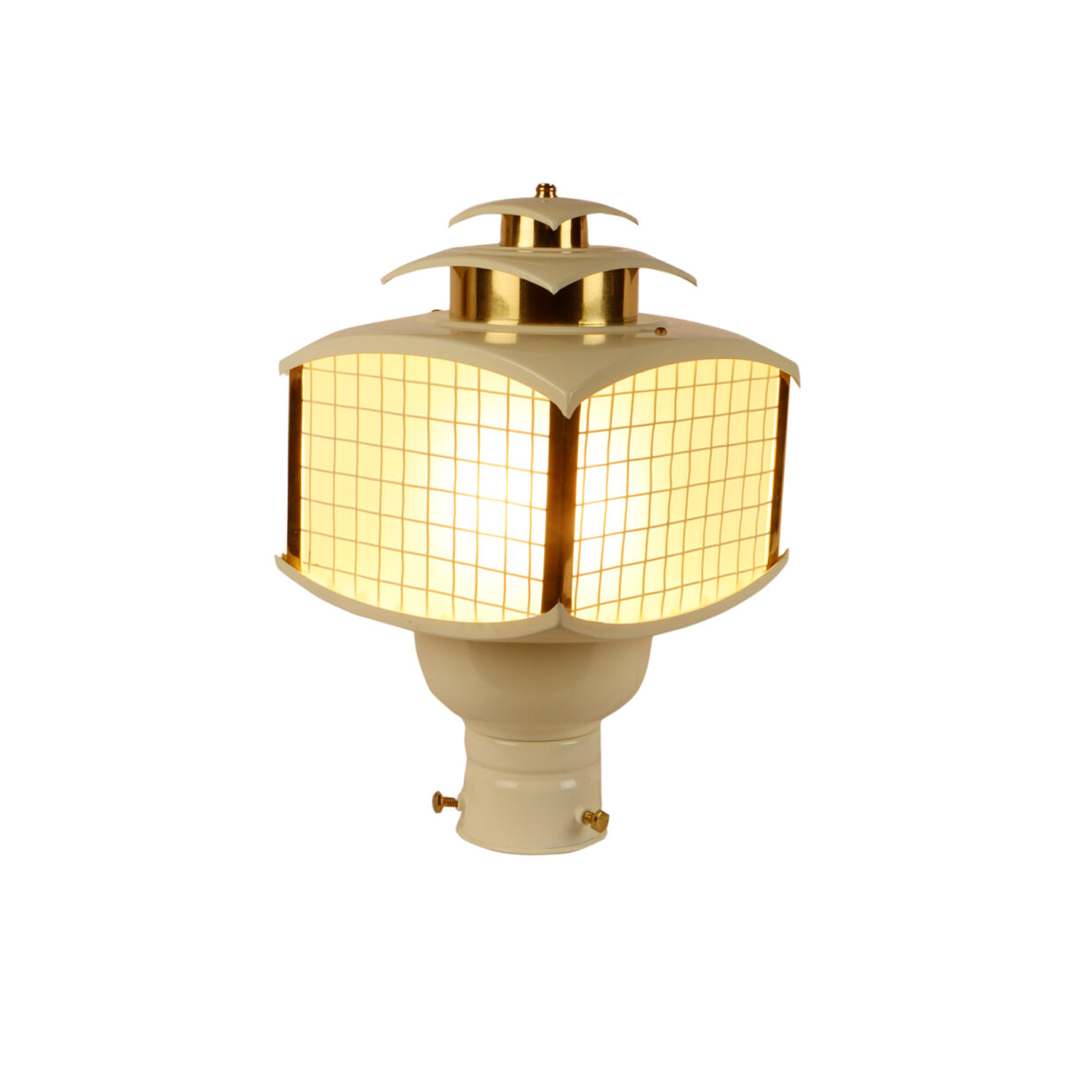 Traditional aluminium sheet, export quality gate pillar post light in cream finish. It is maintenance free, comes with an B22 holder, only the change of lamp is required, which is available locally everywhere You can of course swap out the bulb for one that is dimmable, has a higher light output or a different color temperature. IP54 rated, providing protection from sprayed water in any direction and making this light perfect for use outdoors. Application areas include building entrance, on top of terrace walls, terrace gardens, boundary walls, open parking, stilt parking. Available in two sizes. Smaller size code- GL4785.