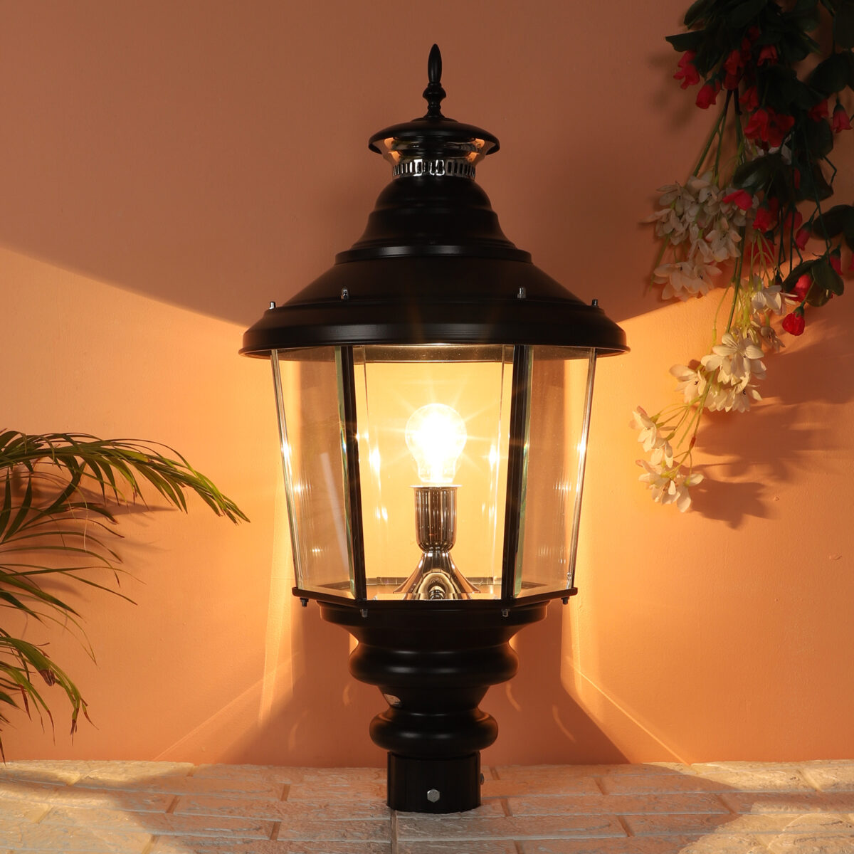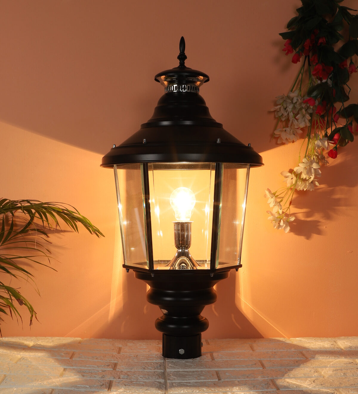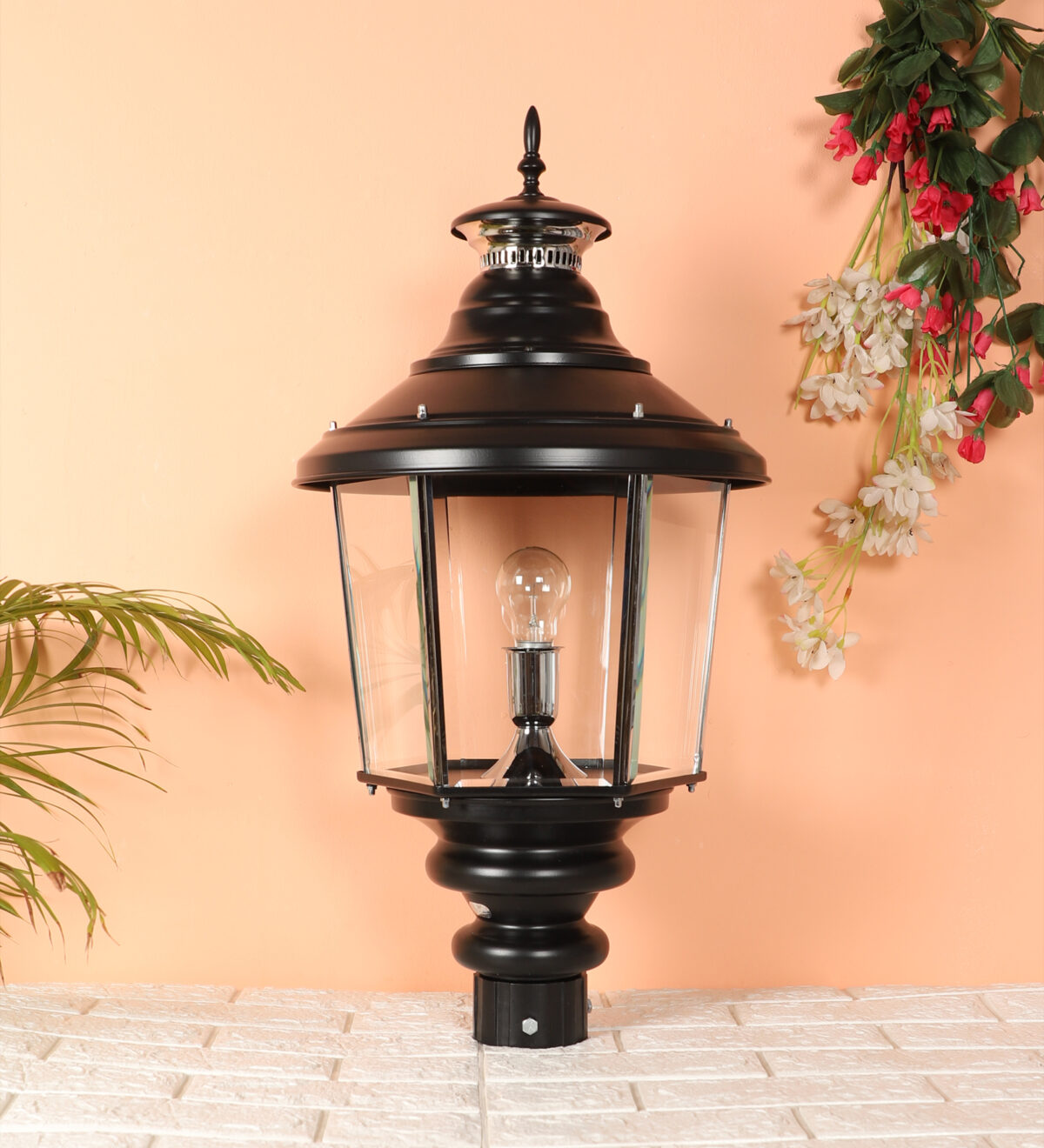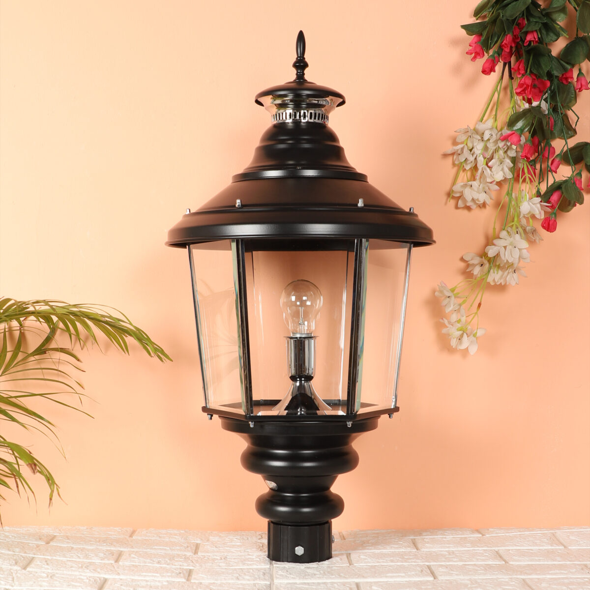 Traditional aluminium sheet, export quality gate pillar post light in black finish. It is maintenance free, comes with an B22 holder, only the change of lamp is required, which is available locally everywhere You can of course swap out the bulb for one that is dimmable, has a higher light output or a different color temperature. IP 54 rated, providing protection from sprayed water in any direction and making this light perfect for use outdoors. Application areas include building entrance, on top of terrace walls, terrace gardens, boundary walls, open parking, stilt parking. Also available in small size with code GL4659, GL4763. Matchnig wall light code WL1831, WL2071. MAtching Hanging code – HL6059. Matching bollard code K1066. LAMP NOT INCLUDED.