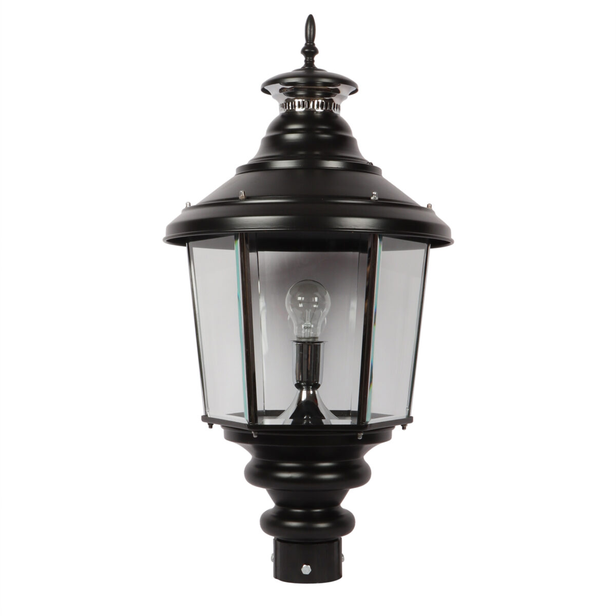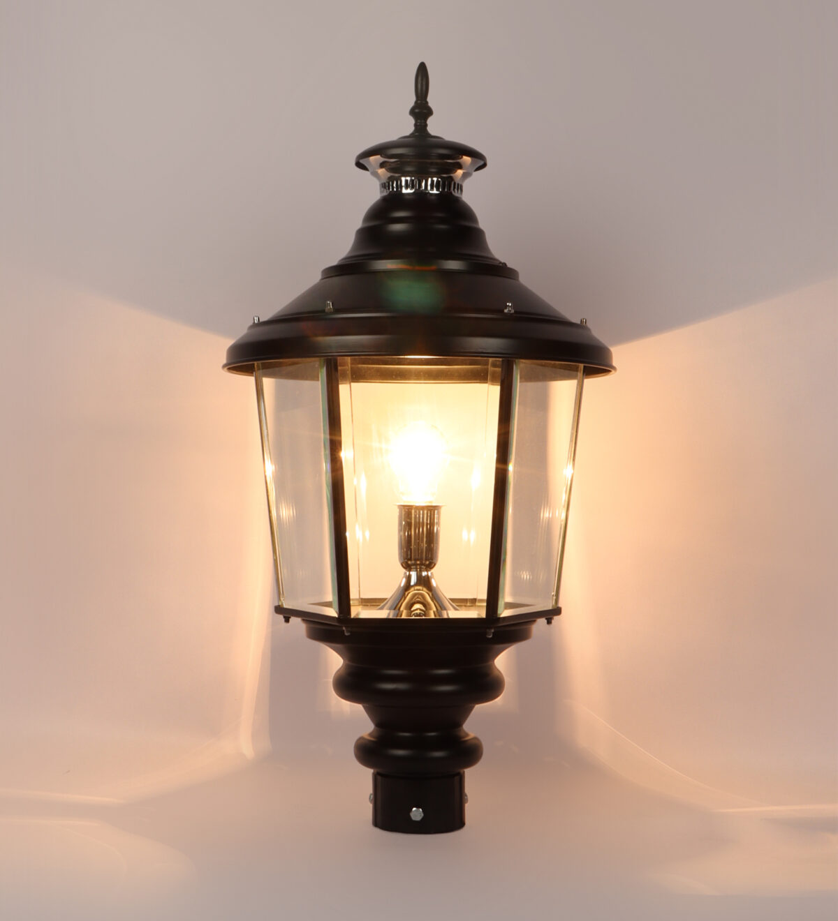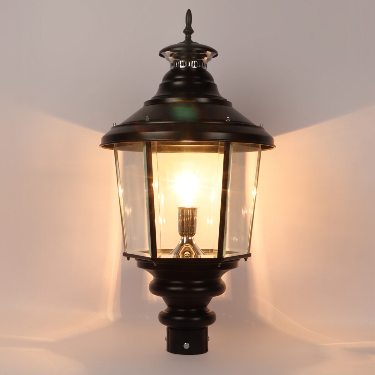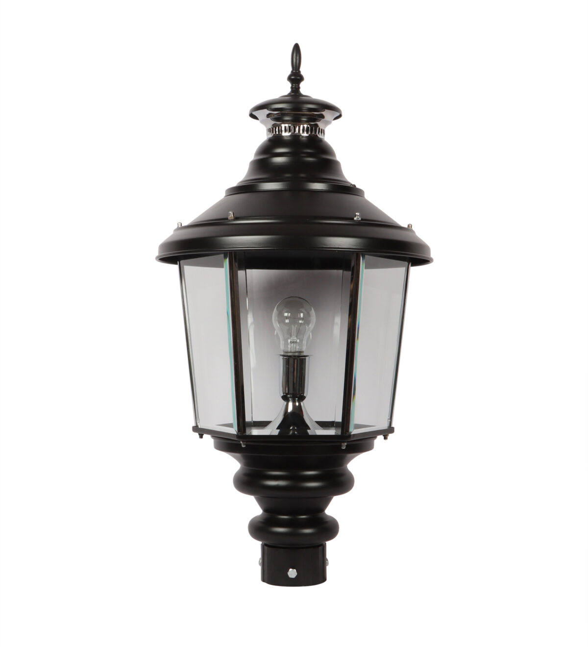 Traditional aluminium sheet, export quality gate pillar post light in black finish. It is maintenance free, comes with an B22 holder, only the change of lamp is required, which is available locally everywhere You can of course swap out the bulb for one that is dimmable, has a higher light output or a different color temperature. IP 54 rated, providing protection from sprayed water in any direction and making this light perfect for use outdoors. Application areas include building entrance, on top of terrace walls, terrace gardens, boundary walls, open parking, stilt parking. Also available in small size with code GL4659, GL4763. Matchnig wall light code WL1831, WL2071. MAtching Hanging code – HL6059. Matching bollard code K1066. LAMP NOT INCLUDED.