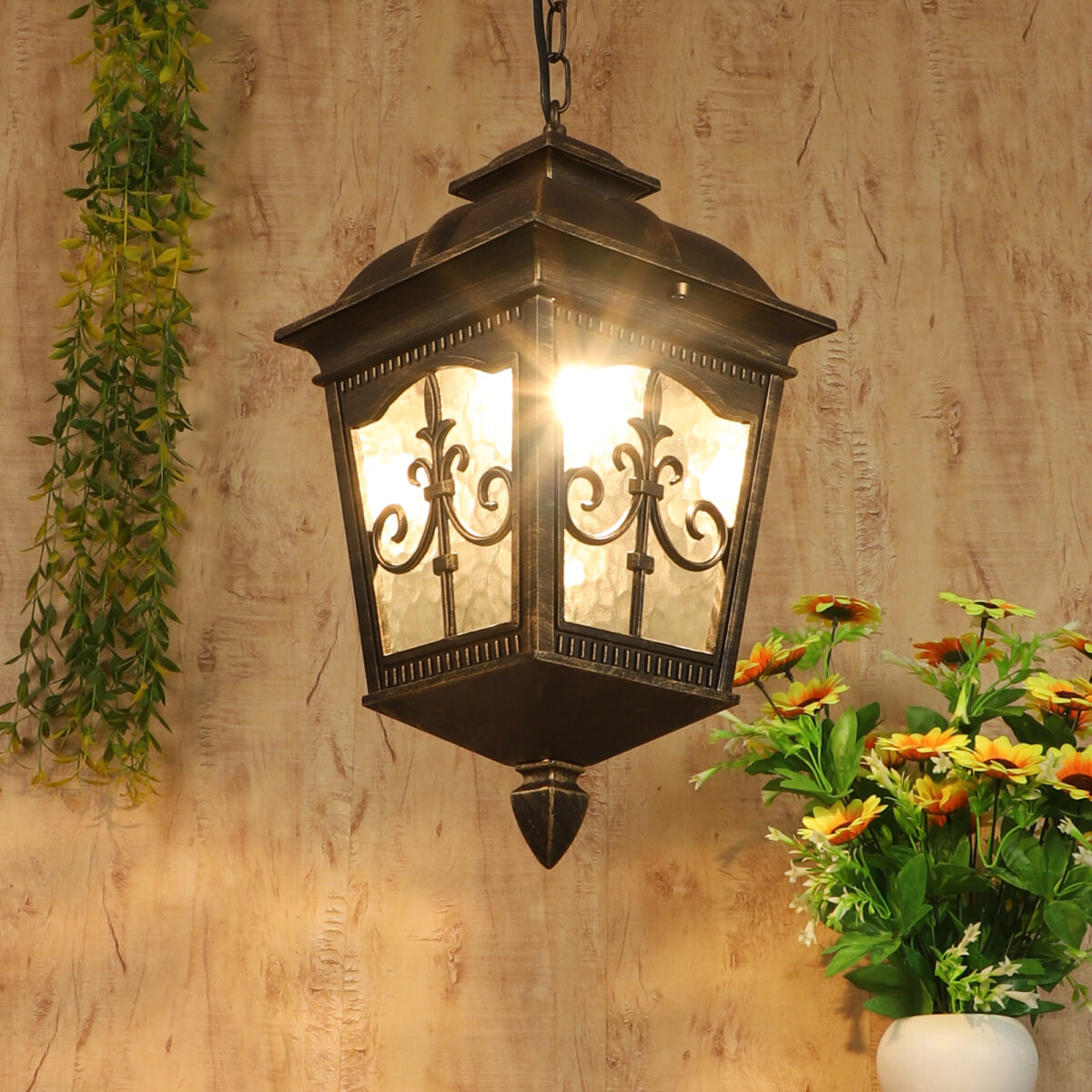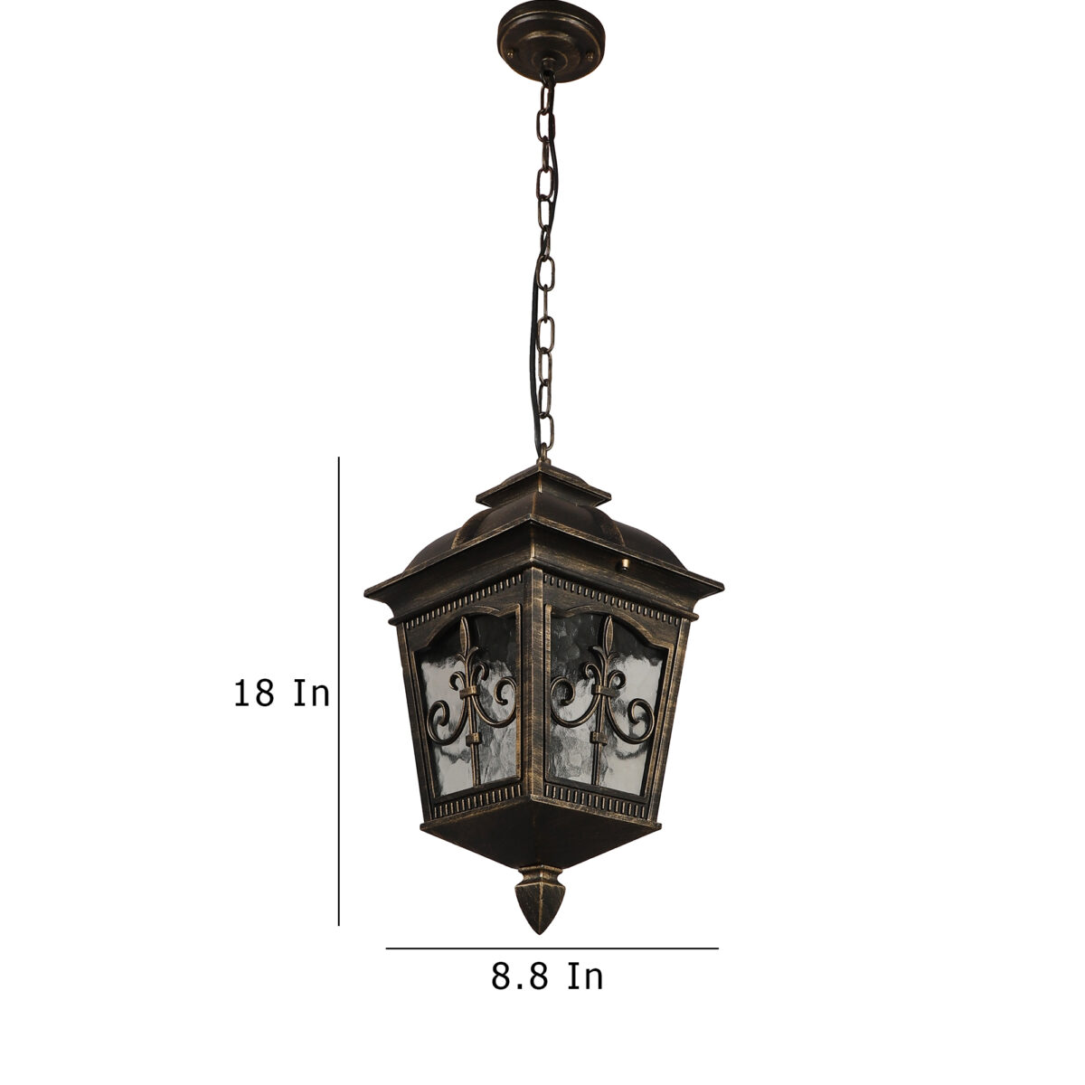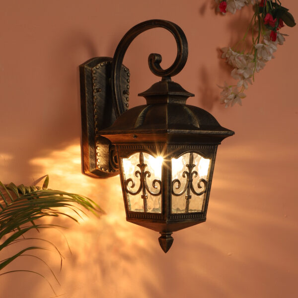 Vertical, premium, aluminium die cast, traditional outdoor hanging light in antique gold finish. It is maintenance free, comes with an B22 holder, only the change of lamp is required, which is available locally everywhere You can of course swap out the bulb for one that is dimmable, has a higher light output or a different color temperature. IP54 rated providing protection from sprayed water in any direction and making this light perfect for use outdoors, Application areas include Stair case, passage to staircase, terrace walls, terrace gardens, outdoor walls, boundary walls, open parking, stilt parking, basement parking, balcony , can also be installed indoors, also suits theme restaurants and bars, premium farm houses and party venues. LAMPS NOT INCLUDED.