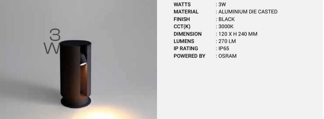SUPERSCAPE premium aluminium black finish 3 watt 9.5 inch IP65 path light 3K.