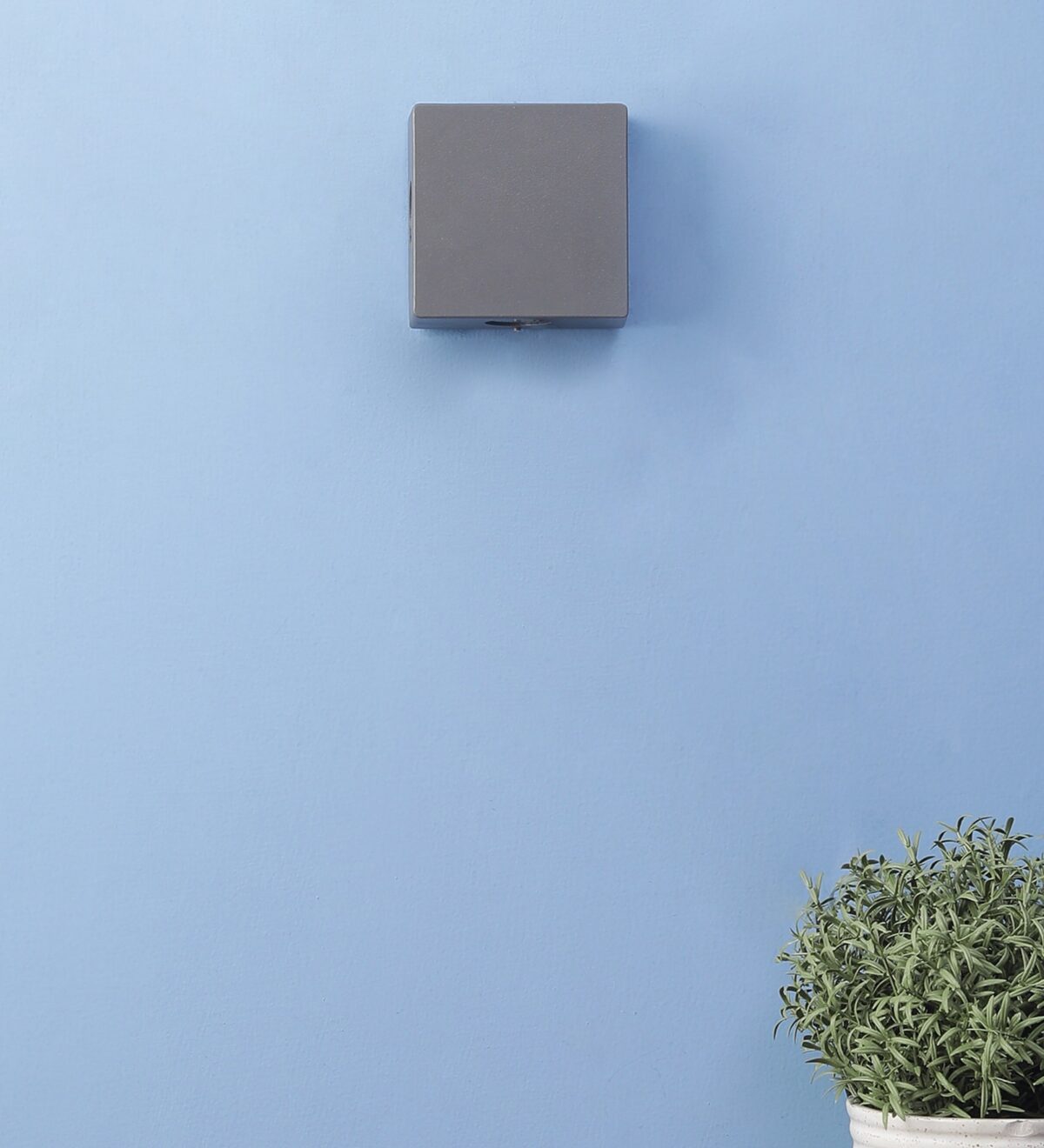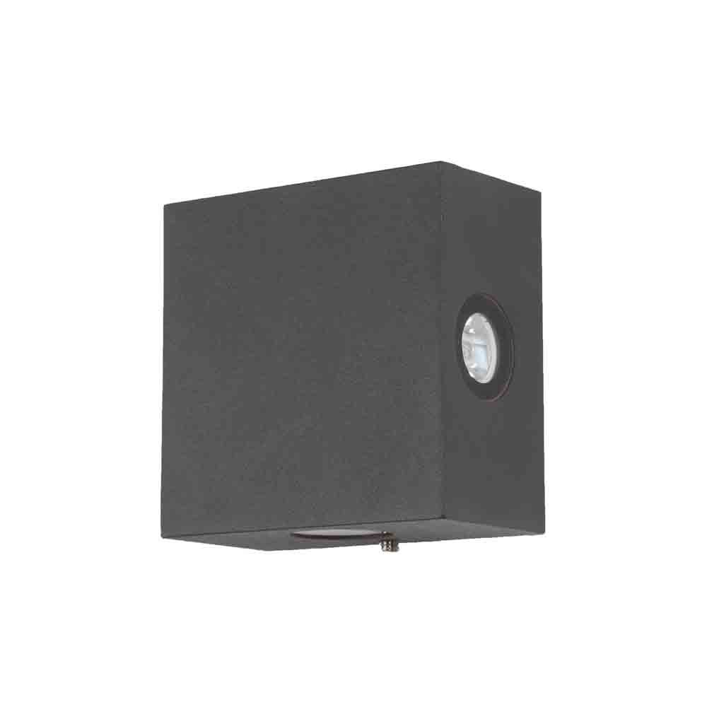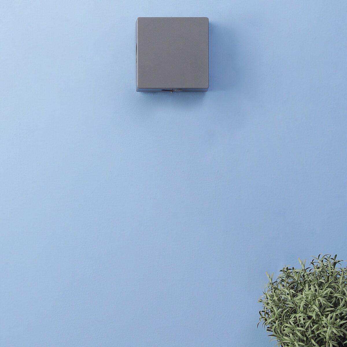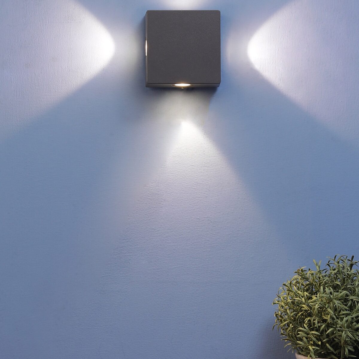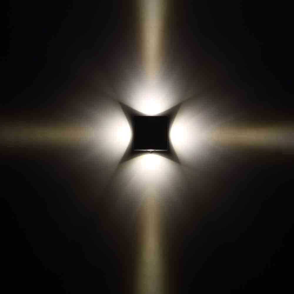 Square four way aluminum die cast outdoor wall light in gray finish using high quality LED and driver with high success rate having less than 0.5% replacement. Also available in one way, two way and three way design. It is a four way light providing light in all the four directions. This in combination with its variants is preferred by the lighting designers to create a lighting effect in a single wide wall, and multiple units are used to create the design. It can be used in both indoor and outdoor applications such as stair case walls, terrace walls, outdoor walls, boundary walls, open parking, stilt parking, basement parking, passage walls. IP54 rated. Protection against splashed water can be customized as per requirement for bulk quantities.