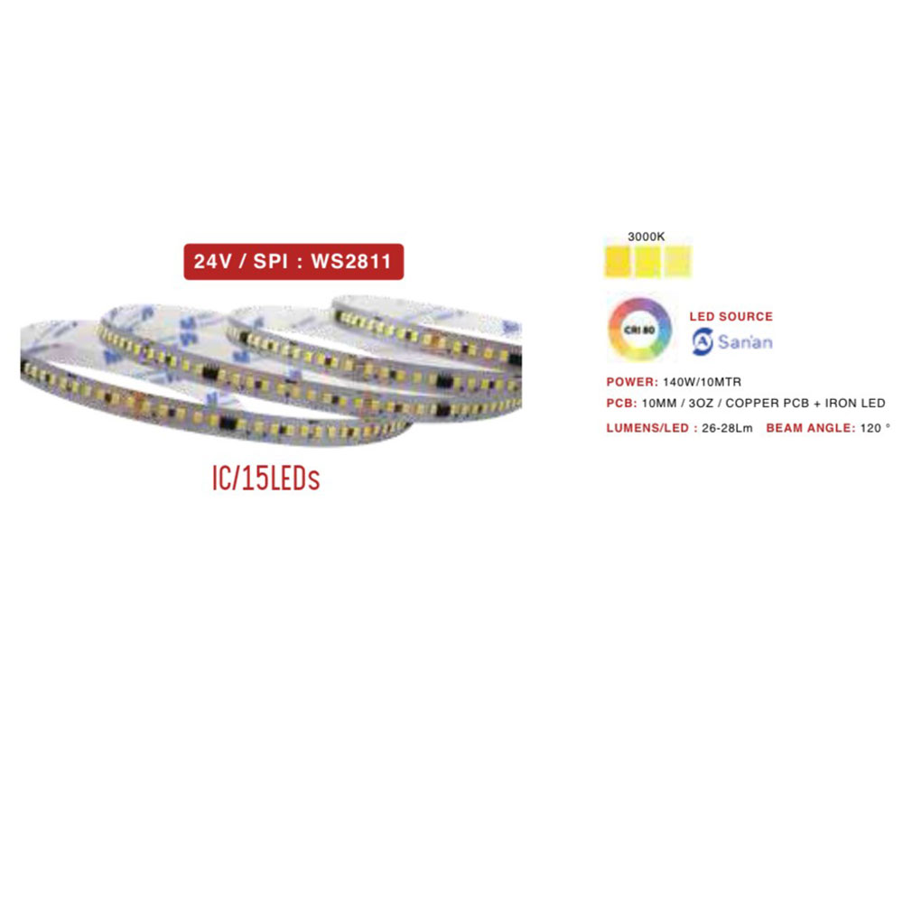 Ultra Premium 2835 24V 180 LED per meter strip 140 watt 10 mm programmable – SPI WS2811 digital series running water flow 10 meter roll without driver 3K.
