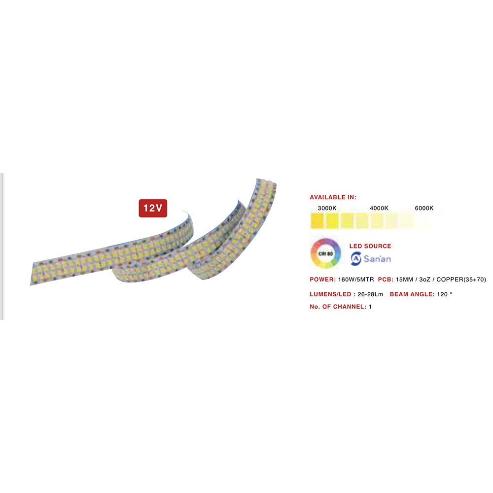 Ultra Premium 2835 LED strip 12V 480 LED (double) 32 watt per meter 15 mm weidth 5 meter roll without driver.