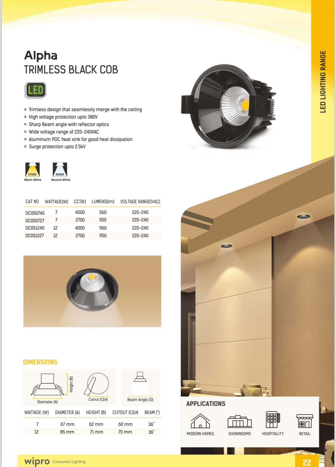 WIPRO GARNET TRIMLESS COB DC21227 12 WATT WARM WHITE YELLOW 2700K WP1335