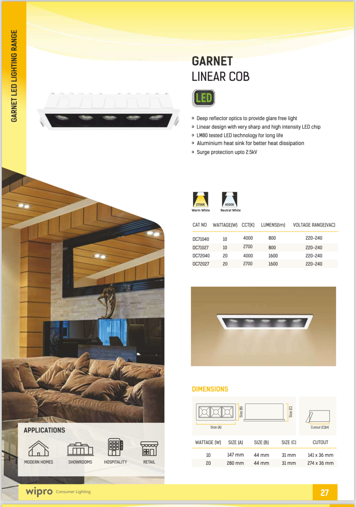 Wipro Garnet 20 watt Linear COB down light 2700K WP1346 Wipro Garnet 20 watt Linear COB down light 2700K WP1346 Original price was: ₹2,990.Current price is: ₹1,599. Inc. GST