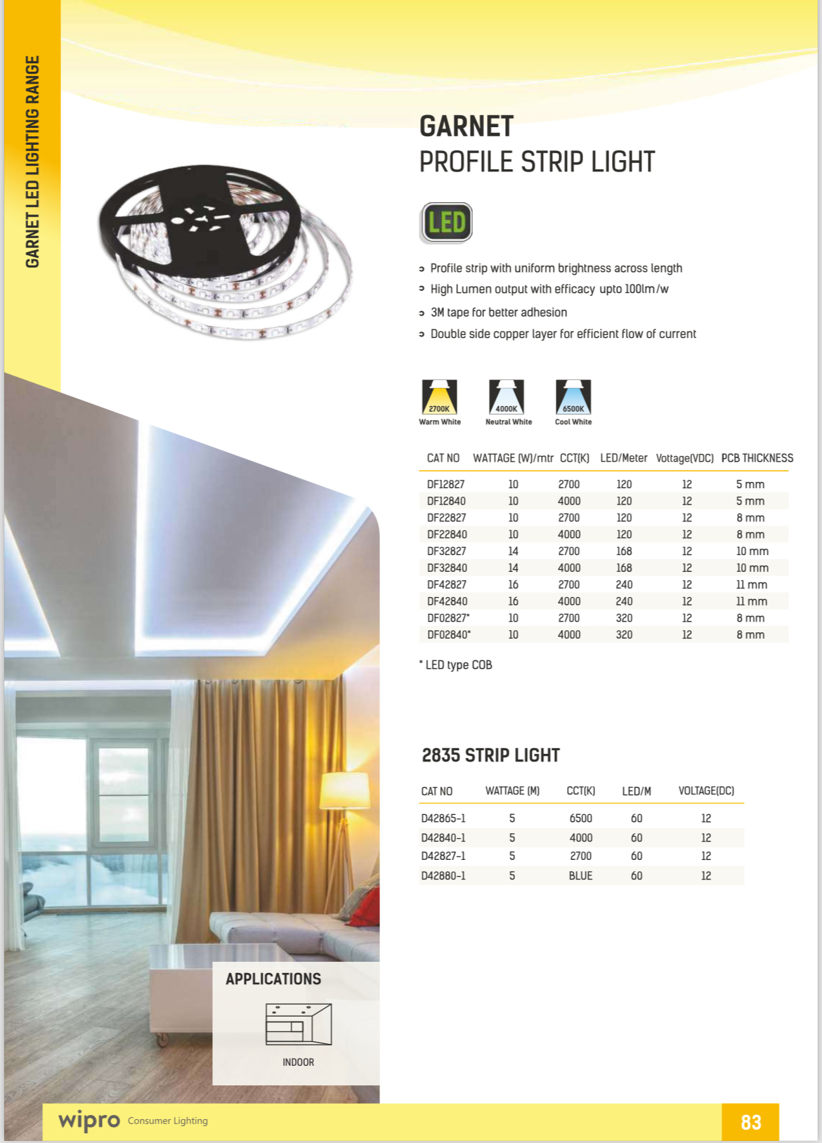 Wipro Garnet 2835 LED strip light 5 watt and 60 Led per meter 6500K without driver WP1503 Wipro Garnet 2835 LED strip light 5 watt and 60 Led per meter 6500K without driver WP1503 Original price was: ₹900.Current price is: ₹460. Inc. GST