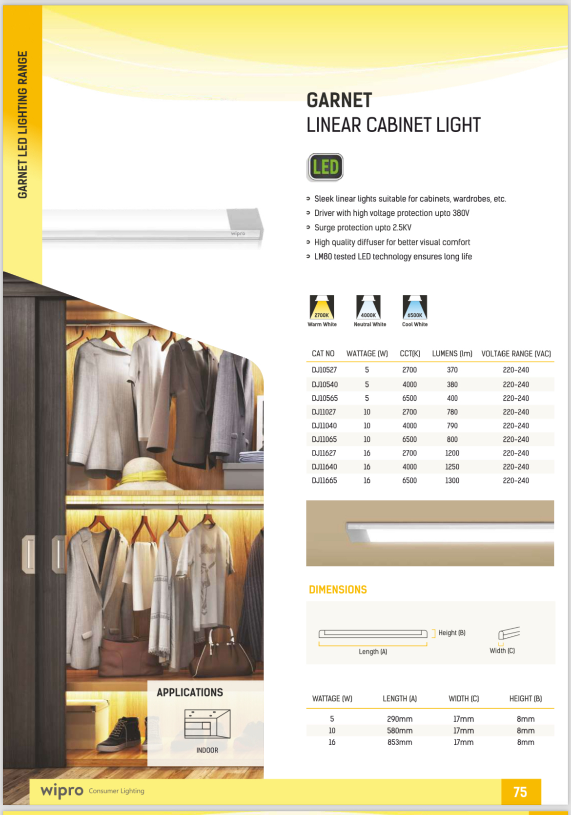 Wipro Garnet Linear cabinet light 2 feet 10 watt 6500K.